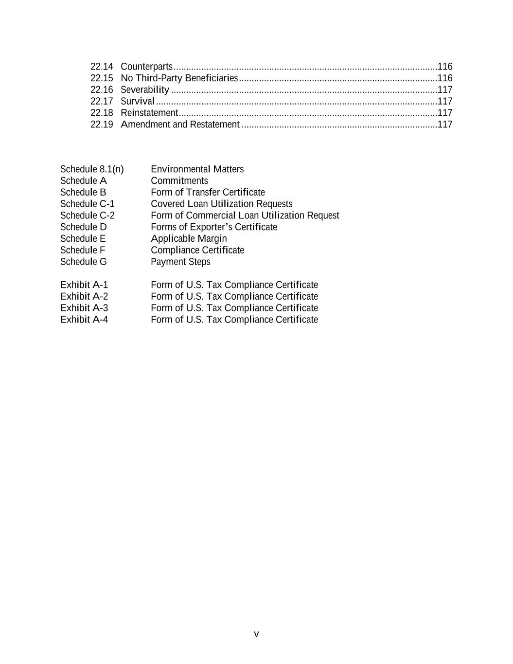 v 22.14 Counterparts .........................................................................................................116 22.15 No Third-Party Beneficiaries ...............................................................................116 22.16 Severability ..........................................................................................................117 22.17 Survival ................................................................................................................117 22.18 Reinstatement .......................................................................................................117 22.19 Amendment and Restatement ..............................................................................117 Schedule 8.1(n) Environmental Matters Schedule A Commitments Schedule B Form of Transfer Certificate Schedule C-1 Covered Loan Utilization Requests Schedule C-2 Form of Commercial Loan Utilization Request Schedule D Forms of Exporter’s Certificate Schedule E Applicable Margin Schedule F Compliance Certificate Schedule G Payment Steps Exhibit A-1 Form of U.S. Tax Compliance Certificate Exhibit A-2 Form of U.S. Tax Compliance Certificate Exhibit A-3 Form of U.S. Tax Compliance Certificate Exhibit A-4 Form of U.S. Tax Compliance Certificate