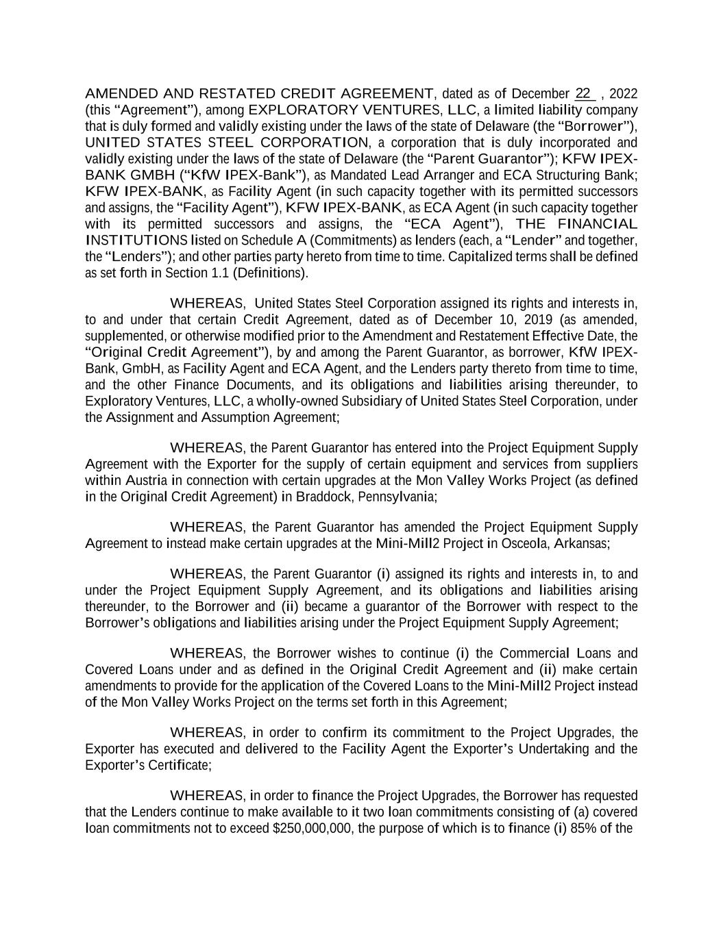 AMENDED AND RESTATED CREDIT AGREEMENT, dated as of December ___ , 2022 (this “Agreement”), among EXPLORATORY VENTURES, LLC, a limited liability company that is duly formed and validly existing under the laws of the state of Delaware (the “Borrower”), UNITED STATES STEEL CORPORATION, a corporation that is duly incorporated and validly existing under the laws of the state of Delaware (the “Parent Guarantor”); KFW IPEX- BANK GMBH (“KfW IPEX-Bank”), as Mandated Lead Arranger and ECA Structuring Bank; KFW IPEX-BANK, as Facility Agent (in such capacity together with its permitted successors and assigns, the “Facility Agent”), KFW IPEX-BANK, as ECA Agent (in such capacity together with its permitted successors and assigns, the “ECA Agent”), THE FINANCIAL INSTITUTIONS listed on Schedule A (Commitments) as lenders (each, a “Lender” and together, the “Lenders”); and other parties party hereto from time to time. Capitalized terms shall be defined as set forth in Section 1.1 (Definitions). WHEREAS, United States Steel Corporation assigned its rights and interests in, to and under that certain Credit Agreement, dated as of December 10, 2019 (as amended, supplemented, or otherwise modified prior to the Amendment and Restatement Effective Date, the “Original Credit Agreement”), by and among the Parent Guarantor, as borrower, KfW IPEX- Bank, GmbH, as Facility Agent and ECA Agent, and the Lenders party thereto from time to time, and the other Finance Documents, and its obligations and liabilities arising thereunder, to Exploratory Ventures, LLC, a wholly-owned Subsidiary of United States Steel Corporation, under the Assignment and Assumption Agreement; WHEREAS, the Parent Guarantor has entered into the Project Equipment Supply Agreement with the Exporter for the supply of certain equipment and services from suppliers within Austria in connection with certain upgrades at the Mon Valley Works Project (as defined in the Original Credit Agreement) in Braddock, Pennsylvania; WHEREAS, the Parent Guarantor has amended the Project Equipment Supply Agreement to instead make certain upgrades at the Mini-Mill2 Project in Osceola, Arkansas; WHEREAS, the Parent Guarantor (i) assigned its rights and interests in, to and under the Project Equipment Supply Agreement, and its obligations and liabilities arising thereunder, to the Borrower and (ii) became a guarantor of the Borrower with respect to the Borrower’s obligations and liabilities arising under the Project Equipment Supply Agreement; WHEREAS, the Borrower wishes to continue (i) the Commercial Loans and Covered Loans under and as defined in the Original Credit Agreement and (ii) make certain amendments to provide for the application of the Covered Loans to the Mini-Mill2 Project instead of the Mon Valley Works Project on the terms set forth in this Agreement; WHEREAS, in order to confirm its commitment to the Project Upgrades, the Exporter has executed and delivered to the Facility Agent the Exporter’s Undertaking and the Exporter’s Certificate; WHEREAS, in order to finance the Project Upgrades, the Borrower has requested that the Lenders continue to make available to it two loan commitments consisting of (a) covered loan commitments not to exceed $250,000,000, the purpose of which is to finance (i) 85% of the 22