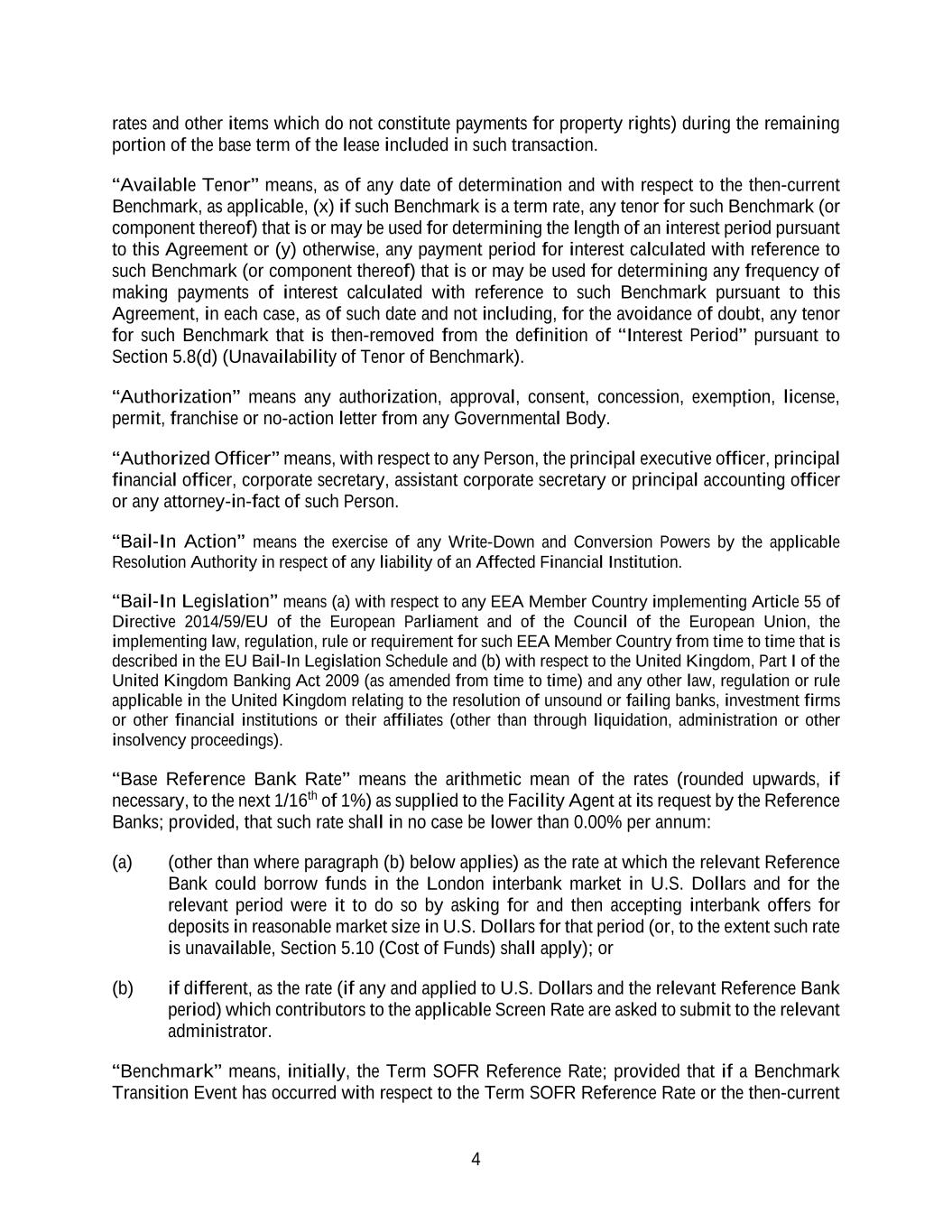 4 rates and other items which do not constitute payments for property rights) during the remaining portion of the base term of the lease included in such transaction. “Available Tenor” means, as of any date of determination and with respect to the then-current Benchmark, as applicable, (x) if such Benchmark is a term rate, any tenor for such Benchmark (or component thereof) that is or may be used for determining the length of an interest period pursuant to this Agreement or (y) otherwise, any payment period for interest calculated with reference to such Benchmark (or component thereof) that is or may be used for determining any frequency of making payments of interest calculated with reference to such Benchmark pursuant to this Agreement, in each case, as of such date and not including, for the avoidance of doubt, any tenor for such Benchmark that is then-removed from the definition of “Interest Period” pursuant to Section 5.8(d) (Unavailability of Tenor of Benchmark). “Authorization” means any authorization, approval, consent, concession, exemption, license, permit, franchise or no-action letter from any Governmental Body. “Authorized Officer” means, with respect to any Person, the principal executive officer, principal financial officer, corporate secretary, assistant corporate secretary or principal accounting officer or any attorney-in-fact of such Person. “Bail-In Action” means the exercise of any Write-Down and Conversion Powers by the applicable Resolution Authority in respect of any liability of an Affected Financial Institution. “Bail-In Legislation” means (a) with respect to any EEA Member Country implementing Article 55 of Directive 2014/59/EU of the European Parliament and of the Council of the European Union, the implementing law, regulation, rule or requirement for such EEA Member Country from time to time that is described in the EU Bail-In Legislation Schedule and (b) with respect to the United Kingdom, Part I of the United Kingdom Banking Act 2009 (as amended from time to time) and any other law, regulation or rule applicable in the United Kingdom relating to the resolution of unsound or failing banks, investment firms or other financial institutions or their affiliates (other than through liquidation, administration or other insolvency proceedings). “Base Reference Bank Rate” means the arithmetic mean of the rates (rounded upwards, if necessary, to the next 1/16th of 1%) as supplied to the Facility Agent at its request by the Reference Banks; provided, that such rate shall in no case be lower than 0.00% per annum: (a) (other than where paragraph (b) below applies) as the rate at which the relevant Reference Bank could borrow funds in the London interbank market in U.S. Dollars and for the relevant period were it to do so by asking for and then accepting interbank offers for deposits in reasonable market size in U.S. Dollars for that period (or, to the extent such rate is unavailable, Section 5.10 (Cost of Funds) shall apply); or (b) if different, as the rate (if any and applied to U.S. Dollars and the relevant Reference Bank period) which contributors to the applicable Screen Rate are asked to submit to the relevant administrator. “Benchmark” means, initially, the Term SOFR Reference Rate; provided that if a Benchmark Transition Event has occurred with respect to the Term SOFR Reference Rate or the then-current