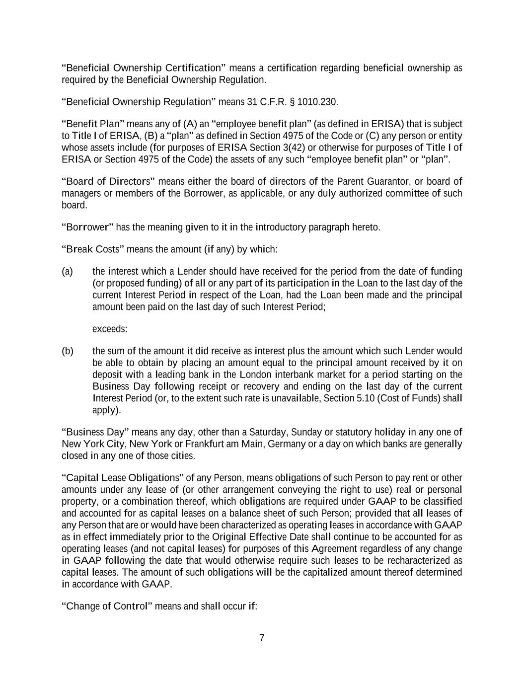 7 “Beneficial Ownership Certification” means a certification regarding beneficial ownership as required by the Beneficial Ownership Regulation. “Beneficial Ownership Regulation” means 31 C.F.R. § 1010.230. “Benefit Plan” means any of (A) an “employee benefit plan” (as defined in ERISA) that is subject to Title I of ERISA, (B) a “plan” as defined in Section 4975 of the Code or (C) any person or entity whose assets include (for purposes of ERISA Section 3(42) or otherwise for purposes of Title I of ERISA or Section 4975 of the Code) the assets of any such “employee benefit plan” or “plan”. “Board of Directors” means either the board of directors of the Parent Guarantor, or board of managers or members of the Borrower, as applicable, or any duly authorized committee of such board. “Borrower” has the meaning given to it in the introductory paragraph hereto. “Break Costs” means the amount (if any) by which: (a) the interest which a Lender should have received for the period from the date of funding (or proposed funding) of all or any part of its participation in the Loan to the last day of the current Interest Period in respect of the Loan, had the Loan been made and the principal amount been paid on the last day of such Interest Period; exceeds: (b) the sum of the amount it did receive as interest plus the amount which such Lender would be able to obtain by placing an amount equal to the principal amount received by it on deposit with a leading bank in the London interbank market for a period starting on the Business Day following receipt or recovery and ending on the last day of the current Interest Period (or, to the extent such rate is unavailable, Section 5.10 (Cost of Funds) shall apply). “Business Day” means any day, other than a Saturday, Sunday or statutory holiday in any one of New York City, New York or Frankfurt am Main, Germany or a day on which banks are generally closed in any one of those cities. “Capital Lease Obligations” of any Person, means obligations of such Person to pay rent or other amounts under any lease of (or other arrangement conveying the right to use) real or personal property, or a combination thereof, which obligations are required under GAAP to be classified and accounted for as capital leases on a balance sheet of such Person; provided that all leases of any Person that are or would have been characterized as operating leases in accordance with GAAP as in effect immediately prior to the Original Effective Date shall continue to be accounted for as operating leases (and not capital leases) for purposes of this Agreement regardless of any change in GAAP following the date that would otherwise require such leases to be recharacterized as capital leases. The amount of such obligations will be the capitalized amount thereof determined in accordance with GAAP. “Change of Control” means and shall occur if: