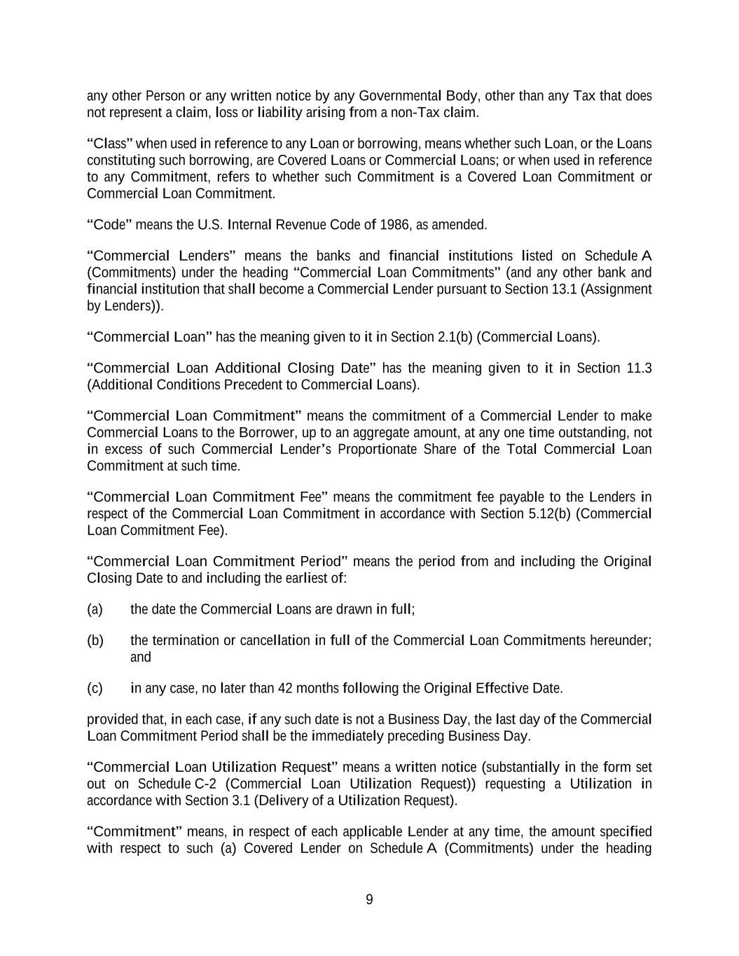 9 any other Person or any written notice by any Governmental Body, other than any Tax that does not represent a claim, loss or liability arising from a non-Tax claim. “Class” when used in reference to any Loan or borrowing, means whether such Loan, or the Loans constituting such borrowing, are Covered Loans or Commercial Loans; or when used in reference to any Commitment, refers to whether such Commitment is a Covered Loan Commitment or Commercial Loan Commitment. “Code” means the U.S. Internal Revenue Code of 1986, as amended. “Commercial Lenders” means the banks and financial institutions listed on Schedule A (Commitments) under the heading “Commercial Loan Commitments” (and any other bank and financial institution that shall become a Commercial Lender pursuant to Section 13.1 (Assignment by Lenders)). “Commercial Loan” has the meaning given to it in Section 2.1(b) (Commercial Loans). “Commercial Loan Additional Closing Date” has the meaning given to it in Section 11.3 (Additional Conditions Precedent to Commercial Loans). “Commercial Loan Commitment” means the commitment of a Commercial Lender to make Commercial Loans to the Borrower, up to an aggregate amount, at any one time outstanding, not in excess of such Commercial Lender’s Proportionate Share of the Total Commercial Loan Commitment at such time. “Commercial Loan Commitment Fee” means the commitment fee payable to the Lenders in respect of the Commercial Loan Commitment in accordance with Section 5.12(b) (Commercial Loan Commitment Fee). “Commercial Loan Commitment Period” means the period from and including the Original Closing Date to and including the earliest of: (a) the date the Commercial Loans are drawn in full; (b) the termination or cancellation in full of the Commercial Loan Commitments hereunder; and (c) in any case, no later than 42 months following the Original Effective Date. provided that, in each case, if any such date is not a Business Day, the last day of the Commercial Loan Commitment Period shall be the immediately preceding Business Day. “Commercial Loan Utilization Request” means a written notice (substantially in the form set out on Schedule C-2 (Commercial Loan Utilization Request)) requesting a Utilization in accordance with Section 3.1 (Delivery of a Utilization Request). “Commitment” means, in respect of each applicable Lender at any time, the amount specified with respect to such (a) Covered Lender on Schedule A (Commitments) under the heading