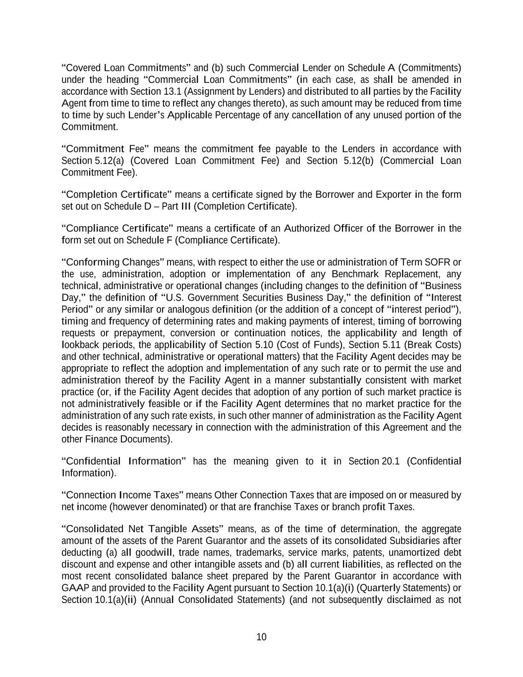 10 “Covered Loan Commitments” and (b) such Commercial Lender on Schedule A (Commitments) under the heading “Commercial Loan Commitments” (in each case, as shall be amended in accordance with Section 13.1 (Assignment by Lenders) and distributed to all parties by the Facility Agent from time to time to reflect any changes thereto), as such amount may be reduced from time to time by such Lender’s Applicable Percentage of any cancellation of any unused portion of the Commitment. “Commitment Fee” means the commitment fee payable to the Lenders in accordance with Section 5.12(a) (Covered Loan Commitment Fee) and Section 5.12(b) (Commercial Loan Commitment Fee). “Completion Certificate” means a certificate signed by the Borrower and Exporter in the form set out on Schedule D – Part III (Completion Certificate). “Compliance Certificate” means a certificate of an Authorized Officer of the Borrower in the form set out on Schedule F (Compliance Certificate). “Conforming Changes” means, with respect to either the use or administration of Term SOFR or the use, administration, adoption or implementation of any Benchmark Replacement, any technical, administrative or operational changes (including changes to the definition of “Business Day,” the definition of “U.S. Government Securities Business Day,” the definition of “Interest Period” or any similar or analogous definition (or the addition of a concept of “interest period”), timing and frequency of determining rates and making payments of interest, timing of borrowing requests or prepayment, conversion or continuation notices, the applicability and length of lookback periods, the applicability of Section 5.10 (Cost of Funds), Section 5.11 (Break Costs) and other technical, administrative or operational matters) that the Facility Agent decides may be appropriate to reflect the adoption and implementation of any such rate or to permit the use and administration thereof by the Facility Agent in a manner substantially consistent with market practice (or, if the Facility Agent decides that adoption of any portion of such market practice is not administratively feasible or if the Facility Agent determines that no market practice for the administration of any such rate exists, in such other manner of administration as the Facility Agent decides is reasonably necessary in connection with the administration of this Agreement and the other Finance Documents). “Confidential Information” has the meaning given to it in Section 20.1 (Confidential Information). “Connection Income Taxes” means Other Connection Taxes that are imposed on or measured by net income (however denominated) or that are franchise Taxes or branch profit Taxes. “Consolidated Net Tangible Assets” means, as of the time of determination, the aggregate amount of the assets of the Parent Guarantor and the assets of its consolidated Subsidiaries after deducting (a) all goodwill, trade names, trademarks, service marks, patents, unamortized debt discount and expense and other intangible assets and (b) all current liabilities, as reflected on the most recent consolidated balance sheet prepared by the Parent Guarantor in accordance with GAAP and provided to the Facility Agent pursuant to Section 10.1(a)(i) (Quarterly Statements) or Section 10.1(a)(ii) (Annual Consolidated Statements) (and not subsequently disclaimed as not