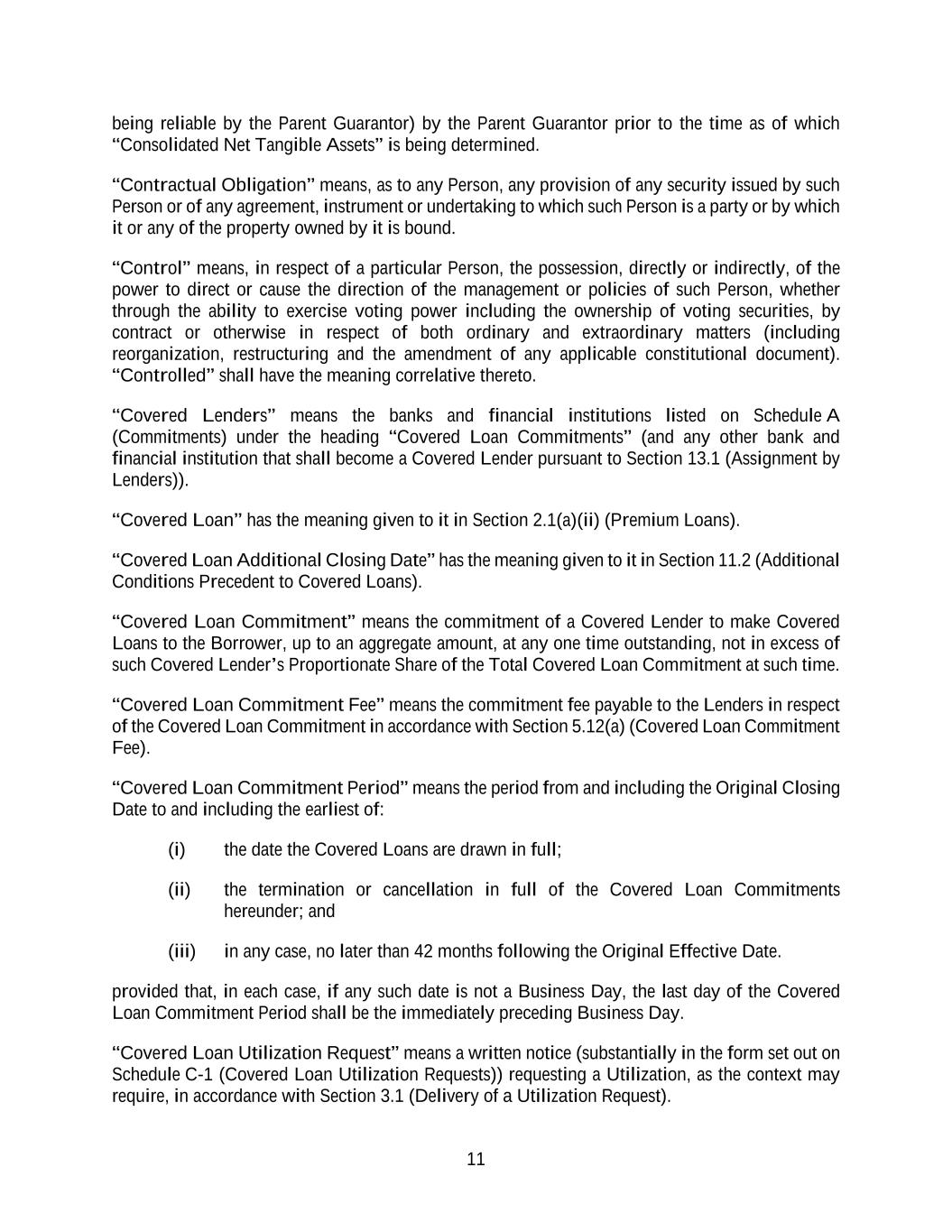 11 being reliable by the Parent Guarantor) by the Parent Guarantor prior to the time as of which “Consolidated Net Tangible Assets” is being determined. “Contractual Obligation” means, as to any Person, any provision of any security issued by such Person or of any agreement, instrument or undertaking to which such Person is a party or by which it or any of the property owned by it is bound. “Control” means, in respect of a particular Person, the possession, directly or indirectly, of the power to direct or cause the direction of the management or policies of such Person, whether through the ability to exercise voting power including the ownership of voting securities, by contract or otherwise in respect of both ordinary and extraordinary matters (including reorganization, restructuring and the amendment of any applicable constitutional document). “Controlled” shall have the meaning correlative thereto. “Covered Lenders” means the banks and financial institutions listed on Schedule A (Commitments) under the heading “Covered Loan Commitments” (and any other bank and financial institution that shall become a Covered Lender pursuant to Section 13.1 (Assignment by Lenders)). “Covered Loan” has the meaning given to it in Section 2.1(a)(ii) (Premium Loans). “Covered Loan Additional Closing Date” has the meaning given to it in Section 11.2 (Additional Conditions Precedent to Covered Loans). “Covered Loan Commitment” means the commitment of a Covered Lender to make Covered Loans to the Borrower, up to an aggregate amount, at any one time outstanding, not in excess of such Covered Lender’s Proportionate Share of the Total Covered Loan Commitment at such time. “Covered Loan Commitment Fee” means the commitment fee payable to the Lenders in respect of the Covered Loan Commitment in accordance with Section 5.12(a) (Covered Loan Commitment Fee). “Covered Loan Commitment Period” means the period from and including the Original Closing Date to and including the earliest of: (i) the date the Covered Loans are drawn in full; (ii) the termination or cancellation in full of the Covered Loan Commitments hereunder; and (iii) in any case, no later than 42 months following the Original Effective Date. provided that, in each case, if any such date is not a Business Day, the last day of the Covered Loan Commitment Period shall be the immediately preceding Business Day. “Covered Loan Utilization Request” means a written notice (substantially in the form set out on Schedule C-1 (Covered Loan Utilization Requests)) requesting a Utilization, as the context may require, in accordance with Section 3.1 (Delivery of a Utilization Request).