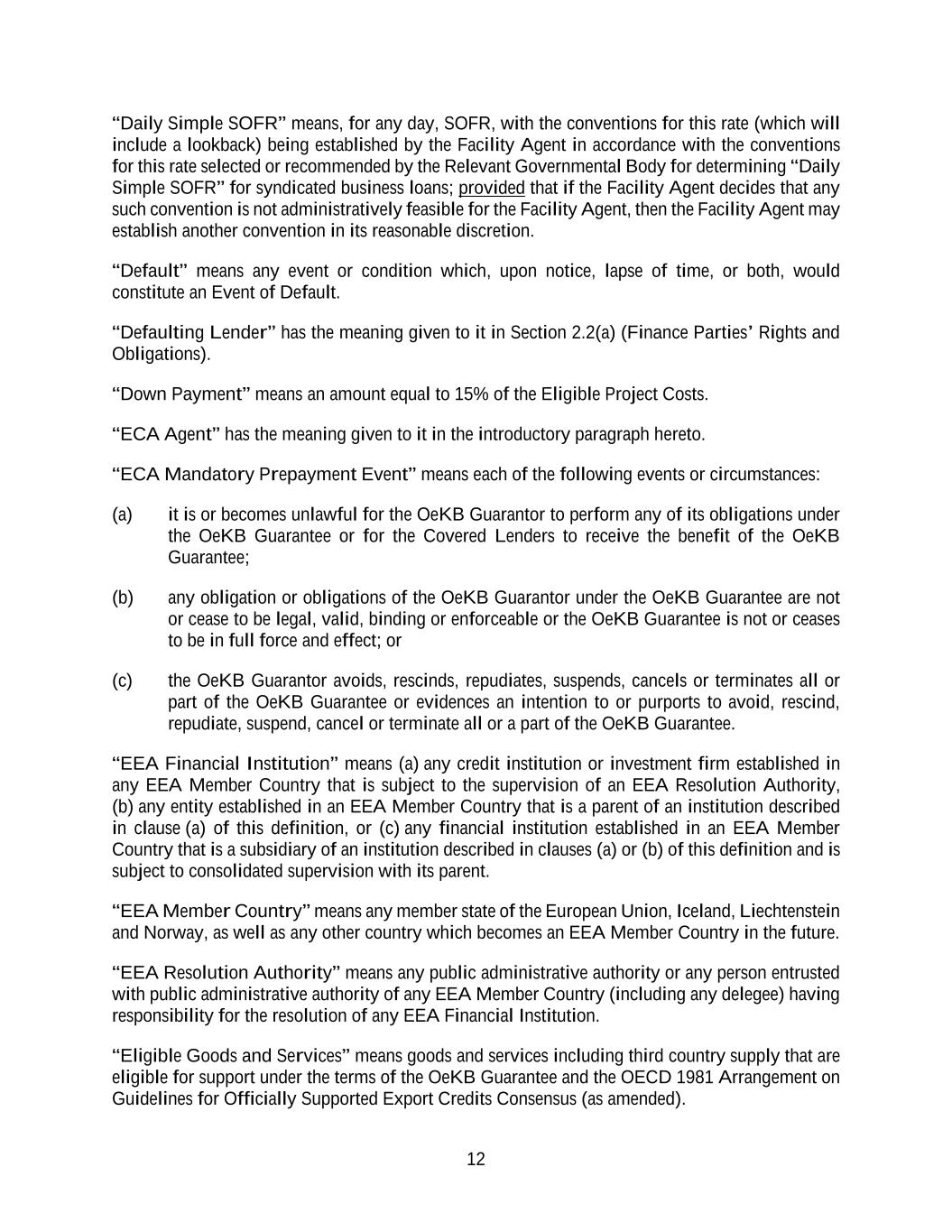 12 “Daily Simple SOFR” means, for any day, SOFR, with the conventions for this rate (which will include a lookback) being established by the Facility Agent in accordance with the conventions for this rate selected or recommended by the Relevant Governmental Body for determining “Daily Simple SOFR” for syndicated business loans; provided that if the Facility Agent decides that any such convention is not administratively feasible for the Facility Agent, then the Facility Agent may establish another convention in its reasonable discretion. “Default” means any event or condition which, upon notice, lapse of time, or both, would constitute an Event of Default. “Defaulting Lender” has the meaning given to it in Section 2.2(a) (Finance Parties’ Rights and Obligations). “Down Payment” means an amount equal to 15% of the Eligible Project Costs. “ECA Agent” has the meaning given to it in the introductory paragraph hereto. “ECA Mandatory Prepayment Event” means each of the following events or circumstances: (a) it is or becomes unlawful for the OeKB Guarantor to perform any of its obligations under the OeKB Guarantee or for the Covered Lenders to receive the benefit of the OeKB Guarantee; (b) any obligation or obligations of the OeKB Guarantor under the OeKB Guarantee are not or cease to be legal, valid, binding or enforceable or the OeKB Guarantee is not or ceases to be in full force and effect; or (c) the OeKB Guarantor avoids, rescinds, repudiates, suspends, cancels or terminates all or part of the OeKB Guarantee or evidences an intention to or purports to avoid, rescind, repudiate, suspend, cancel or terminate all or a part of the OeKB Guarantee. “EEA Financial Institution” means (a) any credit institution or investment firm established in any EEA Member Country that is subject to the supervision of an EEA Resolution Authority, (b) any entity established in an EEA Member Country that is a parent of an institution described in clause (a) of this definition, or (c) any financial institution established in an EEA Member Country that is a subsidiary of an institution described in clauses (a) or (b) of this definition and is subject to consolidated supervision with its parent. “EEA Member Country” means any member state of the European Union, Iceland, Liechtenstein and Norway, as well as any other country which becomes an EEA Member Country in the future. “EEA Resolution Authority” means any public administrative authority or any person entrusted with public administrative authority of any EEA Member Country (including any delegee) having responsibility for the resolution of any EEA Financial Institution. “Eligible Goods and Services” means goods and services including third country supply that are eligible for support under the terms of the OeKB Guarantee and the OECD 1981 Arrangement on Guidelines for Officially Supported Export Credits Consensus (as amended).