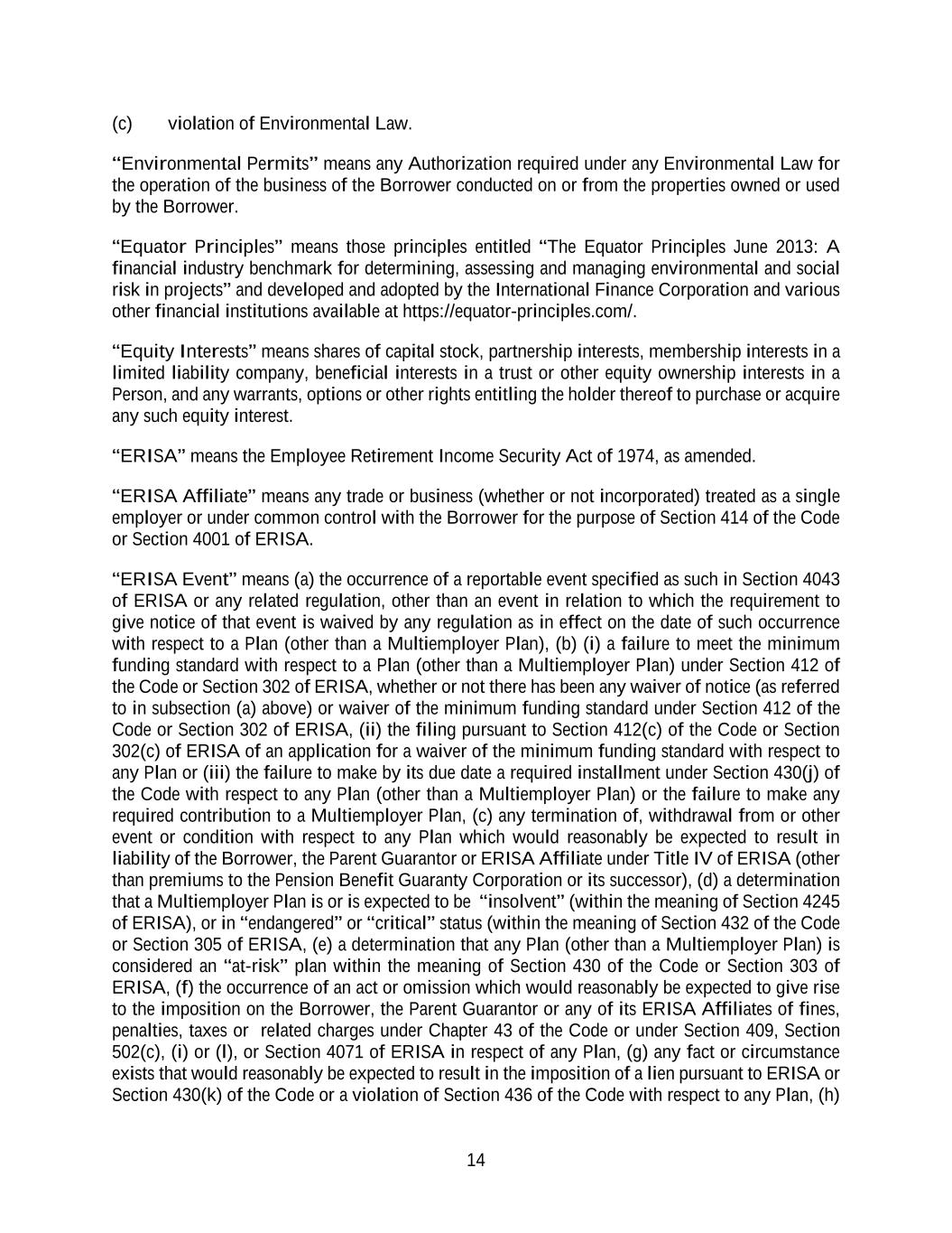 14 (c) violation of Environmental Law. “Environmental Permits” means any Authorization required under any Environmental Law for the operation of the business of the Borrower conducted on or from the properties owned or used by the Borrower. “Equator Principles” means those principles entitled “The Equator Principles June 2013: A financial industry benchmark for determining, assessing and managing environmental and social risk in projects” and developed and adopted by the International Finance Corporation and various other financial institutions available at https://equator-principles.com/. “Equity Interests” means shares of capital stock, partnership interests, membership interests in a limited liability company, beneficial interests in a trust or other equity ownership interests in a Person, and any warrants, options or other rights entitling the holder thereof to purchase or acquire any such equity interest. “ERISA” means the Employee Retirement Income Security Act of 1974, as amended. “ERISA Affiliate” means any trade or business (whether or not incorporated) treated as a single employer or under common control with the Borrower for the purpose of Section 414 of the Code or Section 4001 of ERISA. “ERISA Event” means (a) the occurrence of a reportable event specified as such in Section 4043 of ERISA or any related regulation, other than an event in relation to which the requirement to give notice of that event is waived by any regulation as in effect on the date of such occurrence with respect to a Plan (other than a Multiemployer Plan), (b) (i) a failure to meet the minimum funding standard with respect to a Plan (other than a Multiemployer Plan) under Section 412 of the Code or Section 302 of ERISA, whether or not there has been any waiver of notice (as referred to in subsection (a) above) or waiver of the minimum funding standard under Section 412 of the Code or Section 302 of ERISA, (ii) the filing pursuant to Section 412(c) of the Code or Section 302(c) of ERISA of an application for a waiver of the minimum funding standard with respect to any Plan or (iii) the failure to make by its due date a required installment under Section 430(j) of the Code with respect to any Plan (other than a Multiemployer Plan) or the failure to make any required contribution to a Multiemployer Plan, (c) any termination of, withdrawal from or other event or condition with respect to any Plan which would reasonably be expected to result in liability of the Borrower, the Parent Guarantor or ERISA Affiliate under Title IV of ERISA (other than premiums to the Pension Benefit Guaranty Corporation or its successor), (d) a determination that a Multiemployer Plan is or is expected to be “insolvent” (within the meaning of Section 4245 of ERISA), or in “endangered” or “critical” status (within the meaning of Section 432 of the Code or Section 305 of ERISA, (e) a determination that any Plan (other than a Multiemployer Plan) is considered an “at-risk” plan within the meaning of Section 430 of the Code or Section 303 of ERISA, (f) the occurrence of an act or omission which would reasonably be expected to give rise to the imposition on the Borrower, the Parent Guarantor or any of its ERISA Affiliates of fines, penalties, taxes or related charges under Chapter 43 of the Code or under Section 409, Section 502(c), (i) or (l), or Section 4071 of ERISA in respect of any Plan, (g) any fact or circumstance exists that would reasonably be expected to result in the imposition of a lien pursuant to ERISA or Section 430(k) of the Code or a violation of Section 436 of the Code with respect to any Plan, (h)