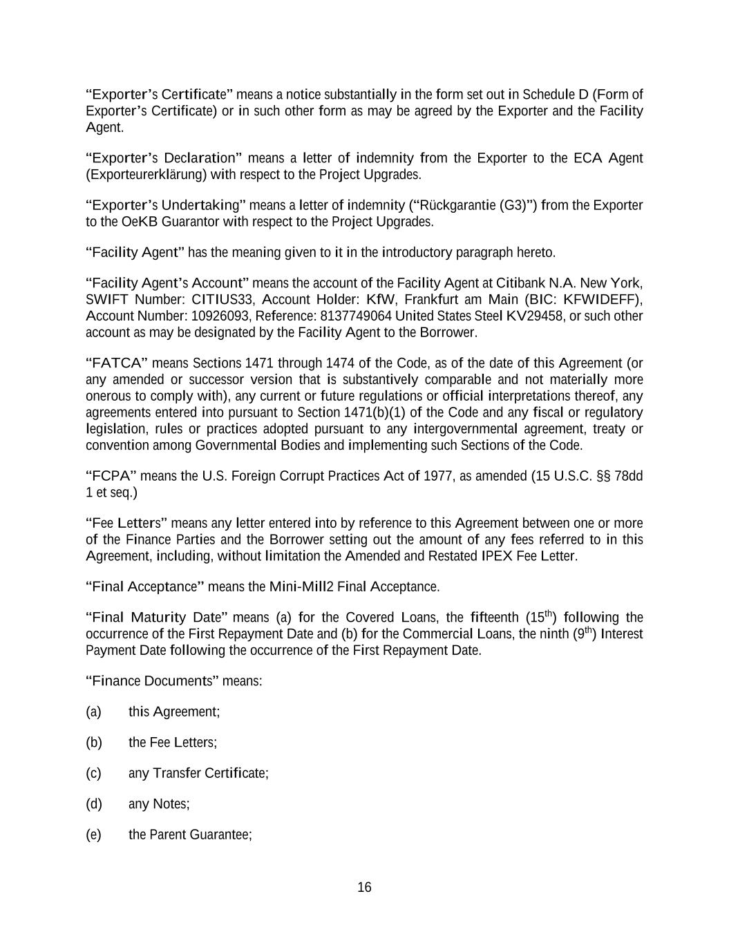 16 “Exporter’s Certificate” means a notice substantially in the form set out in Schedule D (Form of Exporter’s Certificate) or in such other form as may be agreed by the Exporter and the Facility Agent. “Exporter’s Declaration” means a letter of indemnity from the Exporter to the ECA Agent (Exporteurerklärung) with respect to the Project Upgrades. “Exporter’s Undertaking” means a letter of indemnity (“Rückgarantie (G3)”) from the Exporter to the OeKB Guarantor with respect to the Project Upgrades. “Facility Agent” has the meaning given to it in the introductory paragraph hereto. “Facility Agent’s Account” means the account of the Facility Agent at Citibank N.A. New York, SWIFT Number: CITIUS33, Account Holder: KfW, Frankfurt am Main (BIC: KFWIDEFF), Account Number: 10926093, Reference: 8137749064 United States Steel KV29458, or such other account as may be designated by the Facility Agent to the Borrower. “FATCA” means Sections 1471 through 1474 of the Code, as of the date of this Agreement (or any amended or successor version that is substantively comparable and not materially more onerous to comply with), any current or future regulations or official interpretations thereof, any agreements entered into pursuant to Section 1471(b)(1) of the Code and any fiscal or regulatory legislation, rules or practices adopted pursuant to any intergovernmental agreement, treaty or convention among Governmental Bodies and implementing such Sections of the Code. “FCPA” means the U.S. Foreign Corrupt Practices Act of 1977, as amended (15 U.S.C. §§ 78dd 1 et seq.) “Fee Letters” means any letter entered into by reference to this Agreement between one or more of the Finance Parties and the Borrower setting out the amount of any fees referred to in this Agreement, including, without limitation the Amended and Restated IPEX Fee Letter. “Final Acceptance” means the Mini-Mill2 Final Acceptance. “Final Maturity Date” means (a) for the Covered Loans, the fifteenth (15th) following the occurrence of the First Repayment Date and (b) for the Commercial Loans, the ninth (9th) Interest Payment Date following the occurrence of the First Repayment Date. “Finance Documents” means: (a) this Agreement; (b) the Fee Letters; (c) any Transfer Certificate; (d) any Notes; (e) the Parent Guarantee;