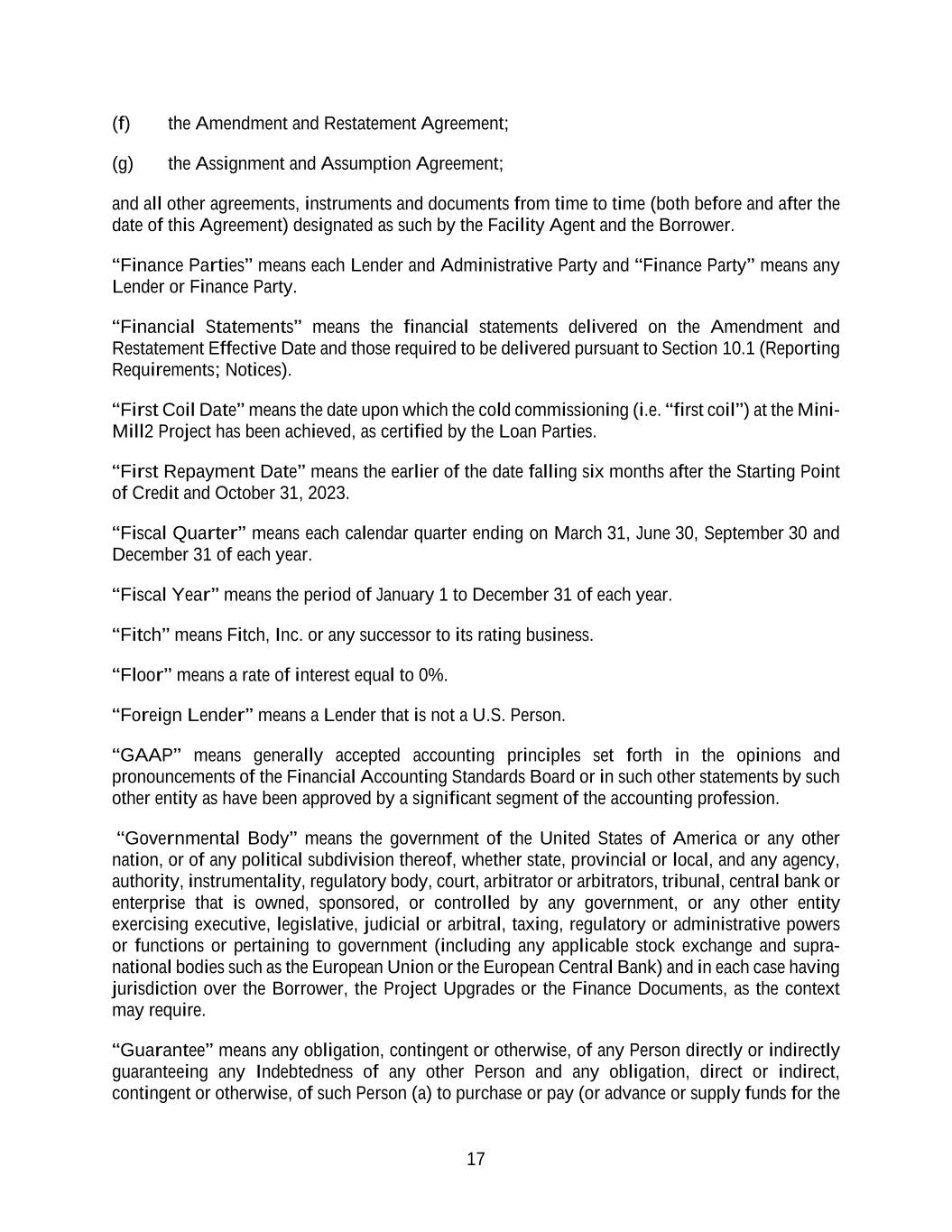 17 (f) the Amendment and Restatement Agreement; (g) the Assignment and Assumption Agreement; and all other agreements, instruments and documents from time to time (both before and after the date of this Agreement) designated as such by the Facility Agent and the Borrower. “Finance Parties” means each Lender and Administrative Party and “Finance Party” means any Lender or Finance Party. “Financial Statements” means the financial statements delivered on the Amendment and Restatement Effective Date and those required to be delivered pursuant to Section 10.1 (Reporting Requirements; Notices). “First Coil Date” means the date upon which the cold commissioning (i.e. “first coil”) at the Mini- Mill2 Project has been achieved, as certified by the Loan Parties. “First Repayment Date” means the earlier of the date falling six months after the Starting Point of Credit and October 31, 2023. “Fiscal Quarter” means each calendar quarter ending on March 31, June 30, September 30 and December 31 of each year. “Fiscal Year” means the period of January 1 to December 31 of each year. “Fitch” means Fitch, Inc. or any successor to its rating business. “Floor” means a rate of interest equal to 0%. “Foreign Lender” means a Lender that is not a U.S. Person. “GAAP” means generally accepted accounting principles set forth in the opinions and pronouncements of the Financial Accounting Standards Board or in such other statements by such other entity as have been approved by a significant segment of the accounting profession. “Governmental Body” means the government of the United States of America or any other nation, or of any political subdivision thereof, whether state, provincial or local, and any agency, authority, instrumentality, regulatory body, court, arbitrator or arbitrators, tribunal, central bank or enterprise that is owned, sponsored, or controlled by any government, or any other entity exercising executive, legislative, judicial or arbitral, taxing, regulatory or administrative powers or functions or pertaining to government (including any applicable stock exchange and supra- national bodies such as the European Union or the European Central Bank) and in each case having jurisdiction over the Borrower, the Project Upgrades or the Finance Documents, as the context may require. “Guarantee” means any obligation, contingent or otherwise, of any Person directly or indirectly guaranteeing any Indebtedness of any other Person and any obligation, direct or indirect, contingent or otherwise, of such Person (a) to purchase or pay (or advance or supply funds for the