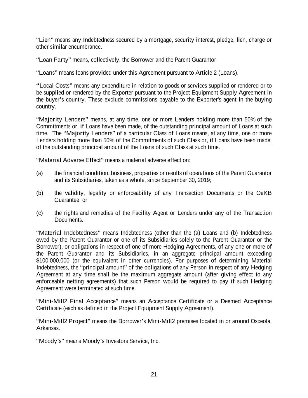 21 “Lien” means any Indebtedness secured by a mortgage, security interest, pledge, lien, charge or other similar encumbrance. “Loan Party” means, collectively, the Borrower and the Parent Guarantor. “Loans” means loans provided under this Agreement pursuant to Article 2 (Loans). “Local Costs” means any expenditure in relation to goods or services supplied or rendered or to be supplied or rendered by the Exporter pursuant to the Project Equipment Supply Agreement in the buyer’s country. These exclude commissions payable to the Exporter's agent in the buying country. “Majority Lenders” means, at any time, one or more Lenders holding more than 50% of the Commitments or, if Loans have been made, of the outstanding principal amount of Loans at such time. The “Majority Lenders” of a particular Class of Loans means, at any time, one or more Lenders holding more than 50% of the Commitments of such Class or, if Loans have been made, of the outstanding principal amount of the Loans of such Class at such time. “Material Adverse Effect” means a material adverse effect on: (a) the financial condition, business, properties or results of operations of the Parent Guarantor and its Subsidiaries, taken as a whole, since September 30, 2019; (b) the validity, legality or enforceability of any Transaction Documents or the OeKB Guarantee; or (c) the rights and remedies of the Facility Agent or Lenders under any of the Transaction Documents. “Material Indebtedness” means Indebtedness (other than the (a) Loans and (b) Indebtedness owed by the Parent Guarantor or one of its Subsidiaries solely to the Parent Guarantor or the Borrower), or obligations in respect of one of more Hedging Agreements, of any one or more of the Parent Guarantor and its Subsidiaries, in an aggregate principal amount exceeding $100,000,000 (or the equivalent in other currencies). For purposes of determining Material Indebtedness, the “principal amount” of the obligations of any Person in respect of any Hedging Agreement at any time shall be the maximum aggregate amount (after giving effect to any enforceable netting agreements) that such Person would be required to pay if such Hedging Agreement were terminated at such time. “Mini-Mill2 Final Acceptance” means an Acceptance Certificate or a Deemed Acceptance Certificate (each as defined in the Project Equipment Supply Agreement). “Mini-Mill2 Project” means the Borrower’s Mini-Mill2 premises located in or around Osceola, Arkansas. “Moody’s” means Moody’s Investors Service, Inc.