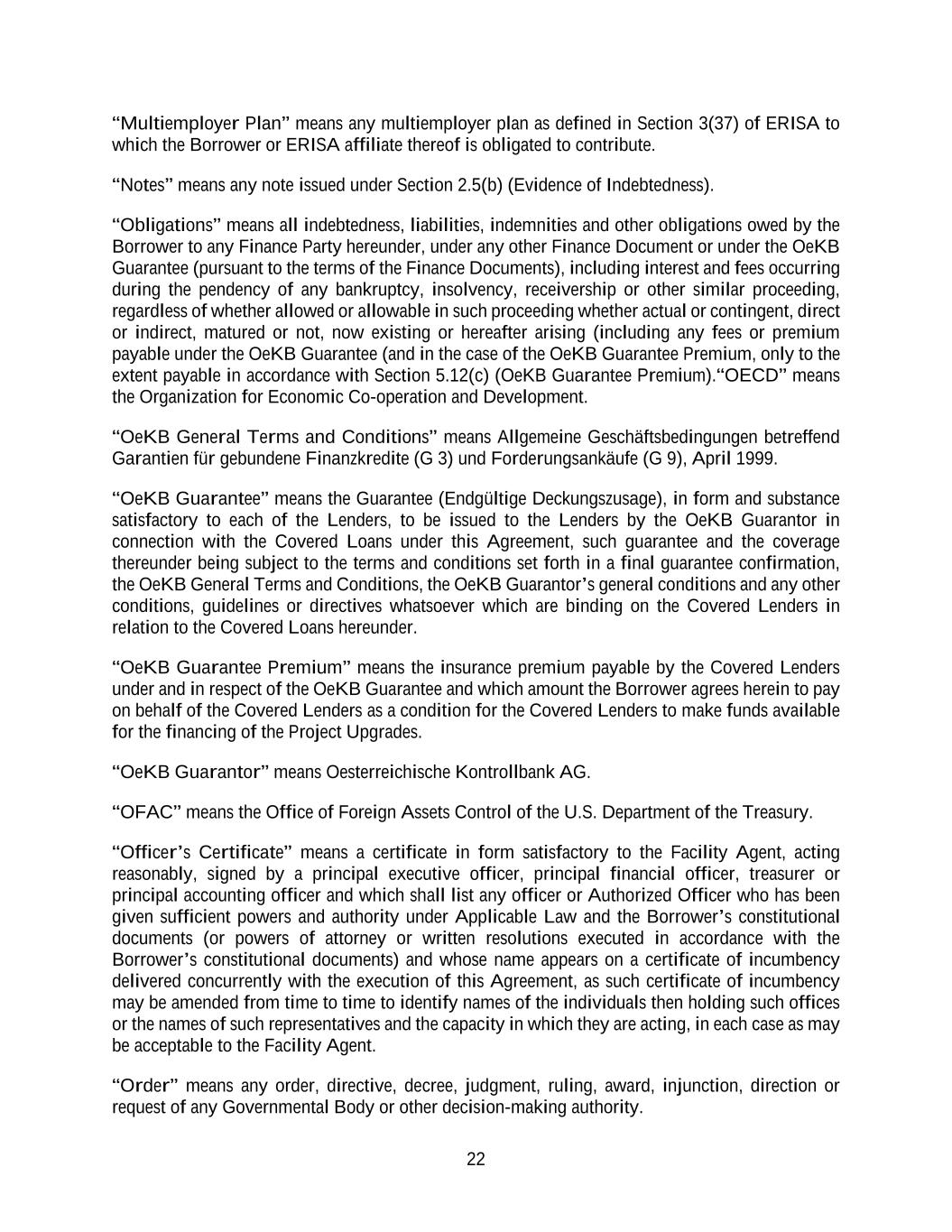 22 “Multiemployer Plan” means any multiemployer plan as defined in Section 3(37) of ERISA to which the Borrower or ERISA affiliate thereof is obligated to contribute. “Notes” means any note issued under Section 2.5(b) (Evidence of Indebtedness). “Obligations” means all indebtedness, liabilities, indemnities and other obligations owed by the Borrower to any Finance Party hereunder, under any other Finance Document or under the OeKB Guarantee (pursuant to the terms of the Finance Documents), including interest and fees occurring during the pendency of any bankruptcy, insolvency, receivership or other similar proceeding, regardless of whether allowed or allowable in such proceeding whether actual or contingent, direct or indirect, matured or not, now existing or hereafter arising (including any fees or premium payable under the OeKB Guarantee (and in the case of the OeKB Guarantee Premium, only to the extent payable in accordance with Section 5.12(c) (OeKB Guarantee Premium).“OECD” means the Organization for Economic Co-operation and Development. “OeKB General Terms and Conditions” means Allgemeine Geschäftsbedingungen betreffend Garantien für gebundene Finanzkredite (G 3) und Forderungsankäufe (G 9), April 1999. “OeKB Guarantee” means the Guarantee (Endgültige Deckungszusage), in form and substance satisfactory to each of the Lenders, to be issued to the Lenders by the OeKB Guarantor in connection with the Covered Loans under this Agreement, such guarantee and the coverage thereunder being subject to the terms and conditions set forth in a final guarantee confirmation, the OeKB General Terms and Conditions, the OeKB Guarantor’s general conditions and any other conditions, guidelines or directives whatsoever which are binding on the Covered Lenders in relation to the Covered Loans hereunder. “OeKB Guarantee Premium” means the insurance premium payable by the Covered Lenders under and in respect of the OeKB Guarantee and which amount the Borrower agrees herein to pay on behalf of the Covered Lenders as a condition for the Covered Lenders to make funds available for the financing of the Project Upgrades. “OeKB Guarantor” means Oesterreichische Kontrollbank AG. “OFAC” means the Office of Foreign Assets Control of the U.S. Department of the Treasury. “Officer’s Certificate” means a certificate in form satisfactory to the Facility Agent, acting reasonably, signed by a principal executive officer, principal financial officer, treasurer or principal accounting officer and which shall list any officer or Authorized Officer who has been given sufficient powers and authority under Applicable Law and the Borrower’s constitutional documents (or powers of attorney or written resolutions executed in accordance with the Borrower’s constitutional documents) and whose name appears on a certificate of incumbency delivered concurrently with the execution of this Agreement, as such certificate of incumbency may be amended from time to time to identify names of the individuals then holding such offices or the names of such representatives and the capacity in which they are acting, in each case as may be acceptable to the Facility Agent. “Order” means any order, directive, decree, judgment, ruling, award, injunction, direction or request of any Governmental Body or other decision-making authority.
