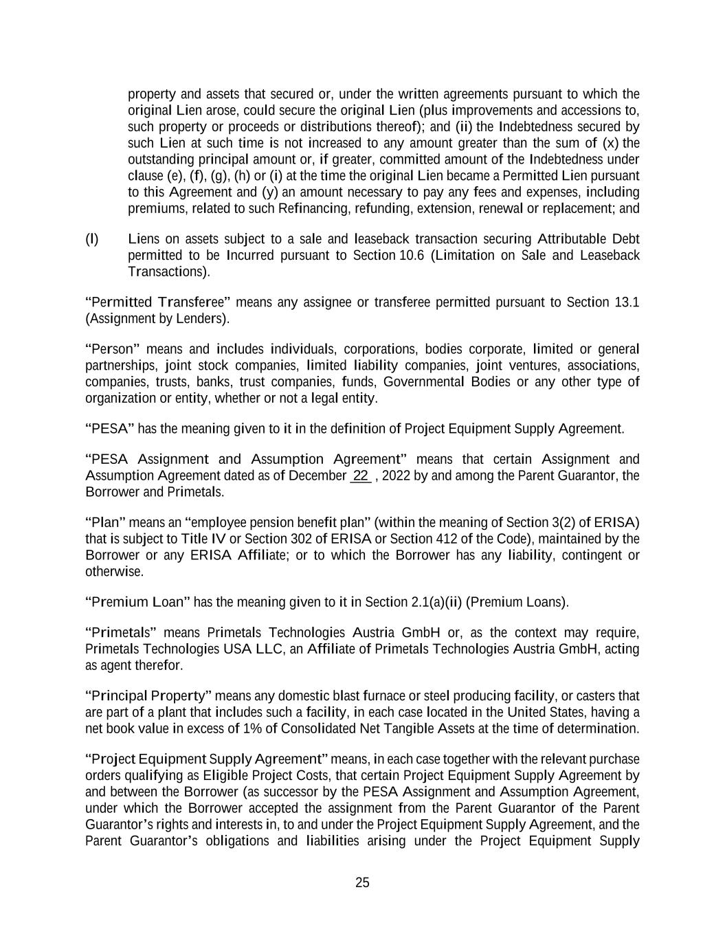 25 property and assets that secured or, under the written agreements pursuant to which the original Lien arose, could secure the original Lien (plus improvements and accessions to, such property or proceeds or distributions thereof); and (ii) the Indebtedness secured by such Lien at such time is not increased to any amount greater than the sum of (x) the outstanding principal amount or, if greater, committed amount of the Indebtedness under clause (e), (f), (g), (h) or (i) at the time the original Lien became a Permitted Lien pursuant to this Agreement and (y) an amount necessary to pay any fees and expenses, including premiums, related to such Refinancing, refunding, extension, renewal or replacement; and (l) Liens on assets subject to a sale and leaseback transaction securing Attributable Debt permitted to be Incurred pursuant to Section 10.6 (Limitation on Sale and Leaseback Transactions). “Permitted Transferee” means any assignee or transferee permitted pursuant to Section 13.1 (Assignment by Lenders). “Person” means and includes individuals, corporations, bodies corporate, limited or general partnerships, joint stock companies, limited liability companies, joint ventures, associations, companies, trusts, banks, trust companies, funds, Governmental Bodies or any other type of organization or entity, whether or not a legal entity. “PESA” has the meaning given to it in the definition of Project Equipment Supply Agreement. “PESA Assignment and Assumption Agreement” means that certain Assignment and Assumption Agreement dated as of December ___ , 2022 by and among the Parent Guarantor, the Borrower and Primetals. “Plan” means an “employee pension benefit plan” (within the meaning of Section 3(2) of ERISA) that is subject to Title IV or Section 302 of ERISA or Section 412 of the Code), maintained by the Borrower or any ERISA Affiliate; or to which the Borrower has any liability, contingent or otherwise. “Premium Loan” has the meaning given to it in Section 2.1(a)(ii) (Premium Loans). “Primetals” means Primetals Technologies Austria GmbH or, as the context may require, Primetals Technologies USA LLC, an Affiliate of Primetals Technologies Austria GmbH, acting as agent therefor. “Principal Property” means any domestic blast furnace or steel producing facility, or casters that are part of a plant that includes such a facility, in each case located in the United States, having a net book value in excess of 1% of Consolidated Net Tangible Assets at the time of determination. “Project Equipment Supply Agreement” means, in each case together with the relevant purchase orders qualifying as Eligible Project Costs, that certain Project Equipment Supply Agreement by and between the Borrower (as successor by the PESA Assignment and Assumption Agreement, under which the Borrower accepted the assignment from the Parent Guarantor of the Parent Guarantor’s rights and interests in, to and under the Project Equipment Supply Agreement, and the Parent Guarantor’s obligations and liabilities arising under the Project Equipment Supply 22