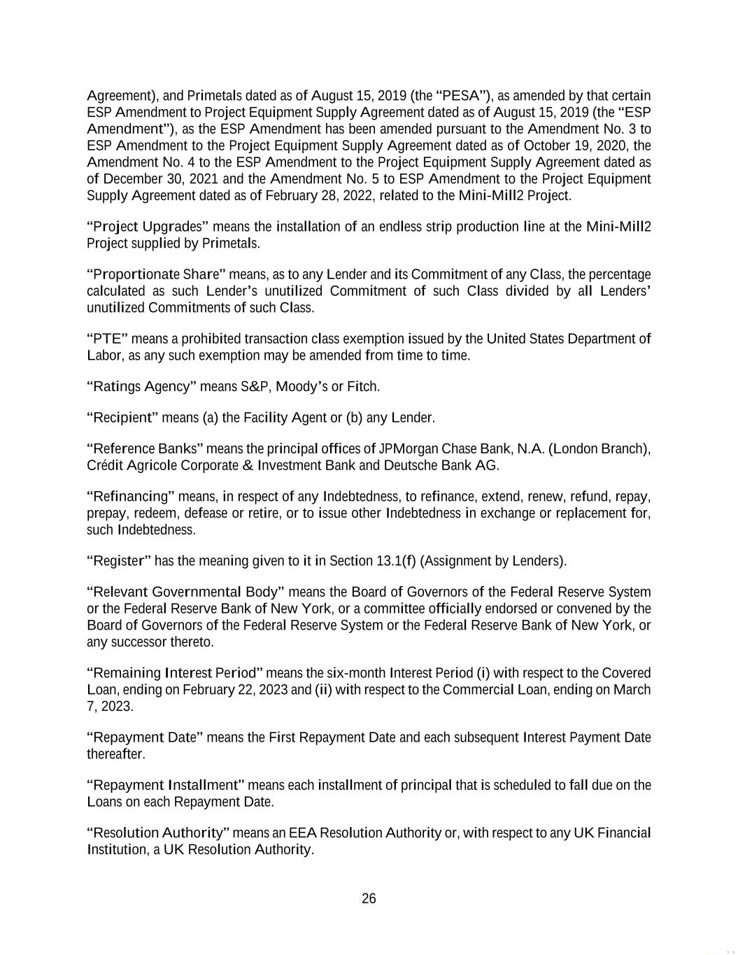 26 Agreement), and Primetals dated as of August 15, 2019 (the “PESA”), as amended by that certain ESP Amendment to Project Equipment Supply Agreement dated as of August 15, 2019 (the “ESP Amendment”), as the ESP Amendment has been amended pursuant to the Amendment No. 3 to ESP Amendment to the Project Equipment Supply Agreement dated as of October 19, 2020, the Amendment No. 4 to the ESP Amendment to the Project Equipment Supply Agreement dated as of December 30, 2021 and the Amendment No. 5 to ESP Amendment to the Project Equipment Supply Agreement dated as of February 28, 2022, related to the Mini-Mill2 Project. “Project Upgrades” means the installation of an endless strip production line at the Mini-Mill2 Project supplied by Primetals. “Proportionate Share” means, as to any Lender and its Commitment of any Class, the percentage calculated as such Lender’s unutilized Commitment of such Class divided by all Lenders’ unutilized Commitments of such Class. “PTE” means a prohibited transaction class exemption issued by the United States Department of Labor, as any such exemption may be amended from time to time. “Ratings Agency” means S&P, Moody’s or Fitch. “Recipient” means (a) the Facility Agent or (b) any Lender. “Reference Banks” means the principal offices of JPMorgan Chase Bank, N.A. (London Branch), Crédit Agricole Corporate & Investment Bank and Deutsche Bank AG. “Refinancing” means, in respect of any Indebtedness, to refinance, extend, renew, refund, repay, prepay, redeem, defease or retire, or to issue other Indebtedness in exchange or replacement for, such Indebtedness. “Register” has the meaning given to it in Section 13.1(f) (Assignment by Lenders). “Relevant Governmental Body” means the Board of Governors of the Federal Reserve System or the Federal Reserve Bank of New York, or a committee officially endorsed or convened by the Board of Governors of the Federal Reserve System or the Federal Reserve Bank of New York, or any successor thereto. “Remaining Interest Period” means the six-month Interest Period (i) with respect to the Covered Loan, ending on February 22, 2023 and (ii) with respect to the Commercial Loan, ending on March 7, 2023. “Repayment Date” means the First Repayment Date and each subsequent Interest Payment Date thereafter. “Repayment Installment” means each installment of principal that is scheduled to fall due on the Loans on each Repayment Date. “Resolution Authority” means an EEA Resolution Authority or, with respect to any UK Financial Institution, a UK Resolution Authority.