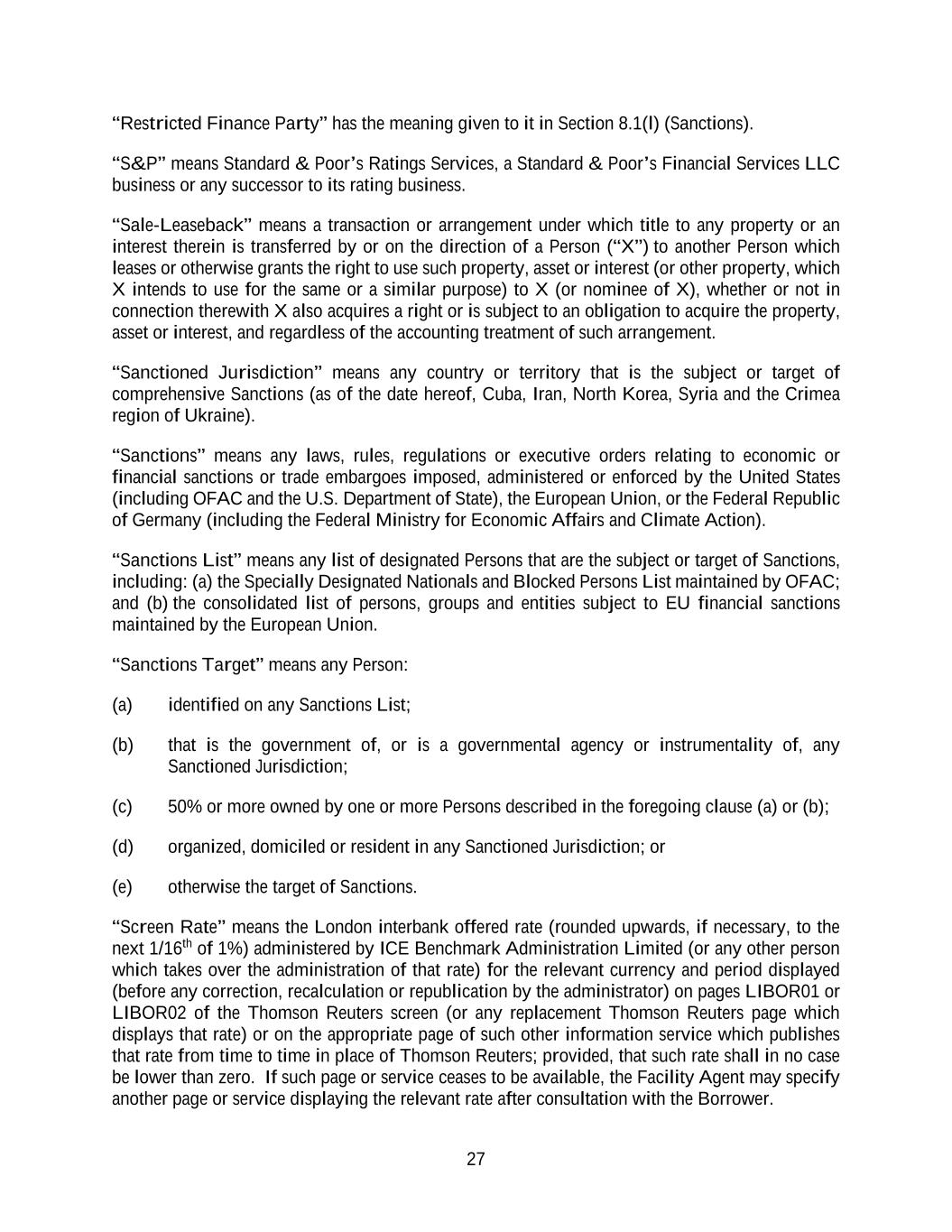 27 “Restricted Finance Party” has the meaning given to it in Section 8.1(l) (Sanctions). “S&P” means Standard & Poor’s Ratings Services, a Standard & Poor’s Financial Services LLC business or any successor to its rating business. “Sale-Leaseback” means a transaction or arrangement under which title to any property or an interest therein is transferred by or on the direction of a Person (“X”) to another Person which leases or otherwise grants the right to use such property, asset or interest (or other property, which X intends to use for the same or a similar purpose) to X (or nominee of X), whether or not in connection therewith X also acquires a right or is subject to an obligation to acquire the property, asset or interest, and regardless of the accounting treatment of such arrangement. “Sanctioned Jurisdiction” means any country or territory that is the subject or target of comprehensive Sanctions (as of the date hereof, Cuba, Iran, North Korea, Syria and the Crimea region of Ukraine). “Sanctions” means any laws, rules, regulations or executive orders relating to economic or financial sanctions or trade embargoes imposed, administered or enforced by the United States (including OFAC and the U.S. Department of State), the European Union, or the Federal Republic of Germany (including the Federal Ministry for Economic Affairs and Climate Action). “Sanctions List” means any list of designated Persons that are the subject or target of Sanctions, including: (a) the Specially Designated Nationals and Blocked Persons List maintained by OFAC; and (b) the consolidated list of persons, groups and entities subject to EU financial sanctions maintained by the European Union. “Sanctions Target” means any Person: (a) identified on any Sanctions List; (b) that is the government of, or is a governmental agency or instrumentality of, any Sanctioned Jurisdiction; (c) 50% or more owned by one or more Persons described in the foregoing clause (a) or (b); (d) organized, domiciled or resident in any Sanctioned Jurisdiction; or (e) otherwise the target of Sanctions. “Screen Rate” means the London interbank offered rate (rounded upwards, if necessary, to the next 1/16th of 1%) administered by ICE Benchmark Administration Limited (or any other person which takes over the administration of that rate) for the relevant currency and period displayed (before any correction, recalculation or republication by the administrator) on pages LIBOR01 or LIBOR02 of the Thomson Reuters screen (or any replacement Thomson Reuters page which displays that rate) or on the appropriate page of such other information service which publishes that rate from time to time in place of Thomson Reuters; provided, that such rate shall in no case be lower than zero. If such page or service ceases to be available, the Facility Agent may specify another page or service displaying the relevant rate after consultation with the Borrower.