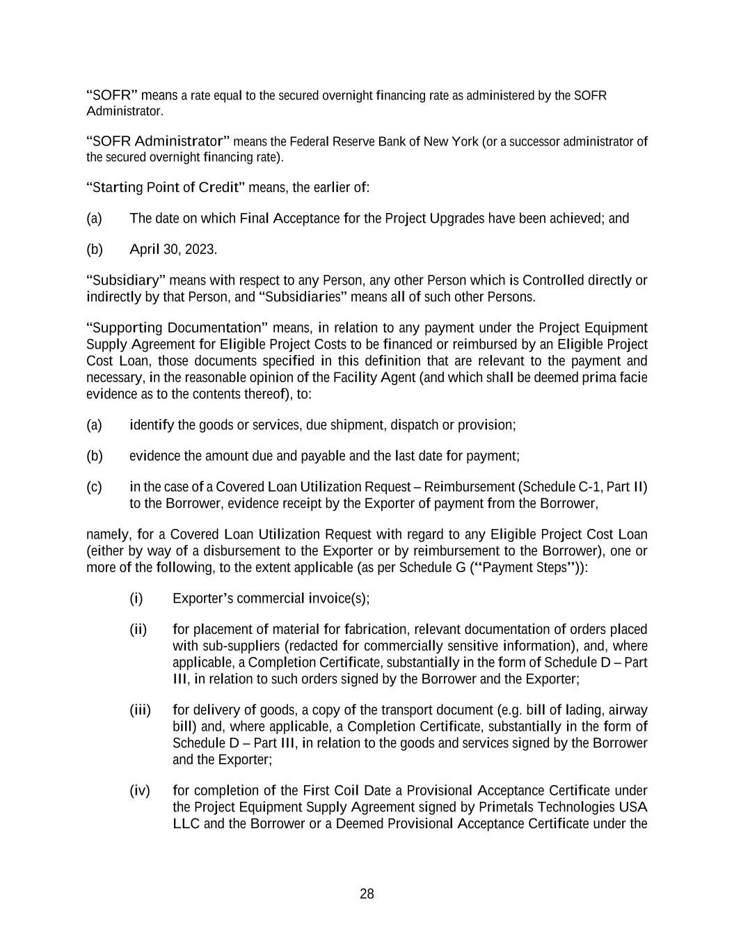 28 “SOFR” means a rate equal to the secured overnight financing rate as administered by the SOFR Administrator. “SOFR Administrator” means the Federal Reserve Bank of New York (or a successor administrator of the secured overnight financing rate). “Starting Point of Credit” means, the earlier of: (a) The date on which Final Acceptance for the Project Upgrades have been achieved; and (b) April 30, 2023. “Subsidiary” means with respect to any Person, any other Person which is Controlled directly or indirectly by that Person, and “Subsidiaries” means all of such other Persons. “Supporting Documentation” means, in relation to any payment under the Project Equipment Supply Agreement for Eligible Project Costs to be financed or reimbursed by an Eligible Project Cost Loan, those documents specified in this definition that are relevant to the payment and necessary, in the reasonable opinion of the Facility Agent (and which shall be deemed prima facie evidence as to the contents thereof), to: (a) identify the goods or services, due shipment, dispatch or provision; (b) evidence the amount due and payable and the last date for payment; (c) in the case of a Covered Loan Utilization Request – Reimbursement (Schedule C-1, Part II) to the Borrower, evidence receipt by the Exporter of payment from the Borrower, namely, for a Covered Loan Utilization Request with regard to any Eligible Project Cost Loan (either by way of a disbursement to the Exporter or by reimbursement to the Borrower), one or more of the following, to the extent applicable (as per Schedule G (“Payment Steps”)): (i) Exporter’s commercial invoice(s); (ii) for placement of material for fabrication, relevant documentation of orders placed with sub-suppliers (redacted for commercially sensitive information), and, where applicable, a Completion Certificate, substantially in the form of Schedule D – Part III, in relation to such orders signed by the Borrower and the Exporter; (iii) for delivery of goods, a copy of the transport document (e.g. bill of lading, airway bill) and, where applicable, a Completion Certificate, substantially in the form of Schedule D – Part III, in relation to the goods and services signed by the Borrower and the Exporter; (iv) for completion of the First Coil Date a Provisional Acceptance Certificate under the Project Equipment Supply Agreement signed by Primetals Technologies USA LLC and the Borrower or a Deemed Provisional Acceptance Certificate under the