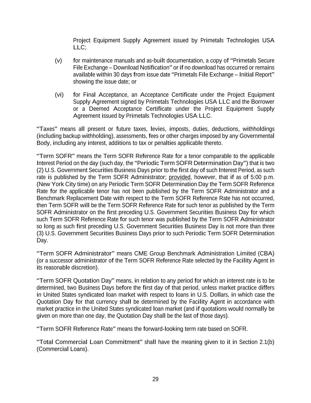 29 Project Equipment Supply Agreement issued by Primetals Technologies USA LLC; (v) for maintenance manuals and as-built documentation, a copy of “Primetals Secure File Exchange – Download Notification” or if no download has occurred or remains available within 30 days from issue date “Primetals File Exchange – Initial Report” showing the issue date; or (vi) for Final Acceptance, an Acceptance Certificate under the Project Equipment Supply Agreement signed by Primetals Technologies USA LLC and the Borrower or a Deemed Acceptance Certificate under the Project Equipment Supply Agreement issued by Primetals Technologies USA LLC. “Taxes” means all present or future taxes, levies, imposts, duties, deductions, withholdings (including backup withholding), assessments, fees or other charges imposed by any Governmental Body, including any interest, additions to tax or penalties applicable thereto. “Term SOFR” means the Term SOFR Reference Rate for a tenor comparable to the applicable Interest Period on the day (such day, the “Periodic Term SOFR Determination Day”) that is two (2) U.S. Government Securities Business Days prior to the first day of such Interest Period, as such rate is published by the Term SOFR Administrator; provided, however, that if as of 5:00 p.m. (New York City time) on any Periodic Term SOFR Determination Day the Term SOFR Reference Rate for the applicable tenor has not been published by the Term SOFR Administrator and a Benchmark Replacement Date with respect to the Term SOFR Reference Rate has not occurred, then Term SOFR will be the Term SOFR Reference Rate for such tenor as published by the Term SOFR Administrator on the first preceding U.S. Government Securities Business Day for which such Term SOFR Reference Rate for such tenor was published by the Term SOFR Administrator so long as such first preceding U.S. Government Securities Business Day is not more than three (3) U.S. Government Securities Business Days prior to such Periodic Term SOFR Determination Day. “Term SOFR Administrator” means CME Group Benchmark Administration Limited (CBA) (or a successor administrator of the Term SOFR Reference Rate selected by the Facility Agent in its reasonable discretion). “Term SOFR Quotation Day” means, in relation to any period for which an interest rate is to be determined, two Business Days before the first day of that period, unless market practice differs in United States syndicated loan market with respect to loans in U.S. Dollars, in which case the Quotation Day for that currency shall be determined by the Facility Agent in accordance with market practice in the United States syndicated loan market (and if quotations would normally be given on more than one day, the Quotation Day shall be the last of those days). “Term SOFR Reference Rate” means the forward-looking term rate based on SOFR. “Total Commercial Loan Commitment” shall have the meaning given to it in Section 2.1(b) (Commercial Loans).