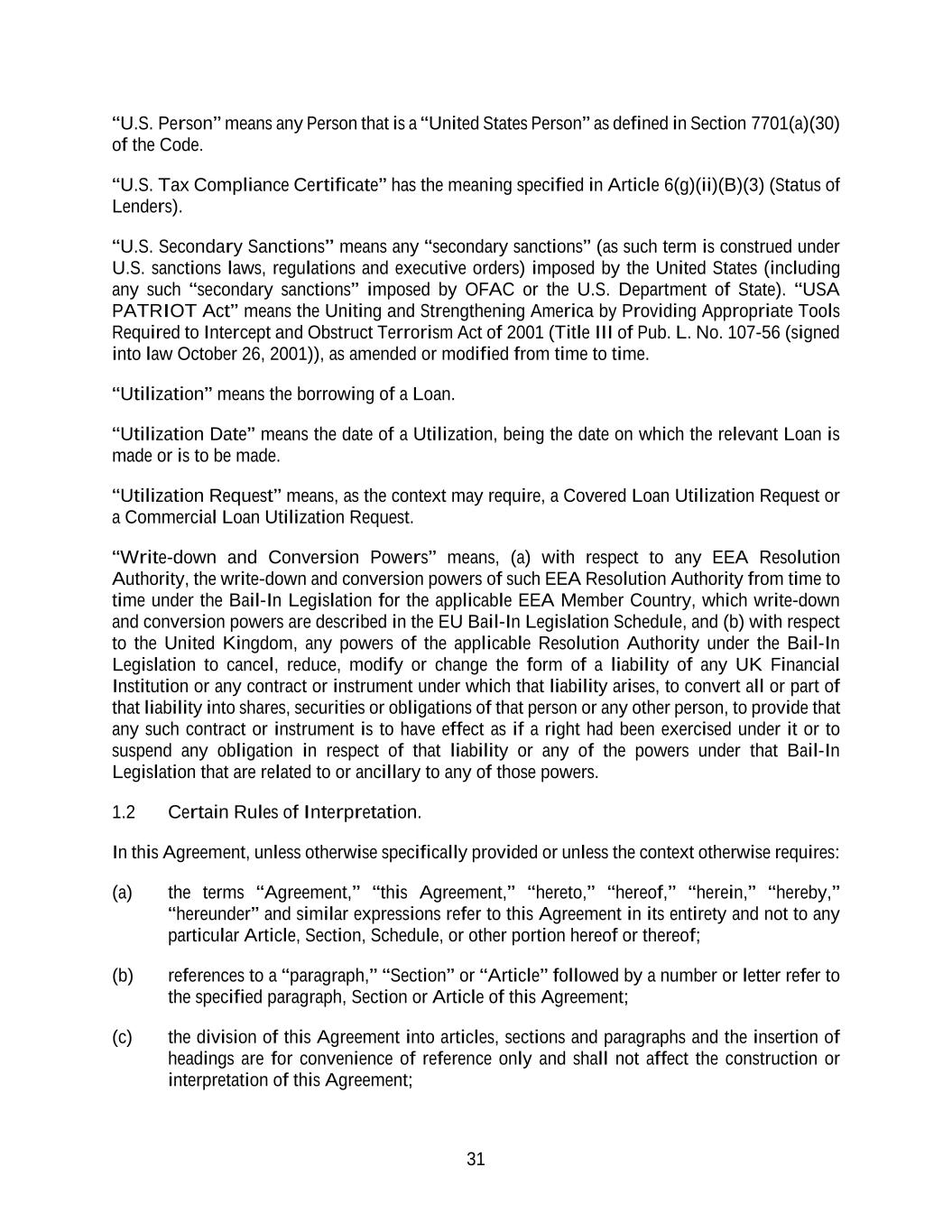 31 “U.S. Person” means any Person that is a “United States Person” as defined in Section 7701(a)(30) of the Code. “U.S. Tax Compliance Certificate” has the meaning specified in Article 6(g)(ii)(B)(3) (Status of Lenders). “U.S. Secondary Sanctions” means any “secondary sanctions” (as such term is construed under U.S. sanctions laws, regulations and executive orders) imposed by the United States (including any such “secondary sanctions” imposed by OFAC or the U.S. Department of State). “USA PATRIOT Act” means the Uniting and Strengthening America by Providing Appropriate Tools Required to Intercept and Obstruct Terrorism Act of 2001 (Title III of Pub. L. No. 107-56 (signed into law October 26, 2001)), as amended or modified from time to time. “Utilization” means the borrowing of a Loan. “Utilization Date” means the date of a Utilization, being the date on which the relevant Loan is made or is to be made. “Utilization Request” means, as the context may require, a Covered Loan Utilization Request or a Commercial Loan Utilization Request. “Write-down and Conversion Powers” means, (a) with respect to any EEA Resolution Authority, the write-down and conversion powers of such EEA Resolution Authority from time to time under the Bail-In Legislation for the applicable EEA Member Country, which write-down and conversion powers are described in the EU Bail-In Legislation Schedule, and (b) with respect to the United Kingdom, any powers of the applicable Resolution Authority under the Bail-In Legislation to cancel, reduce, modify or change the form of a liability of any UK Financial Institution or any contract or instrument under which that liability arises, to convert all or part of that liability into shares, securities or obligations of that person or any other person, to provide that any such contract or instrument is to have effect as if a right had been exercised under it or to suspend any obligation in respect of that liability or any of the powers under that Bail-In Legislation that are related to or ancillary to any of those powers. 1.2 Certain Rules of Interpretation. In this Agreement, unless otherwise specifically provided or unless the context otherwise requires: (a) the terms “Agreement,” “this Agreement,” “hereto,” “hereof,” “herein,” “hereby,” “hereunder” and similar expressions refer to this Agreement in its entirety and not to any particular Article, Section, Schedule, or other portion hereof or thereof; (b) references to a “paragraph,” “Section” or “Article” followed by a number or letter refer to the specified paragraph, Section or Article of this Agreement; (c) the division of this Agreement into articles, sections and paragraphs and the insertion of headings are for convenience of reference only and shall not affect the construction or interpretation of this Agreement;