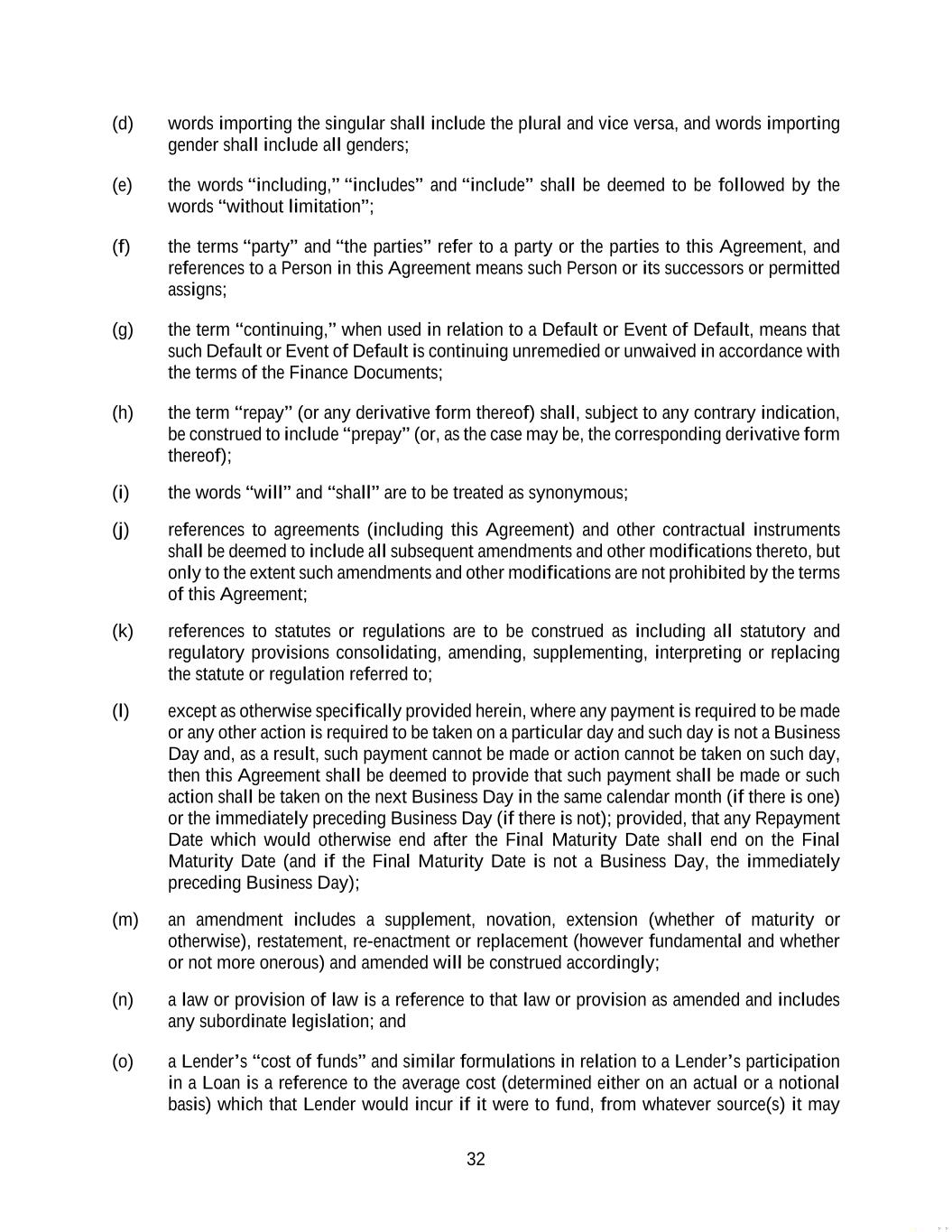 32 (d) words importing the singular shall include the plural and vice versa, and words importing gender shall include all genders; (e) the words “including,” “includes” and “include” shall be deemed to be followed by the words “without limitation”; (f) the terms “party” and “the parties” refer to a party or the parties to this Agreement, and references to a Person in this Agreement means such Person or its successors or permitted assigns; (g) the term “continuing,” when used in relation to a Default or Event of Default, means that such Default or Event of Default is continuing unremedied or unwaived in accordance with the terms of the Finance Documents; (h) the term “repay” (or any derivative form thereof) shall, subject to any contrary indication, be construed to include “prepay” (or, as the case may be, the corresponding derivative form thereof); (i) the words “will” and “shall” are to be treated as synonymous; (j) references to agreements (including this Agreement) and other contractual instruments shall be deemed to include all subsequent amendments and other modifications thereto, but only to the extent such amendments and other modifications are not prohibited by the terms of this Agreement; (k) references to statutes or regulations are to be construed as including all statutory and regulatory provisions consolidating, amending, supplementing, interpreting or replacing the statute or regulation referred to; (l) except as otherwise specifically provided herein, where any payment is required to be made or any other action is required to be taken on a particular day and such day is not a Business Day and, as a result, such payment cannot be made or action cannot be taken on such day, then this Agreement shall be deemed to provide that such payment shall be made or such action shall be taken on the next Business Day in the same calendar month (if there is one) or the immediately preceding Business Day (if there is not); provided, that any Repayment Date which would otherwise end after the Final Maturity Date shall end on the Final Maturity Date (and if the Final Maturity Date is not a Business Day, the immediately preceding Business Day); (m) an amendment includes a supplement, novation, extension (whether of maturity or otherwise), restatement, re-enactment or replacement (however fundamental and whether or not more onerous) and amended will be construed accordingly; (n) a law or provision of law is a reference to that law or provision as amended and includes any subordinate legislation; and (o) a Lender’s “cost of funds” and similar formulations in relation to a Lender’s participation in a Loan is a reference to the average cost (determined either on an actual or a notional basis) which that Lender would incur if it were to fund, from whatever source(s) it may