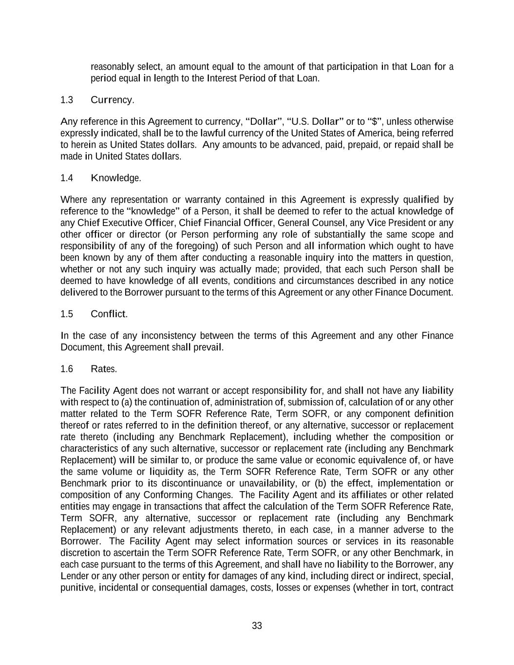 33 reasonably select, an amount equal to the amount of that participation in that Loan for a period equal in length to the Interest Period of that Loan. 1.3 Currency. Any reference in this Agreement to currency, “Dollar”, “U.S. Dollar” or to “$”, unless otherwise expressly indicated, shall be to the lawful currency of the United States of America, being referred to herein as United States dollars. Any amounts to be advanced, paid, prepaid, or repaid shall be made in United States dollars. 1.4 Knowledge. Where any representation or warranty contained in this Agreement is expressly qualified by reference to the “knowledge” of a Person, it shall be deemed to refer to the actual knowledge of any Chief Executive Officer, Chief Financial Officer, General Counsel, any Vice President or any other officer or director (or Person performing any role of substantially the same scope and responsibility of any of the foregoing) of such Person and all information which ought to have been known by any of them after conducting a reasonable inquiry into the matters in question, whether or not any such inquiry was actually made; provided, that each such Person shall be deemed to have knowledge of all events, conditions and circumstances described in any notice delivered to the Borrower pursuant to the terms of this Agreement or any other Finance Document. 1.5 Conflict. In the case of any inconsistency between the terms of this Agreement and any other Finance Document, this Agreement shall prevail. 1.6 Rates. The Facility Agent does not warrant or accept responsibility for, and shall not have any liability with respect to (a) the continuation of, administration of, submission of, calculation of or any other matter related to the Term SOFR Reference Rate, Term SOFR, or any component definition thereof or rates referred to in the definition thereof, or any alternative, successor or replacement rate thereto (including any Benchmark Replacement), including whether the composition or characteristics of any such alternative, successor or replacement rate (including any Benchmark Replacement) will be similar to, or produce the same value or economic equivalence of, or have the same volume or liquidity as, the Term SOFR Reference Rate, Term SOFR or any other Benchmark prior to its discontinuance or unavailability, or (b) the effect, implementation or composition of any Conforming Changes. The Facility Agent and its affiliates or other related entities may engage in transactions that affect the calculation of the Term SOFR Reference Rate, Term SOFR, any alternative, successor or replacement rate (including any Benchmark Replacement) or any relevant adjustments thereto, in each case, in a manner adverse to the Borrower. The Facility Agent may select information sources or services in its reasonable discretion to ascertain the Term SOFR Reference Rate, Term SOFR, or any other Benchmark, in each case pursuant to the terms of this Agreement, and shall have no liability to the Borrower, any Lender or any other person or entity for damages of any kind, including direct or indirect, special, punitive, incidental or consequential damages, costs, losses or expenses (whether in tort, contract