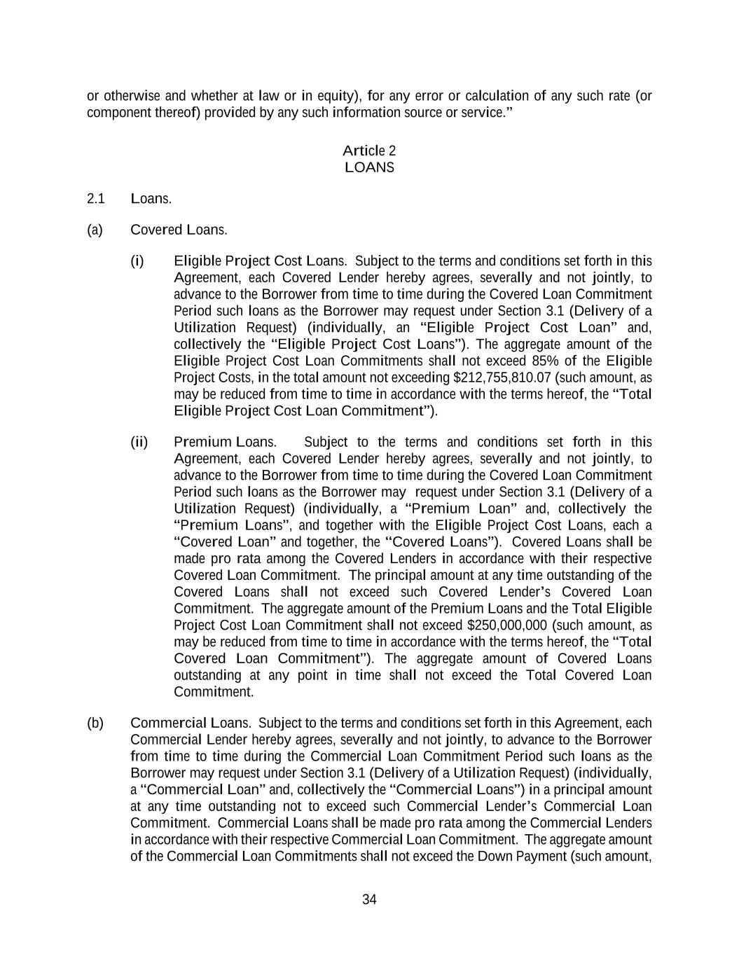34 or otherwise and whether at law or in equity), for any error or calculation of any such rate (or component thereof) provided by any such information source or service.” Article 2 LOANS 2.1 Loans. (a) Covered Loans. (i) Eligible Project Cost Loans. Subject to the terms and conditions set forth in this Agreement, each Covered Lender hereby agrees, severally and not jointly, to advance to the Borrower from time to time during the Covered Loan Commitment Period such loans as the Borrower may request under Section 3.1 (Delivery of a Utilization Request) (individually, an “Eligible Project Cost Loan” and, collectively the “Eligible Project Cost Loans”). The aggregate amount of the Eligible Project Cost Loan Commitments shall not exceed 85% of the Eligible Project Costs, in the total amount not exceeding $212,755,810.07 (such amount, as may be reduced from time to time in accordance with the terms hereof, the “Total Eligible Project Cost Loan Commitment”). (ii) Premium Loans. Subject to the terms and conditions set forth in this Agreement, each Covered Lender hereby agrees, severally and not jointly, to advance to the Borrower from time to time during the Covered Loan Commitment Period such loans as the Borrower may request under Section 3.1 (Delivery of a Utilization Request) (individually, a “Premium Loan” and, collectively the “Premium Loans”, and together with the Eligible Project Cost Loans, each a “Covered Loan” and together, the “Covered Loans”). Covered Loans shall be made pro rata among the Covered Lenders in accordance with their respective Covered Loan Commitment. The principal amount at any time outstanding of the Covered Loans shall not exceed such Covered Lender’s Covered Loan Commitment. The aggregate amount of the Premium Loans and the Total Eligible Project Cost Loan Commitment shall not exceed $250,000,000 (such amount, as may be reduced from time to time in accordance with the terms hereof, the “Total Covered Loan Commitment”). The aggregate amount of Covered Loans outstanding at any point in time shall not exceed the Total Covered Loan Commitment. (b) Commercial Loans. Subject to the terms and conditions set forth in this Agreement, each Commercial Lender hereby agrees, severally and not jointly, to advance to the Borrower from time to time during the Commercial Loan Commitment Period such loans as the Borrower may request under Section 3.1 (Delivery of a Utilization Request) (individually, a “Commercial Loan” and, collectively the “Commercial Loans”) in a principal amount at any time outstanding not to exceed such Commercial Lender’s Commercial Loan Commitment. Commercial Loans shall be made pro rata among the Commercial Lenders in accordance with their respective Commercial Loan Commitment. The aggregate amount of the Commercial Loan Commitments shall not exceed the Down Payment (such amount,