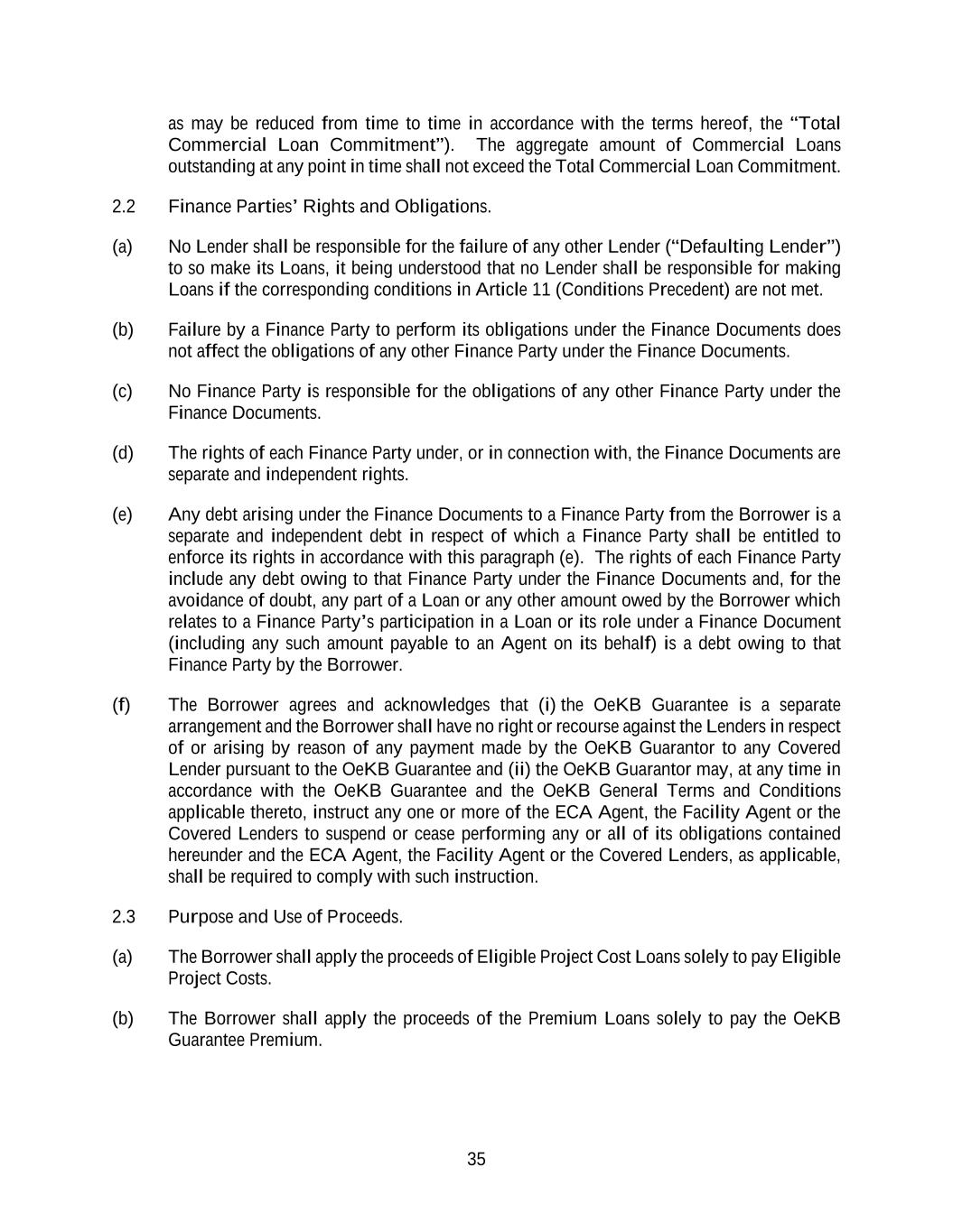 35 as may be reduced from time to time in accordance with the terms hereof, the “Total Commercial Loan Commitment”). The aggregate amount of Commercial Loans outstanding at any point in time shall not exceed the Total Commercial Loan Commitment. 2.2 Finance Parties’ Rights and Obligations. (a) No Lender shall be responsible for the failure of any other Lender (“Defaulting Lender”) to so make its Loans, it being understood that no Lender shall be responsible for making Loans if the corresponding conditions in Article 11 (Conditions Precedent) are not met. (b) Failure by a Finance Party to perform its obligations under the Finance Documents does not affect the obligations of any other Finance Party under the Finance Documents. (c) No Finance Party is responsible for the obligations of any other Finance Party under the Finance Documents. (d) The rights of each Finance Party under, or in connection with, the Finance Documents are separate and independent rights. (e) Any debt arising under the Finance Documents to a Finance Party from the Borrower is a separate and independent debt in respect of which a Finance Party shall be entitled to enforce its rights in accordance with this paragraph (e). The rights of each Finance Party include any debt owing to that Finance Party under the Finance Documents and, for the avoidance of doubt, any part of a Loan or any other amount owed by the Borrower which relates to a Finance Party’s participation in a Loan or its role under a Finance Document (including any such amount payable to an Agent on its behalf) is a debt owing to that Finance Party by the Borrower. (f) The Borrower agrees and acknowledges that (i) the OeKB Guarantee is a separate arrangement and the Borrower shall have no right or recourse against the Lenders in respect of or arising by reason of any payment made by the OeKB Guarantor to any Covered Lender pursuant to the OeKB Guarantee and (ii) the OeKB Guarantor may, at any time in accordance with the OeKB Guarantee and the OeKB General Terms and Conditions applicable thereto, instruct any one or more of the ECA Agent, the Facility Agent or the Covered Lenders to suspend or cease performing any or all of its obligations contained hereunder and the ECA Agent, the Facility Agent or the Covered Lenders, as applicable, shall be required to comply with such instruction. 2.3 Purpose and Use of Proceeds. (a) The Borrower shall apply the proceeds of Eligible Project Cost Loans solely to pay Eligible Project Costs. (b) The Borrower shall apply the proceeds of the Premium Loans solely to pay the OeKB Guarantee Premium.