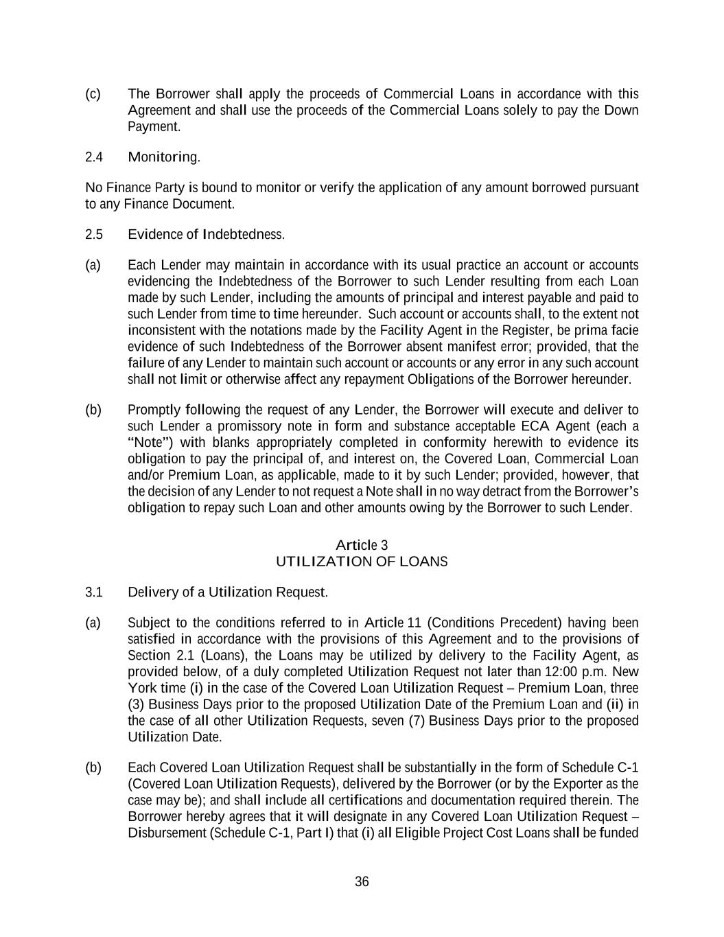 36 (c) The Borrower shall apply the proceeds of Commercial Loans in accordance with this Agreement and shall use the proceeds of the Commercial Loans solely to pay the Down Payment. 2.4 Monitoring. No Finance Party is bound to monitor or verify the application of any amount borrowed pursuant to any Finance Document. 2.5 Evidence of Indebtedness. (a) Each Lender may maintain in accordance with its usual practice an account or accounts evidencing the Indebtedness of the Borrower to such Lender resulting from each Loan made by such Lender, including the amounts of principal and interest payable and paid to such Lender from time to time hereunder. Such account or accounts shall, to the extent not inconsistent with the notations made by the Facility Agent in the Register, be prima facie evidence of such Indebtedness of the Borrower absent manifest error; provided, that the failure of any Lender to maintain such account or accounts or any error in any such account shall not limit or otherwise affect any repayment Obligations of the Borrower hereunder. (b) Promptly following the request of any Lender, the Borrower will execute and deliver to such Lender a promissory note in form and substance acceptable ECA Agent (each a “Note”) with blanks appropriately completed in conformity herewith to evidence its obligation to pay the principal of, and interest on, the Covered Loan, Commercial Loan and/or Premium Loan, as applicable, made to it by such Lender; provided, however, that the decision of any Lender to not request a Note shall in no way detract from the Borrower’s obligation to repay such Loan and other amounts owing by the Borrower to such Lender. Article 3 UTILIZATION OF LOANS 3.1 Delivery of a Utilization Request. (a) Subject to the conditions referred to in Article 11 (Conditions Precedent) having been satisfied in accordance with the provisions of this Agreement and to the provisions of Section 2.1 (Loans), the Loans may be utilized by delivery to the Facility Agent, as provided below, of a duly completed Utilization Request not later than 12:00 p.m. New York time (i) in the case of the Covered Loan Utilization Request – Premium Loan, three (3) Business Days prior to the proposed Utilization Date of the Premium Loan and (ii) in the case of all other Utilization Requests, seven (7) Business Days prior to the proposed Utilization Date. (b) Each Covered Loan Utilization Request shall be substantially in the form of Schedule C-1 (Covered Loan Utilization Requests), delivered by the Borrower (or by the Exporter as the case may be); and shall include all certifications and documentation required therein. The Borrower hereby agrees that it will designate in any Covered Loan Utilization Request – Disbursement (Schedule C-1, Part I) that (i) all Eligible Project Cost Loans shall be funded