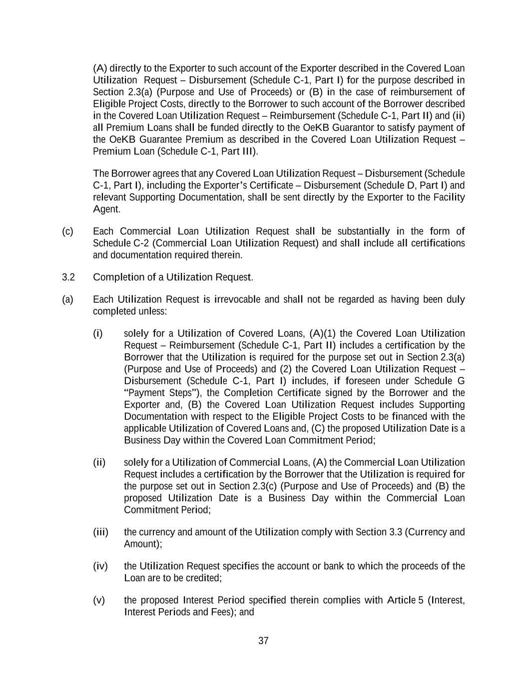 37 (A) directly to the Exporter to such account of the Exporter described in the Covered Loan Utilization Request – Disbursement (Schedule C-1, Part I) for the purpose described in Section 2.3(a) (Purpose and Use of Proceeds) or (B) in the case of reimbursement of Eligible Project Costs, directly to the Borrower to such account of the Borrower described in the Covered Loan Utilization Request – Reimbursement (Schedule C-1, Part II) and (ii) all Premium Loans shall be funded directly to the OeKB Guarantor to satisfy payment of the OeKB Guarantee Premium as described in the Covered Loan Utilization Request – Premium Loan (Schedule C-1, Part III). The Borrower agrees that any Covered Loan Utilization Request – Disbursement (Schedule C-1, Part I), including the Exporter’s Certificate – Disbursement (Schedule D, Part I) and relevant Supporting Documentation, shall be sent directly by the Exporter to the Facility Agent. (c) Each Commercial Loan Utilization Request shall be substantially in the form of Schedule C-2 (Commercial Loan Utilization Request) and shall include all certifications and documentation required therein. 3.2 Completion of a Utilization Request. (a) Each Utilization Request is irrevocable and shall not be regarded as having been duly completed unless: (i) solely for a Utilization of Covered Loans, (A)(1) the Covered Loan Utilization Request – Reimbursement (Schedule C-1, Part II) includes a certification by the Borrower that the Utilization is required for the purpose set out in Section 2.3(a) (Purpose and Use of Proceeds) and (2) the Covered Loan Utilization Request – Disbursement (Schedule C-1, Part I) includes, if foreseen under Schedule G “Payment Steps”), the Completion Certificate signed by the Borrower and the Exporter and, (B) the Covered Loan Utilization Request includes Supporting Documentation with respect to the Eligible Project Costs to be financed with the applicable Utilization of Covered Loans and, (C) the proposed Utilization Date is a Business Day within the Covered Loan Commitment Period; (ii) solely for a Utilization of Commercial Loans, (A) the Commercial Loan Utilization Request includes a certification by the Borrower that the Utilization is required for the purpose set out in Section 2.3(c) (Purpose and Use of Proceeds) and (B) the proposed Utilization Date is a Business Day within the Commercial Loan Commitment Period; (iii) the currency and amount of the Utilization comply with Section 3.3 (Currency and Amount); (iv) the Utilization Request specifies the account or bank to which the proceeds of the Loan are to be credited; (v) the proposed Interest Period specified therein complies with Article 5 (Interest, Interest Periods and Fees); and