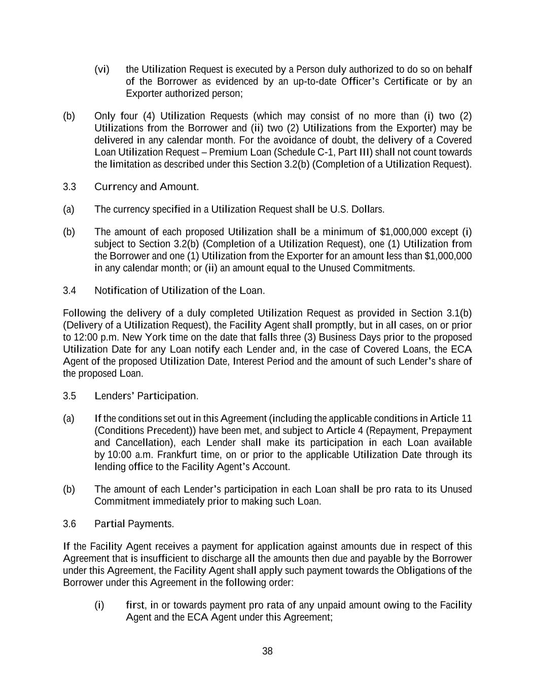 38 (vi) the Utilization Request is executed by a Person duly authorized to do so on behalf of the Borrower as evidenced by an up-to-date Officer’s Certificate or by an Exporter authorized person; (b) Only four (4) Utilization Requests (which may consist of no more than (i) two (2) Utilizations from the Borrower and (ii) two (2) Utilizations from the Exporter) may be delivered in any calendar month. For the avoidance of doubt, the delivery of a Covered Loan Utilization Request – Premium Loan (Schedule C-1, Part III) shall not count towards the limitation as described under this Section 3.2(b) (Completion of a Utilization Request). 3.3 Currency and Amount. (a) The currency specified in a Utilization Request shall be U.S. Dollars. (b) The amount of each proposed Utilization shall be a minimum of $1,000,000 except (i) subject to Section 3.2(b) (Completion of a Utilization Request), one (1) Utilization from the Borrower and one (1) Utilization from the Exporter for an amount less than $1,000,000 in any calendar month; or (ii) an amount equal to the Unused Commitments. 3.4 Notification of Utilization of the Loan. Following the delivery of a duly completed Utilization Request as provided in Section 3.1(b) (Delivery of a Utilization Request), the Facility Agent shall promptly, but in all cases, on or prior to 12:00 p.m. New York time on the date that falls three (3) Business Days prior to the proposed Utilization Date for any Loan notify each Lender and, in the case of Covered Loans, the ECA Agent of the proposed Utilization Date, Interest Period and the amount of such Lender’s share of the proposed Loan. 3.5 Lenders’ Participation. (a) If the conditions set out in this Agreement (including the applicable conditions in Article 11 (Conditions Precedent)) have been met, and subject to Article 4 (Repayment, Prepayment and Cancellation), each Lender shall make its participation in each Loan available by 10:00 a.m. Frankfurt time, on or prior to the applicable Utilization Date through its lending office to the Facility Agent’s Account. (b) The amount of each Lender’s participation in each Loan shall be pro rata to its Unused Commitment immediately prior to making such Loan. 3.6 Partial Payments. If the Facility Agent receives a payment for application against amounts due in respect of this Agreement that is insufficient to discharge all the amounts then due and payable by the Borrower under this Agreement, the Facility Agent shall apply such payment towards the Obligations of the Borrower under this Agreement in the following order: (i) first, in or towards payment pro rata of any unpaid amount owing to the Facility Agent and the ECA Agent under this Agreement;