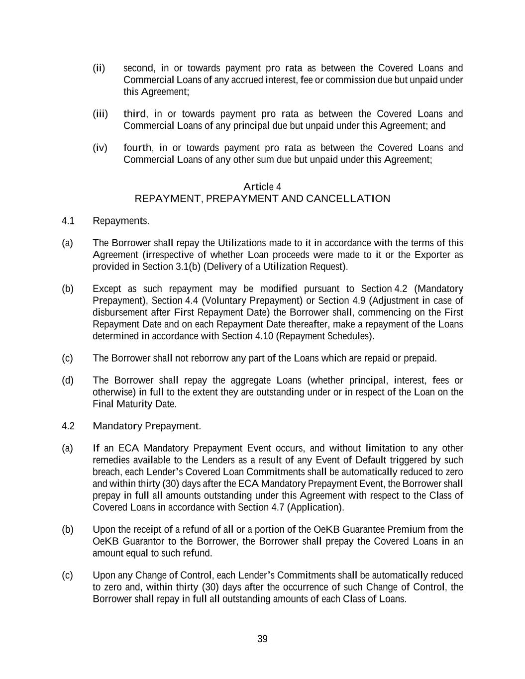 39 (ii) second, in or towards payment pro rata as between the Covered Loans and Commercial Loans of any accrued interest, fee or commission due but unpaid under this Agreement; (iii) third, in or towards payment pro rata as between the Covered Loans and Commercial Loans of any principal due but unpaid under this Agreement; and (iv) fourth, in or towards payment pro rata as between the Covered Loans and Commercial Loans of any other sum due but unpaid under this Agreement; Article 4 REPAYMENT, PREPAYMENT AND CANCELLATION 4.1 Repayments. (a) The Borrower shall repay the Utilizations made to it in accordance with the terms of this Agreement (irrespective of whether Loan proceeds were made to it or the Exporter as provided in Section 3.1(b) (Delivery of a Utilization Request). (b) Except as such repayment may be modified pursuant to Section 4.2 (Mandatory Prepayment), Section 4.4 (Voluntary Prepayment) or Section 4.9 (Adjustment in case of disbursement after First Repayment Date) the Borrower shall, commencing on the First Repayment Date and on each Repayment Date thereafter, make a repayment of the Loans determined in accordance with Section 4.10 (Repayment Schedules). (c) The Borrower shall not reborrow any part of the Loans which are repaid or prepaid. (d) The Borrower shall repay the aggregate Loans (whether principal, interest, fees or otherwise) in full to the extent they are outstanding under or in respect of the Loan on the Final Maturity Date. 4.2 Mandatory Prepayment. (a) If an ECA Mandatory Prepayment Event occurs, and without limitation to any other remedies available to the Lenders as a result of any Event of Default triggered by such breach, each Lender’s Covered Loan Commitments shall be automatically reduced to zero and within thirty (30) days after the ECA Mandatory Prepayment Event, the Borrower shall prepay in full all amounts outstanding under this Agreement with respect to the Class of Covered Loans in accordance with Section 4.7 (Application). (b) Upon the receipt of a refund of all or a portion of the OeKB Guarantee Premium from the OeKB Guarantor to the Borrower, the Borrower shall prepay the Covered Loans in an amount equal to such refund. (c) Upon any Change of Control, each Lender’s Commitments shall be automatically reduced to zero and, within thirty (30) days after the occurrence of such Change of Control, the Borrower shall repay in full all outstanding amounts of each Class of Loans.