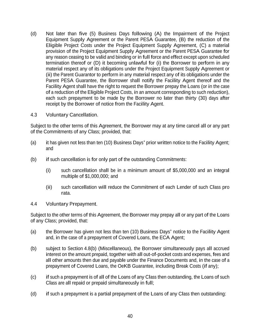 40 (d) Not later than five (5) Business Days following (A) the Impairment of the Project Equipment Supply Agreement or the Parent PESA Guarantee, (B) the reduction of the Eligible Project Costs under the Project Equipment Supply Agreement, (C) a material provision of the Project Equipment Supply Agreement or the Parent PESA Guarantee for any reason ceasing to be valid and binding or in full force and effect except upon scheduled termination thereof or (D) it becoming unlawful for (i) the Borrower to perform in any material respect any of its obligations under the Project Equipment Supply Agreement or (ii) the Parent Guarantor to perform in any material respect any of its obligations under the Parent PESA Guarantee, the Borrower shall notify the Facility Agent thereof and the Facility Agent shall have the right to request the Borrower prepay the Loans (or in the case of a reduction of the Eligible Project Costs, in an amount corresponding to such reduction), each such prepayment to be made by the Borrower no later than thirty (30) days after receipt by the Borrower of notice from the Facility Agent. 4.3 Voluntary Cancellation. Subject to the other terms of this Agreement, the Borrower may at any time cancel all or any part of the Commitments of any Class; provided, that: (a) it has given not less than ten (10) Business Days’ prior written notice to the Facility Agent; and (b) if such cancellation is for only part of the outstanding Commitments: (i) such cancellation shall be in a minimum amount of $5,000,000 and an integral multiple of $1,000,000; and (ii) such cancellation will reduce the Commitment of each Lender of such Class pro rata. 4.4 Voluntary Prepayment. Subject to the other terms of this Agreement, the Borrower may prepay all or any part of the Loans of any Class; provided, that: (a) the Borrower has given not less than ten (10) Business Days’ notice to the Facility Agent and, in the case of a prepayment of Covered Loans, the ECA Agent; (b) subject to Section 4.8(b) (Miscellaneous), the Borrower simultaneously pays all accrued interest on the amount prepaid, together with all out-of-pocket costs and expenses, fees and all other amounts then due and payable under the Finance Documents and, in the case of a prepayment of Covered Loans, the OeKB Guarantee, including Break Costs (if any); (c) if such a prepayment is of all of the Loans of any Class then outstanding, the Loans of such Class are all repaid or prepaid simultaneously in full; (d) if such a prepayment is a partial prepayment of the Loans of any Class then outstanding: