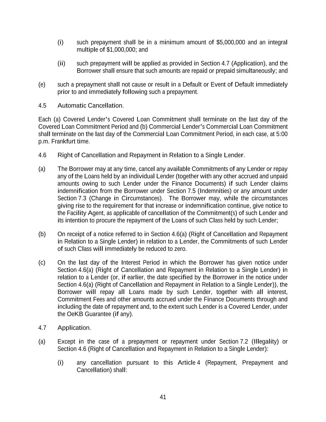 41 (i) such prepayment shall be in a minimum amount of $5,000,000 and an integral multiple of $1,000,000; and (ii) such prepayment will be applied as provided in Section 4.7 (Application), and the Borrower shall ensure that such amounts are repaid or prepaid simultaneously; and (e) such a prepayment shall not cause or result in a Default or Event of Default immediately prior to and immediately following such a prepayment. 4.5 Automatic Cancellation. Each (a) Covered Lender’s Covered Loan Commitment shall terminate on the last day of the Covered Loan Commitment Period and (b) Commercial Lender’s Commercial Loan Commitment shall terminate on the last day of the Commercial Loan Commitment Period, in each case, at 5:00 p.m. Frankfurt time. 4.6 Right of Cancellation and Repayment in Relation to a Single Lender. (a) The Borrower may at any time, cancel any available Commitments of any Lender or repay any of the Loans held by an individual Lender (together with any other accrued and unpaid amounts owing to such Lender under the Finance Documents) if such Lender claims indemnification from the Borrower under Section 7.5 (Indemnities) or any amount under Section 7.3 (Change in Circumstances). The Borrower may, while the circumstances giving rise to the requirement for that increase or indemnification continue, give notice to the Facility Agent, as applicable of cancellation of the Commitment(s) of such Lender and its intention to procure the repayment of the Loans of such Class held by such Lender; (b) On receipt of a notice referred to in Section 4.6(a) (Right of Cancellation and Repayment in Relation to a Single Lender) in relation to a Lender, the Commitments of such Lender of such Class will immediately be reduced to zero. (c) On the last day of the Interest Period in which the Borrower has given notice under Section 4.6(a) (Right of Cancellation and Repayment in Relation to a Single Lender) in relation to a Lender (or, if earlier, the date specified by the Borrower in the notice under Section 4.6(a) (Right of Cancellation and Repayment in Relation to a Single Lender)), the Borrower will repay all Loans made by such Lender, together with all interest, Commitment Fees and other amounts accrued under the Finance Documents through and including the date of repayment and, to the extent such Lender is a Covered Lender, under the OeKB Guarantee (if any). 4.7 Application. (a) Except in the case of a prepayment or repayment under Section 7.2 (Illegality) or Section 4.6 (Right of Cancellation and Repayment in Relation to a Single Lender): (i) any cancellation pursuant to this Article 4 (Repayment, Prepayment and Cancellation) shall:
