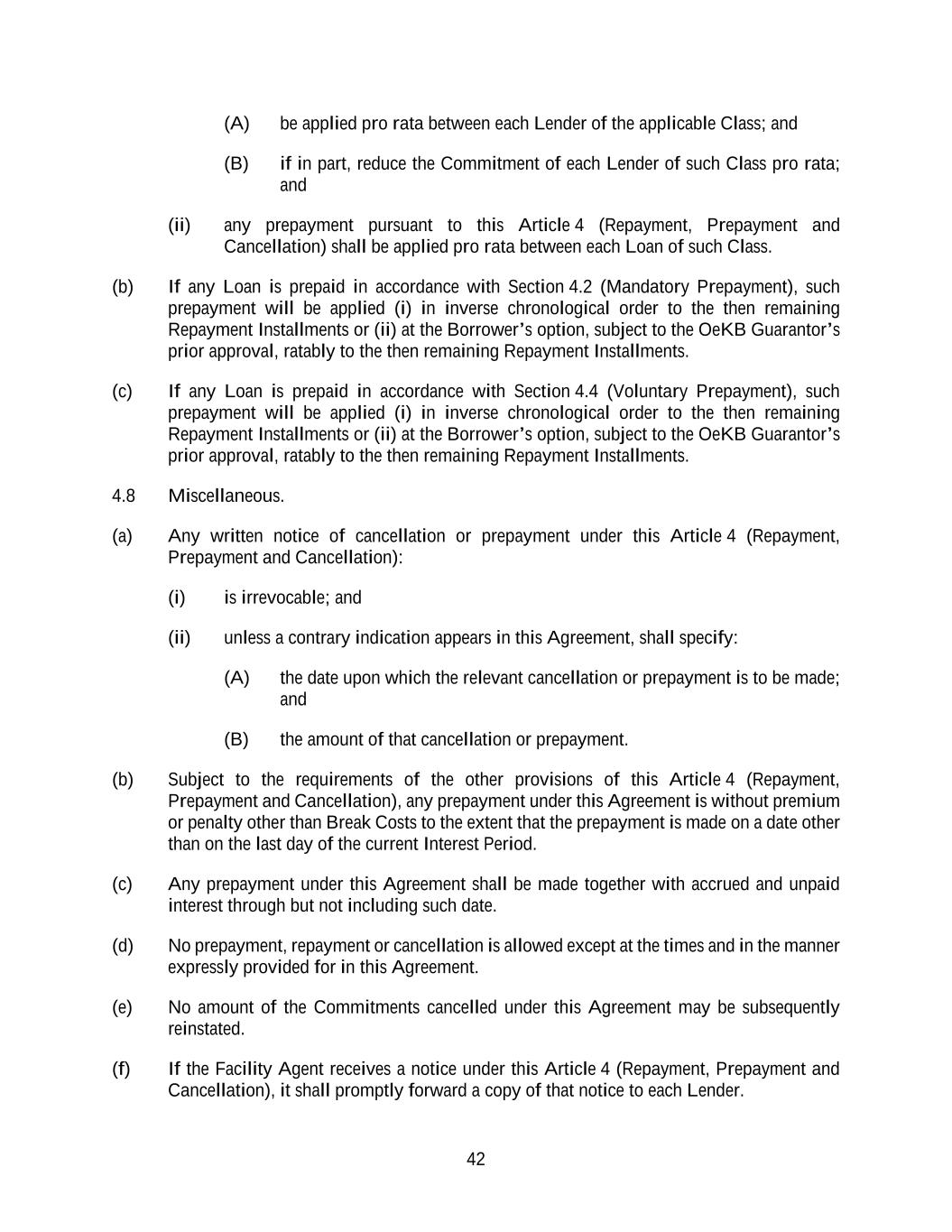 42 (A) be applied pro rata between each Lender of the applicable Class; and (B) if in part, reduce the Commitment of each Lender of such Class pro rata; and (ii) any prepayment pursuant to this Article 4 (Repayment, Prepayment and Cancellation) shall be applied pro rata between each Loan of such Class. (b) If any Loan is prepaid in accordance with Section 4.2 (Mandatory Prepayment), such prepayment will be applied (i) in inverse chronological order to the then remaining Repayment Installments or (ii) at the Borrower’s option, subject to the OeKB Guarantor’s prior approval, ratably to the then remaining Repayment Installments. (c) If any Loan is prepaid in accordance with Section 4.4 (Voluntary Prepayment), such prepayment will be applied (i) in inverse chronological order to the then remaining Repayment Installments or (ii) at the Borrower’s option, subject to the OeKB Guarantor’s prior approval, ratably to the then remaining Repayment Installments. 4.8 Miscellaneous. (a) Any written notice of cancellation or prepayment under this Article 4 (Repayment, Prepayment and Cancellation): (i) is irrevocable; and (ii) unless a contrary indication appears in this Agreement, shall specify: (A) the date upon which the relevant cancellation or prepayment is to be made; and (B) the amount of that cancellation or prepayment. (b) Subject to the requirements of the other provisions of this Article 4 (Repayment, Prepayment and Cancellation), any prepayment under this Agreement is without premium or penalty other than Break Costs to the extent that the prepayment is made on a date other than on the last day of the current Interest Period. (c) Any prepayment under this Agreement shall be made together with accrued and unpaid interest through but not including such date. (d) No prepayment, repayment or cancellation is allowed except at the times and in the manner expressly provided for in this Agreement. (e) No amount of the Commitments cancelled under this Agreement may be subsequently reinstated. (f) If the Facility Agent receives a notice under this Article 4 (Repayment, Prepayment and Cancellation), it shall promptly forward a copy of that notice to each Lender.