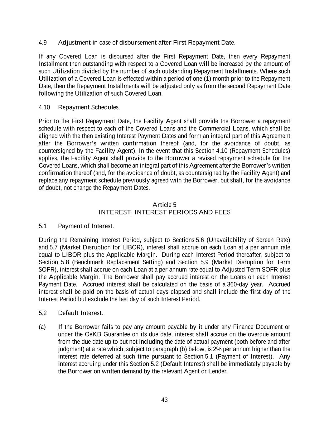 43 4.9 Adjustment in case of disbursement after First Repayment Date. If any Covered Loan is disbursed after the First Repayment Date, then every Repayment Installment then outstanding with respect to a Covered Loan will be increased by the amount of such Utilization divided by the number of such outstanding Repayment Installments. Where such Utilization of a Covered Loan is effected within a period of one (1) month prior to the Repayment Date, then the Repayment Installments will be adjusted only as from the second Repayment Date following the Utilization of such Covered Loan. 4.10 Repayment Schedules. Prior to the First Repayment Date, the Facility Agent shall provide the Borrower a repayment schedule with respect to each of the Covered Loans and the Commercial Loans, which shall be aligned with the then existing Interest Payment Dates and form an integral part of this Agreement after the Borrower’s written confirmation thereof (and, for the avoidance of doubt, as countersigned by the Facility Agent). In the event that this Section 4.10 (Repayment Schedules) applies, the Facility Agent shall provide to the Borrower a revised repayment schedule for the Covered Loans, which shall become an integral part of this Agreement after the Borrower’s written confirmation thereof (and, for the avoidance of doubt, as countersigned by the Facility Agent) and replace any repayment schedule previously agreed with the Borrower, but shall, for the avoidance of doubt, not change the Repayment Dates. Article 5 INTEREST, INTEREST PERIODS AND FEES 5.1 Payment of Interest. During the Remaining Interest Period, subject to Sections 5.6 (Unavailability of Screen Rate) and 5.7 (Market Disruption for LIBOR), interest shall accrue on each Loan at a per annum rate equal to LIBOR plus the Applicable Margin. During each Interest Period thereafter, subject to Section 5.8 (Benchmark Replacement Setting) and Section 5.9 (Market Disruption for Term SOFR), interest shall accrue on each Loan at a per annum rate equal to Adjusted Term SOFR plus the Applicable Margin. The Borrower shall pay accrued interest on the Loans on each Interest Payment Date. Accrued interest shall be calculated on the basis of a 360-day year. Accrued interest shall be paid on the basis of actual days elapsed and shall include the first day of the Interest Period but exclude the last day of such Interest Period. 5.2 Default Interest. (a) If the Borrower fails to pay any amount payable by it under any Finance Document or under the OeKB Guarantee on its due date, interest shall accrue on the overdue amount from the due date up to but not including the date of actual payment (both before and after judgment) at a rate which, subject to paragraph (b) below, is 2% per annum higher than the interest rate deferred at such time pursuant to Section 5.1 (Payment of Interest). Any interest accruing under this Section 5.2 (Default Interest) shall be immediately payable by the Borrower on written demand by the relevant Agent or Lender.