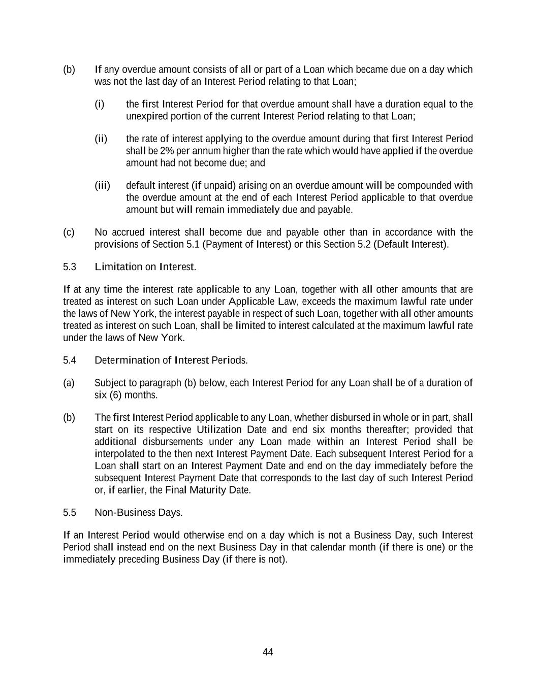 44 (b) If any overdue amount consists of all or part of a Loan which became due on a day which was not the last day of an Interest Period relating to that Loan; (i) the first Interest Period for that overdue amount shall have a duration equal to the unexpired portion of the current Interest Period relating to that Loan; (ii) the rate of interest applying to the overdue amount during that first Interest Period shall be 2% per annum higher than the rate which would have applied if the overdue amount had not become due; and (iii) default interest (if unpaid) arising on an overdue amount will be compounded with the overdue amount at the end of each Interest Period applicable to that overdue amount but will remain immediately due and payable. (c) No accrued interest shall become due and payable other than in accordance with the provisions of Section 5.1 (Payment of Interest) or this Section 5.2 (Default Interest). 5.3 Limitation on Interest. If at any time the interest rate applicable to any Loan, together with all other amounts that are treated as interest on such Loan under Applicable Law, exceeds the maximum lawful rate under the laws of New York, the interest payable in respect of such Loan, together with all other amounts treated as interest on such Loan, shall be limited to interest calculated at the maximum lawful rate under the laws of New York. 5.4 Determination of Interest Periods. (a) Subject to paragraph (b) below, each Interest Period for any Loan shall be of a duration of six (6) months. (b) The first Interest Period applicable to any Loan, whether disbursed in whole or in part, shall start on its respective Utilization Date and end six months thereafter; provided that additional disbursements under any Loan made within an Interest Period shall be interpolated to the then next Interest Payment Date. Each subsequent Interest Period for a Loan shall start on an Interest Payment Date and end on the day immediately before the subsequent Interest Payment Date that corresponds to the last day of such Interest Period or, if earlier, the Final Maturity Date. 5.5 Non-Business Days. If an Interest Period would otherwise end on a day which is not a Business Day, such Interest Period shall instead end on the next Business Day in that calendar month (if there is one) or the immediately preceding Business Day (if there is not).
