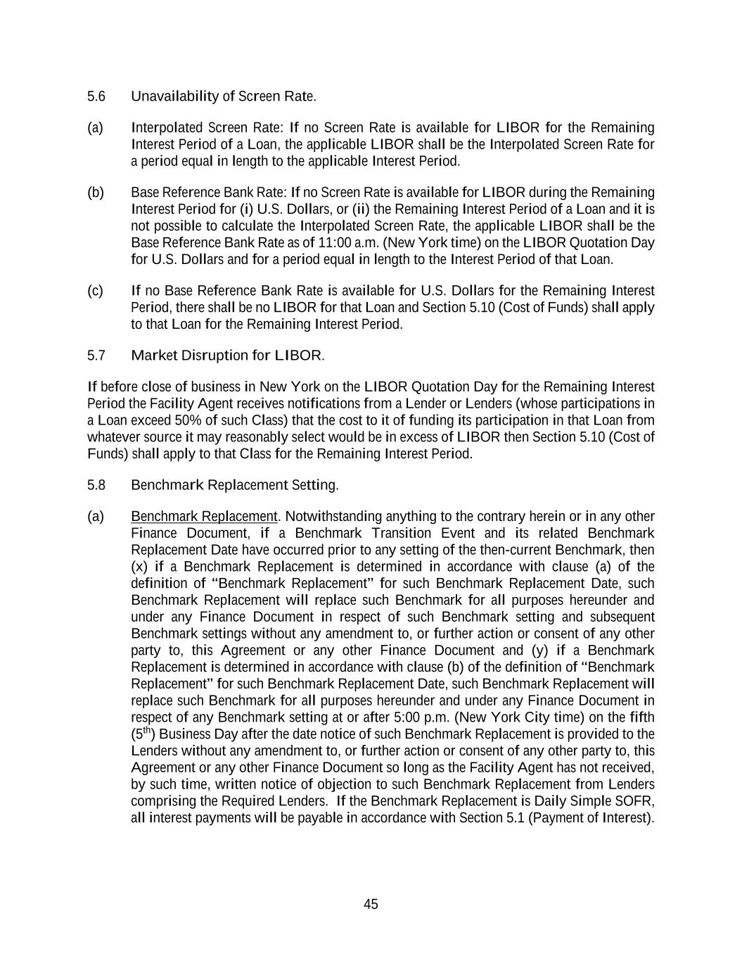 45 5.6 Unavailability of Screen Rate. (a) Interpolated Screen Rate: If no Screen Rate is available for LIBOR for the Remaining Interest Period of a Loan, the applicable LIBOR shall be the Interpolated Screen Rate for a period equal in length to the applicable Interest Period. (b) Base Reference Bank Rate: If no Screen Rate is available for LIBOR during the Remaining Interest Period for (i) U.S. Dollars, or (ii) the Remaining Interest Period of a Loan and it is not possible to calculate the Interpolated Screen Rate, the applicable LIBOR shall be the Base Reference Bank Rate as of 11:00 a.m. (New York time) on the LIBOR Quotation Day for U.S. Dollars and for a period equal in length to the Interest Period of that Loan. (c) If no Base Reference Bank Rate is available for U.S. Dollars for the Remaining Interest Period, there shall be no LIBOR for that Loan and Section 5.10 (Cost of Funds) shall apply to that Loan for the Remaining Interest Period. 5.7 Market Disruption for LIBOR. If before close of business in New York on the LIBOR Quotation Day for the Remaining Interest Period the Facility Agent receives notifications from a Lender or Lenders (whose participations in a Loan exceed 50% of such Class) that the cost to it of funding its participation in that Loan from whatever source it may reasonably select would be in excess of LIBOR then Section 5.10 (Cost of Funds) shall apply to that Class for the Remaining Interest Period. 5.8 Benchmark Replacement Setting. (a) Benchmark Replacement. Notwithstanding anything to the contrary herein or in any other Finance Document, if a Benchmark Transition Event and its related Benchmark Replacement Date have occurred prior to any setting of the then-current Benchmark, then (x) if a Benchmark Replacement is determined in accordance with clause (a) of the definition of “Benchmark Replacement” for such Benchmark Replacement Date, such Benchmark Replacement will replace such Benchmark for all purposes hereunder and under any Finance Document in respect of such Benchmark setting and subsequent Benchmark settings without any amendment to, or further action or consent of any other party to, this Agreement or any other Finance Document and (y) if a Benchmark Replacement is determined in accordance with clause (b) of the definition of “Benchmark Replacement” for such Benchmark Replacement Date, such Benchmark Replacement will replace such Benchmark for all purposes hereunder and under any Finance Document in respect of any Benchmark setting at or after 5:00 p.m. (New York City time) on the fifth (5th) Business Day after the date notice of such Benchmark Replacement is provided to the Lenders without any amendment to, or further action or consent of any other party to, this Agreement or any other Finance Document so long as the Facility Agent has not received, by such time, written notice of objection to such Benchmark Replacement from Lenders comprising the Required Lenders. If the Benchmark Replacement is Daily Simple SOFR, all interest payments will be payable in accordance with Section 5.1 (Payment of Interest).
