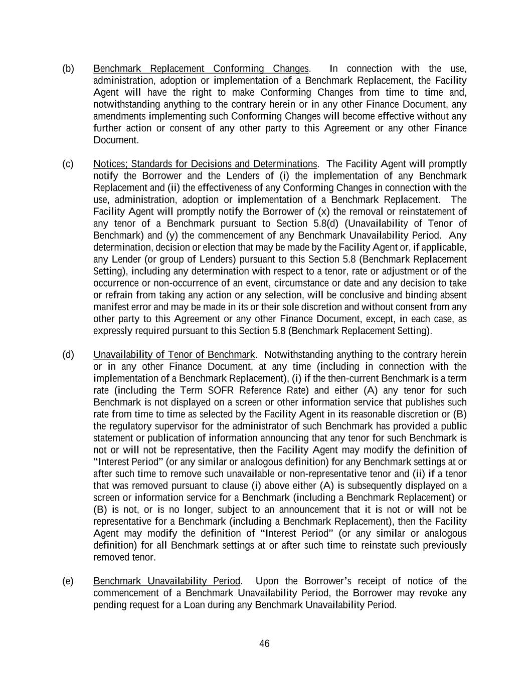 46 (b) Benchmark Replacement Conforming Changes. In connection with the use, administration, adoption or implementation of a Benchmark Replacement, the Facility Agent will have the right to make Conforming Changes from time to time and, notwithstanding anything to the contrary herein or in any other Finance Document, any amendments implementing such Conforming Changes will become effective without any further action or consent of any other party to this Agreement or any other Finance Document. (c) Notices; Standards for Decisions and Determinations. The Facility Agent will promptly notify the Borrower and the Lenders of (i) the implementation of any Benchmark Replacement and (ii) the effectiveness of any Conforming Changes in connection with the use, administration, adoption or implementation of a Benchmark Replacement. The Facility Agent will promptly notify the Borrower of (x) the removal or reinstatement of any tenor of a Benchmark pursuant to Section 5.8(d) (Unavailability of Tenor of Benchmark) and (y) the commencement of any Benchmark Unavailability Period. Any determination, decision or election that may be made by the Facility Agent or, if applicable, any Lender (or group of Lenders) pursuant to this Section 5.8 (Benchmark Replacement Setting), including any determination with respect to a tenor, rate or adjustment or of the occurrence or non-occurrence of an event, circumstance or date and any decision to take or refrain from taking any action or any selection, will be conclusive and binding absent manifest error and may be made in its or their sole discretion and without consent from any other party to this Agreement or any other Finance Document, except, in each case, as expressly required pursuant to this Section 5.8 (Benchmark Replacement Setting). (d) Unavailability of Tenor of Benchmark. Notwithstanding anything to the contrary herein or in any other Finance Document, at any time (including in connection with the implementation of a Benchmark Replacement), (i) if the then-current Benchmark is a term rate (including the Term SOFR Reference Rate) and either (A) any tenor for such Benchmark is not displayed on a screen or other information service that publishes such rate from time to time as selected by the Facility Agent in its reasonable discretion or (B) the regulatory supervisor for the administrator of such Benchmark has provided a public statement or publication of information announcing that any tenor for such Benchmark is not or will not be representative, then the Facility Agent may modify the definition of “Interest Period” (or any similar or analogous definition) for any Benchmark settings at or after such time to remove such unavailable or non-representative tenor and (ii) if a tenor that was removed pursuant to clause (i) above either (A) is subsequently displayed on a screen or information service for a Benchmark (including a Benchmark Replacement) or (B) is not, or is no longer, subject to an announcement that it is not or will not be representative for a Benchmark (including a Benchmark Replacement), then the Facility Agent may modify the definition of “Interest Period” (or any similar or analogous definition) for all Benchmark settings at or after such time to reinstate such previously removed tenor. (e) Benchmark Unavailability Period. Upon the Borrower’s receipt of notice of the commencement of a Benchmark Unavailability Period, the Borrower may revoke any pending request for a Loan during any Benchmark Unavailability Period.