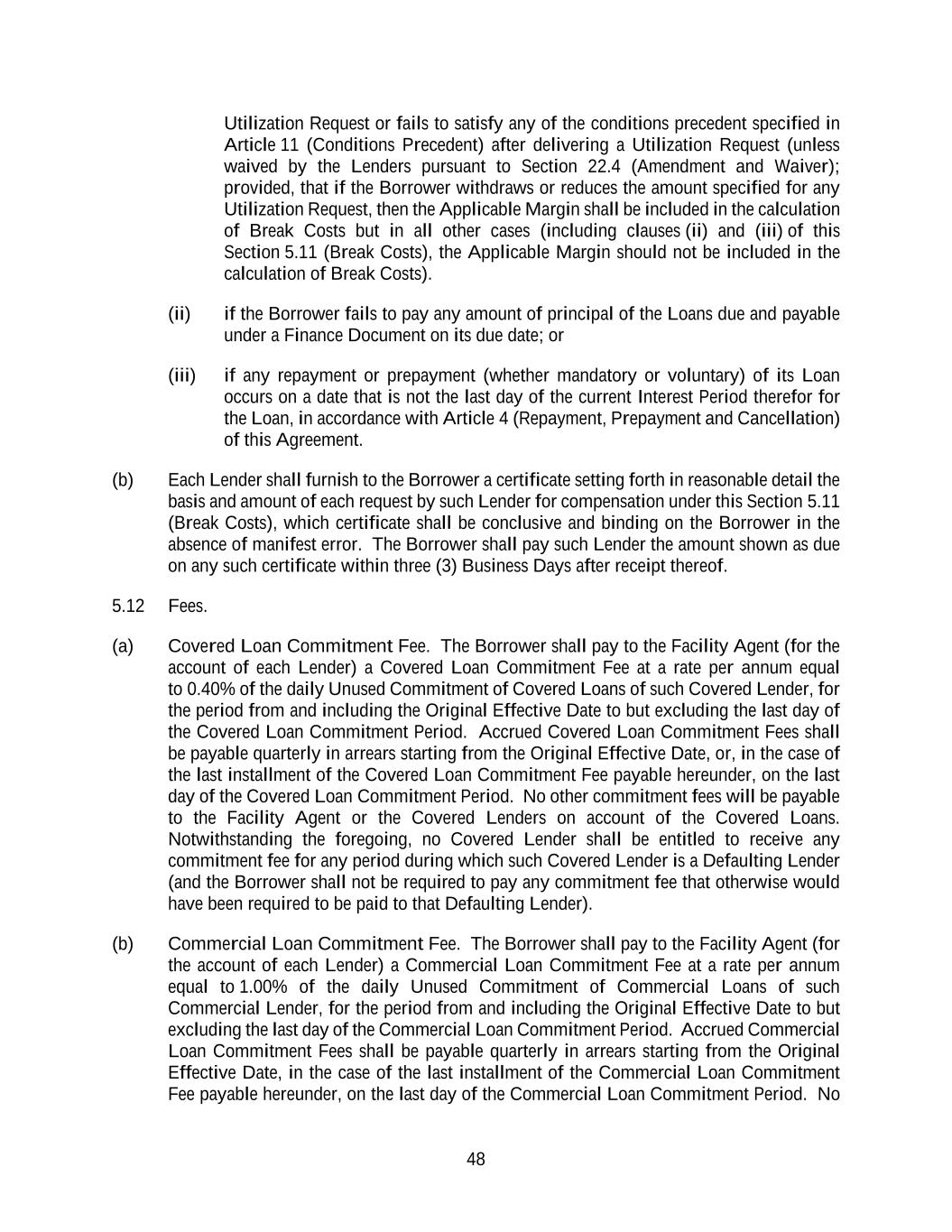 48 Utilization Request or fails to satisfy any of the conditions precedent specified in Article 11 (Conditions Precedent) after delivering a Utilization Request (unless waived by the Lenders pursuant to Section 22.4 (Amendment and Waiver); provided, that if the Borrower withdraws or reduces the amount specified for any Utilization Request, then the Applicable Margin shall be included in the calculation of Break Costs but in all other cases (including clauses (ii) and (iii) of this Section 5.11 (Break Costs), the Applicable Margin should not be included in the calculation of Break Costs). (ii) if the Borrower fails to pay any amount of principal of the Loans due and payable under a Finance Document on its due date; or (iii) if any repayment or prepayment (whether mandatory or voluntary) of its Loan occurs on a date that is not the last day of the current Interest Period therefor for the Loan, in accordance with Article 4 (Repayment, Prepayment and Cancellation) of this Agreement. (b) Each Lender shall furnish to the Borrower a certificate setting forth in reasonable detail the basis and amount of each request by such Lender for compensation under this Section 5.11 (Break Costs), which certificate shall be conclusive and binding on the Borrower in the absence of manifest error. The Borrower shall pay such Lender the amount shown as due on any such certificate within three (3) Business Days after receipt thereof. 5.12 Fees. (a) Covered Loan Commitment Fee. The Borrower shall pay to the Facility Agent (for the account of each Lender) a Covered Loan Commitment Fee at a rate per annum equal to 0.40% of the daily Unused Commitment of Covered Loans of such Covered Lender, for the period from and including the Original Effective Date to but excluding the last day of the Covered Loan Commitment Period. Accrued Covered Loan Commitment Fees shall be payable quarterly in arrears starting from the Original Effective Date, or, in the case of the last installment of the Covered Loan Commitment Fee payable hereunder, on the last day of the Covered Loan Commitment Period. No other commitment fees will be payable to the Facility Agent or the Covered Lenders on account of the Covered Loans. Notwithstanding the foregoing, no Covered Lender shall be entitled to receive any commitment fee for any period during which such Covered Lender is a Defaulting Lender (and the Borrower shall not be required to pay any commitment fee that otherwise would have been required to be paid to that Defaulting Lender). (b) Commercial Loan Commitment Fee. The Borrower shall pay to the Facility Agent (for the account of each Lender) a Commercial Loan Commitment Fee at a rate per annum equal to 1.00% of the daily Unused Commitment of Commercial Loans of such Commercial Lender, for the period from and including the Original Effective Date to but excluding the last day of the Commercial Loan Commitment Period. Accrued Commercial Loan Commitment Fees shall be payable quarterly in arrears starting from the Original Effective Date, in the case of the last installment of the Commercial Loan Commitment Fee payable hereunder, on the last day of the Commercial Loan Commitment Period. No