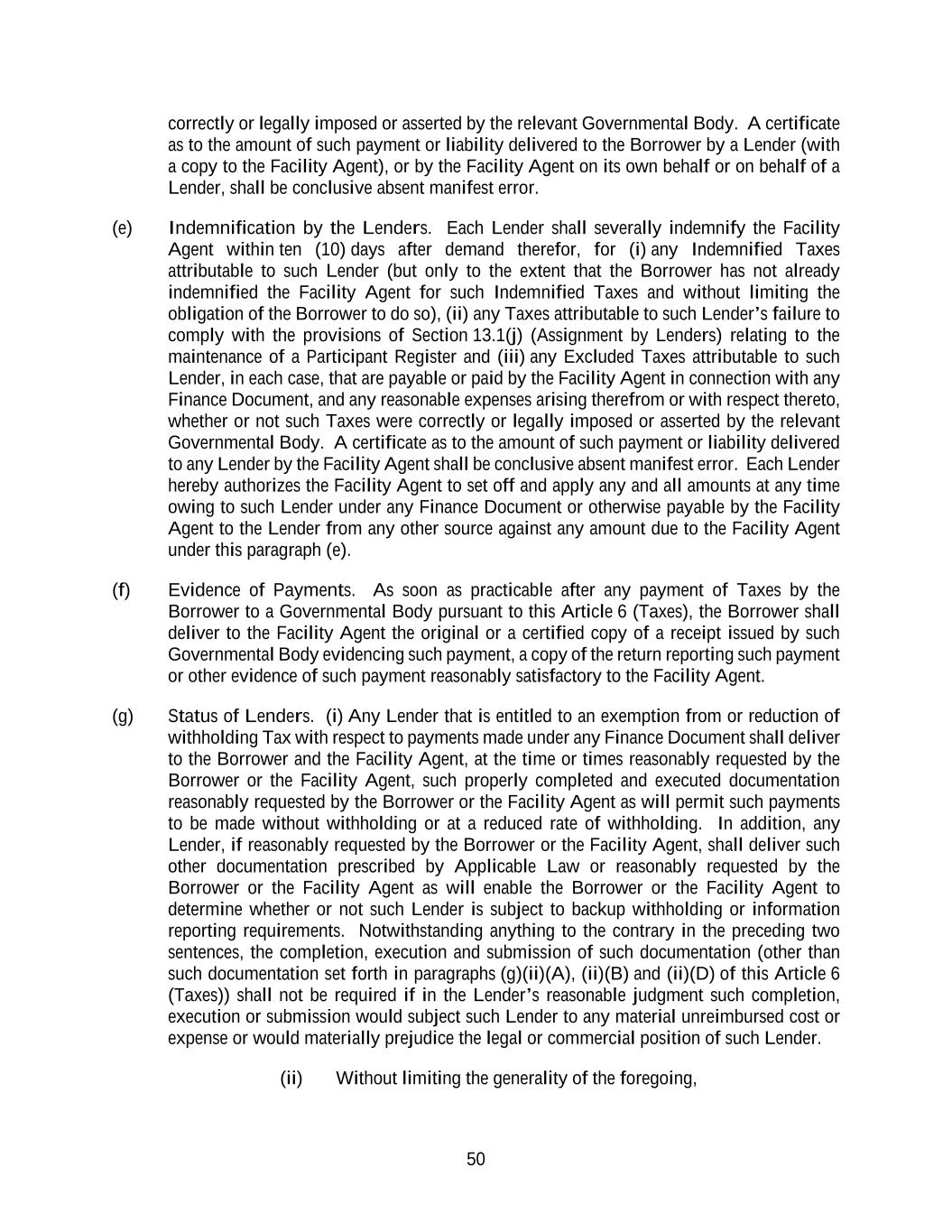 50 correctly or legally imposed or asserted by the relevant Governmental Body. A certificate as to the amount of such payment or liability delivered to the Borrower by a Lender (with a copy to the Facility Agent), or by the Facility Agent on its own behalf or on behalf of a Lender, shall be conclusive absent manifest error. (e) Indemnification by the Lenders. Each Lender shall severally indemnify the Facility Agent within ten (10) days after demand therefor, for (i) any Indemnified Taxes attributable to such Lender (but only to the extent that the Borrower has not already indemnified the Facility Agent for such Indemnified Taxes and without limiting the obligation of the Borrower to do so), (ii) any Taxes attributable to such Lender’s failure to comply with the provisions of Section 13.1(j) (Assignment by Lenders) relating to the maintenance of a Participant Register and (iii) any Excluded Taxes attributable to such Lender, in each case, that are payable or paid by the Facility Agent in connection with any Finance Document, and any reasonable expenses arising therefrom or with respect thereto, whether or not such Taxes were correctly or legally imposed or asserted by the relevant Governmental Body. A certificate as to the amount of such payment or liability delivered to any Lender by the Facility Agent shall be conclusive absent manifest error. Each Lender hereby authorizes the Facility Agent to set off and apply any and all amounts at any time owing to such Lender under any Finance Document or otherwise payable by the Facility Agent to the Lender from any other source against any amount due to the Facility Agent under this paragraph (e). (f) Evidence of Payments. As soon as practicable after any payment of Taxes by the Borrower to a Governmental Body pursuant to this Article 6 (Taxes), the Borrower shall deliver to the Facility Agent the original or a certified copy of a receipt issued by such Governmental Body evidencing such payment, a copy of the return reporting such payment or other evidence of such payment reasonably satisfactory to the Facility Agent. (g) Status of Lenders. (i) Any Lender that is entitled to an exemption from or reduction of withholding Tax with respect to payments made under any Finance Document shall deliver to the Borrower and the Facility Agent, at the time or times reasonably requested by the Borrower or the Facility Agent, such properly completed and executed documentation reasonably requested by the Borrower or the Facility Agent as will permit such payments to be made without withholding or at a reduced rate of withholding. In addition, any Lender, if reasonably requested by the Borrower or the Facility Agent, shall deliver such other documentation prescribed by Applicable Law or reasonably requested by the Borrower or the Facility Agent as will enable the Borrower or the Facility Agent to determine whether or not such Lender is subject to backup withholding or information reporting requirements. Notwithstanding anything to the contrary in the preceding two sentences, the completion, execution and submission of such documentation (other than such documentation set forth in paragraphs (g)(ii)(A), (ii)(B) and (ii)(D) of this Article 6 (Taxes)) shall not be required if in the Lender’s reasonable judgment such completion, execution or submission would subject such Lender to any material unreimbursed cost or expense or would materially prejudice the legal or commercial position of such Lender. (ii) Without limiting the generality of the foregoing,