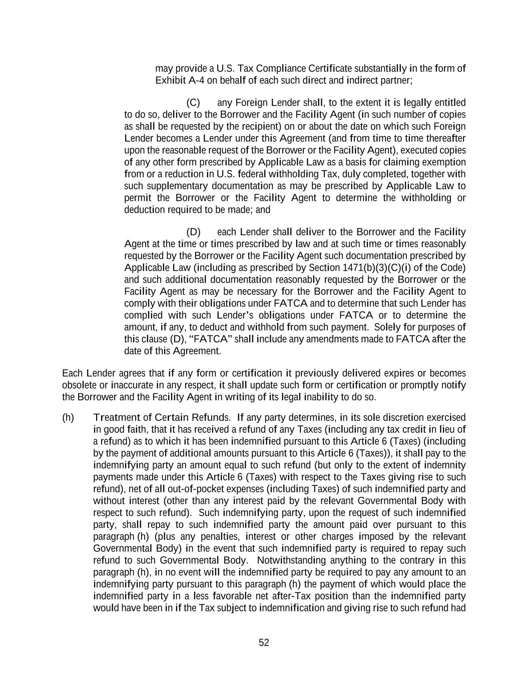 52 may provide a U.S. Tax Compliance Certificate substantially in the form of Exhibit A-4 on behalf of each such direct and indirect partner; (C) any Foreign Lender shall, to the extent it is legally entitled to do so, deliver to the Borrower and the Facility Agent (in such number of copies as shall be requested by the recipient) on or about the date on which such Foreign Lender becomes a Lender under this Agreement (and from time to time thereafter upon the reasonable request of the Borrower or the Facility Agent), executed copies of any other form prescribed by Applicable Law as a basis for claiming exemption from or a reduction in U.S. federal withholding Tax, duly completed, together with such supplementary documentation as may be prescribed by Applicable Law to permit the Borrower or the Facility Agent to determine the withholding or deduction required to be made; and (D) each Lender shall deliver to the Borrower and the Facility Agent at the time or times prescribed by law and at such time or times reasonably requested by the Borrower or the Facility Agent such documentation prescribed by Applicable Law (including as prescribed by Section 1471(b)(3)(C)(i) of the Code) and such additional documentation reasonably requested by the Borrower or the Facility Agent as may be necessary for the Borrower and the Facility Agent to comply with their obligations under FATCA and to determine that such Lender has complied with such Lender’s obligations under FATCA or to determine the amount, if any, to deduct and withhold from such payment. Solely for purposes of this clause (D), “FATCA” shall include any amendments made to FATCA after the date of this Agreement. Each Lender agrees that if any form or certification it previously delivered expires or becomes obsolete or inaccurate in any respect, it shall update such form or certification or promptly notify the Borrower and the Facility Agent in writing of its legal inability to do so. (h) Treatment of Certain Refunds. If any party determines, in its sole discretion exercised in good faith, that it has received a refund of any Taxes (including any tax credit in lieu of a refund) as to which it has been indemnified pursuant to this Article 6 (Taxes) (including by the payment of additional amounts pursuant to this Article 6 (Taxes)), it shall pay to the indemnifying party an amount equal to such refund (but only to the extent of indemnity payments made under this Article 6 (Taxes) with respect to the Taxes giving rise to such refund), net of all out-of-pocket expenses (including Taxes) of such indemnified party and without interest (other than any interest paid by the relevant Governmental Body with respect to such refund). Such indemnifying party, upon the request of such indemnified party, shall repay to such indemnified party the amount paid over pursuant to this paragraph (h) (plus any penalties, interest or other charges imposed by the relevant Governmental Body) in the event that such indemnified party is required to repay such refund to such Governmental Body. Notwithstanding anything to the contrary in this paragraph (h), in no event will the indemnified party be required to pay any amount to an indemnifying party pursuant to this paragraph (h) the payment of which would place the indemnified party in a less favorable net after-Tax position than the indemnified party would have been in if the Tax subject to indemnification and giving rise to such refund had