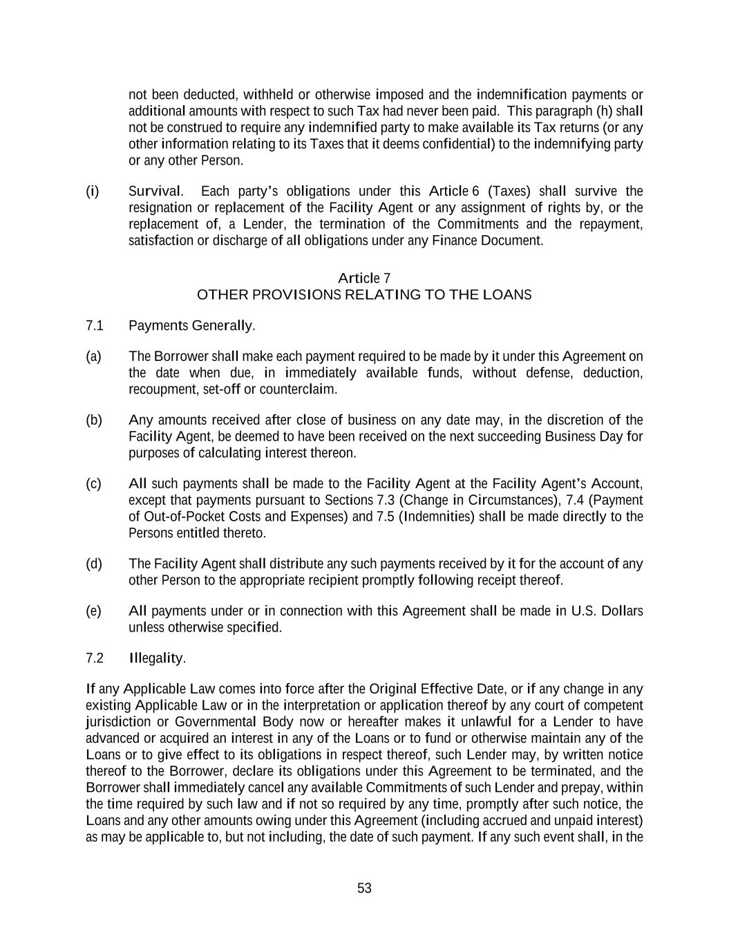 53 not been deducted, withheld or otherwise imposed and the indemnification payments or additional amounts with respect to such Tax had never been paid. This paragraph (h) shall not be construed to require any indemnified party to make available its Tax returns (or any other information relating to its Taxes that it deems confidential) to the indemnifying party or any other Person. (i) Survival. Each party’s obligations under this Article 6 (Taxes) shall survive the resignation or replacement of the Facility Agent or any assignment of rights by, or the replacement of, a Lender, the termination of the Commitments and the repayment, satisfaction or discharge of all obligations under any Finance Document. Article 7 OTHER PROVISIONS RELATING TO THE LOANS 7.1 Payments Generally. (a) The Borrower shall make each payment required to be made by it under this Agreement on the date when due, in immediately available funds, without defense, deduction, recoupment, set-off or counterclaim. (b) Any amounts received after close of business on any date may, in the discretion of the Facility Agent, be deemed to have been received on the next succeeding Business Day for purposes of calculating interest thereon. (c) All such payments shall be made to the Facility Agent at the Facility Agent’s Account, except that payments pursuant to Sections 7.3 (Change in Circumstances), 7.4 (Payment of Out-of-Pocket Costs and Expenses) and 7.5 (Indemnities) shall be made directly to the Persons entitled thereto. (d) The Facility Agent shall distribute any such payments received by it for the account of any other Person to the appropriate recipient promptly following receipt thereof. (e) All payments under or in connection with this Agreement shall be made in U.S. Dollars unless otherwise specified. 7.2 Illegality. If any Applicable Law comes into force after the Original Effective Date, or if any change in any existing Applicable Law or in the interpretation or application thereof by any court of competent jurisdiction or Governmental Body now or hereafter makes it unlawful for a Lender to have advanced or acquired an interest in any of the Loans or to fund or otherwise maintain any of the Loans or to give effect to its obligations in respect thereof, such Lender may, by written notice thereof to the Borrower, declare its obligations under this Agreement to be terminated, and the Borrower shall immediately cancel any available Commitments of such Lender and prepay, within the time required by such law and if not so required by any time, promptly after such notice, the Loans and any other amounts owing under this Agreement (including accrued and unpaid interest) as may be applicable to, but not including, the date of such payment. If any such event shall, in the