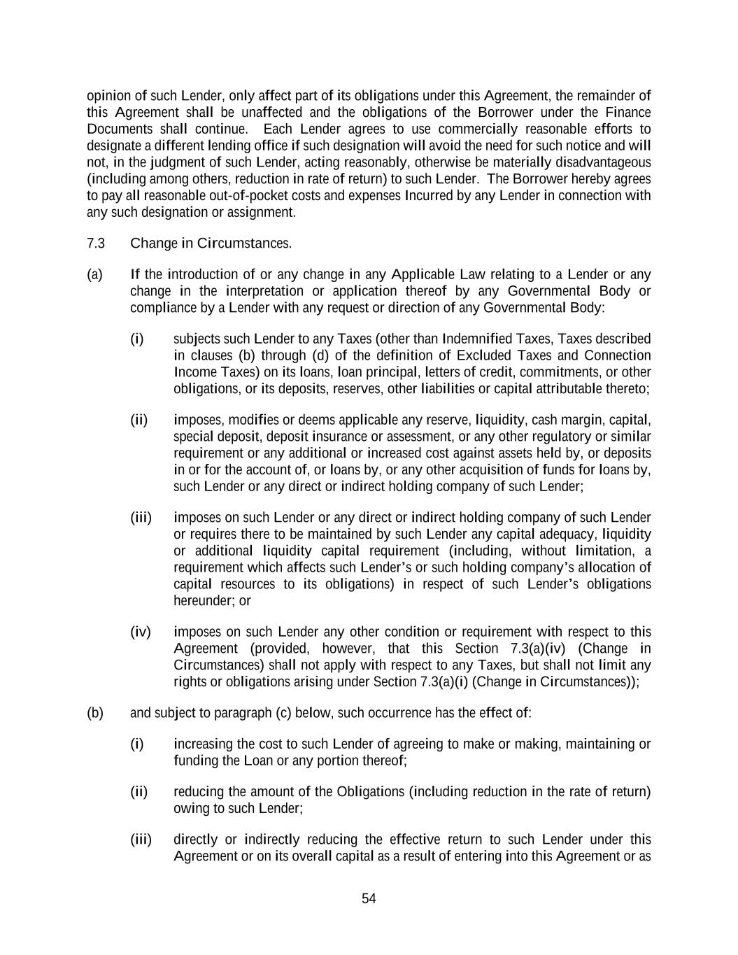54 opinion of such Lender, only affect part of its obligations under this Agreement, the remainder of this Agreement shall be unaffected and the obligations of the Borrower under the Finance Documents shall continue. Each Lender agrees to use commercially reasonable efforts to designate a different lending office if such designation will avoid the need for such notice and will not, in the judgment of such Lender, acting reasonably, otherwise be materially disadvantageous (including among others, reduction in rate of return) to such Lender. The Borrower hereby agrees to pay all reasonable out-of-pocket costs and expenses Incurred by any Lender in connection with any such designation or assignment. 7.3 Change in Circumstances. (a) If the introduction of or any change in any Applicable Law relating to a Lender or any change in the interpretation or application thereof by any Governmental Body or compliance by a Lender with any request or direction of any Governmental Body: (i) subjects such Lender to any Taxes (other than Indemnified Taxes, Taxes described in clauses (b) through (d) of the definition of Excluded Taxes and Connection Income Taxes) on its loans, loan principal, letters of credit, commitments, or other obligations, or its deposits, reserves, other liabilities or capital attributable thereto; (ii) imposes, modifies or deems applicable any reserve, liquidity, cash margin, capital, special deposit, deposit insurance or assessment, or any other regulatory or similar requirement or any additional or increased cost against assets held by, or deposits in or for the account of, or loans by, or any other acquisition of funds for loans by, such Lender or any direct or indirect holding company of such Lender; (iii) imposes on such Lender or any direct or indirect holding company of such Lender or requires there to be maintained by such Lender any capital adequacy, liquidity or additional liquidity capital requirement (including, without limitation, a requirement which affects such Lender’s or such holding company’s allocation of capital resources to its obligations) in respect of such Lender’s obligations hereunder; or (iv) imposes on such Lender any other condition or requirement with respect to this Agreement (provided, however, that this Section 7.3(a)(iv) (Change in Circumstances) shall not apply with respect to any Taxes, but shall not limit any rights or obligations arising under Section 7.3(a)(i) (Change in Circumstances)); (b) and subject to paragraph (c) below, such occurrence has the effect of: (i) increasing the cost to such Lender of agreeing to make or making, maintaining or funding the Loan or any portion thereof; (ii) reducing the amount of the Obligations (including reduction in the rate of return) owing to such Lender; (iii) directly or indirectly reducing the effective return to such Lender under this Agreement or on its overall capital as a result of entering into this Agreement or as