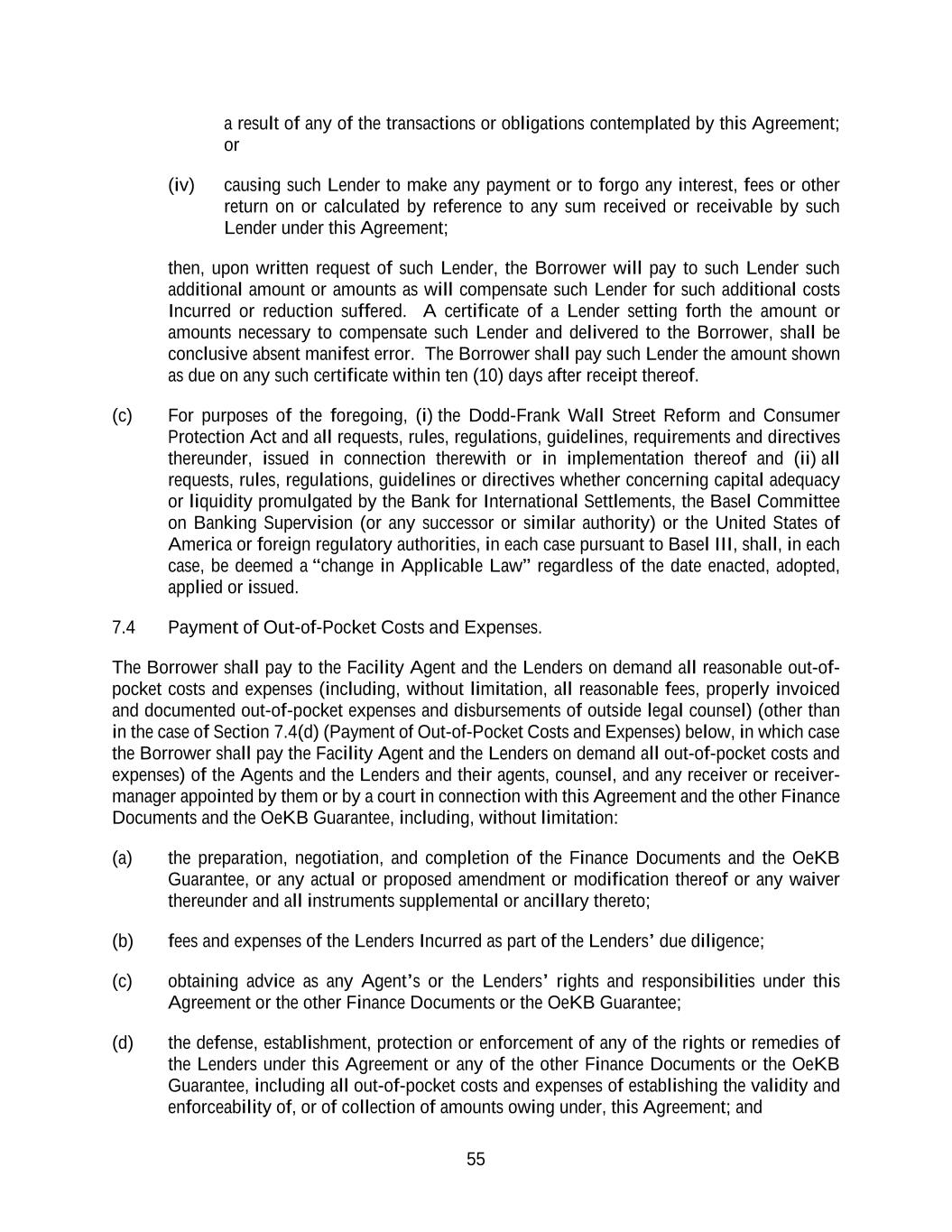 55 a result of any of the transactions or obligations contemplated by this Agreement; or (iv) causing such Lender to make any payment or to forgo any interest, fees or other return on or calculated by reference to any sum received or receivable by such Lender under this Agreement; then, upon written request of such Lender, the Borrower will pay to such Lender such additional amount or amounts as will compensate such Lender for such additional costs Incurred or reduction suffered. A certificate of a Lender setting forth the amount or amounts necessary to compensate such Lender and delivered to the Borrower, shall be conclusive absent manifest error. The Borrower shall pay such Lender the amount shown as due on any such certificate within ten (10) days after receipt thereof. (c) For purposes of the foregoing, (i) the Dodd-Frank Wall Street Reform and Consumer Protection Act and all requests, rules, regulations, guidelines, requirements and directives thereunder, issued in connection therewith or in implementation thereof and (ii) all requests, rules, regulations, guidelines or directives whether concerning capital adequacy or liquidity promulgated by the Bank for International Settlements, the Basel Committee on Banking Supervision (or any successor or similar authority) or the United States of America or foreign regulatory authorities, in each case pursuant to Basel III, shall, in each case, be deemed a “change in Applicable Law” regardless of the date enacted, adopted, applied or issued. 7.4 Payment of Out-of-Pocket Costs and Expenses. The Borrower shall pay to the Facility Agent and the Lenders on demand all reasonable out-of- pocket costs and expenses (including, without limitation, all reasonable fees, properly invoiced and documented out-of-pocket expenses and disbursements of outside legal counsel) (other than in the case of Section 7.4(d) (Payment of Out-of-Pocket Costs and Expenses) below, in which case the Borrower shall pay the Facility Agent and the Lenders on demand all out-of-pocket costs and expenses) of the Agents and the Lenders and their agents, counsel, and any receiver or receiver- manager appointed by them or by a court in connection with this Agreement and the other Finance Documents and the OeKB Guarantee, including, without limitation: (a) the preparation, negotiation, and completion of the Finance Documents and the OeKB Guarantee, or any actual or proposed amendment or modification thereof or any waiver thereunder and all instruments supplemental or ancillary thereto; (b) fees and expenses of the Lenders Incurred as part of the Lenders’ due diligence; (c) obtaining advice as any Agent’s or the Lenders’ rights and responsibilities under this Agreement or the other Finance Documents or the OeKB Guarantee; (d) the defense, establishment, protection or enforcement of any of the rights or remedies of the Lenders under this Agreement or any of the other Finance Documents or the OeKB Guarantee, including all out-of-pocket costs and expenses of establishing the validity and enforceability of, or of collection of amounts owing under, this Agreement; and