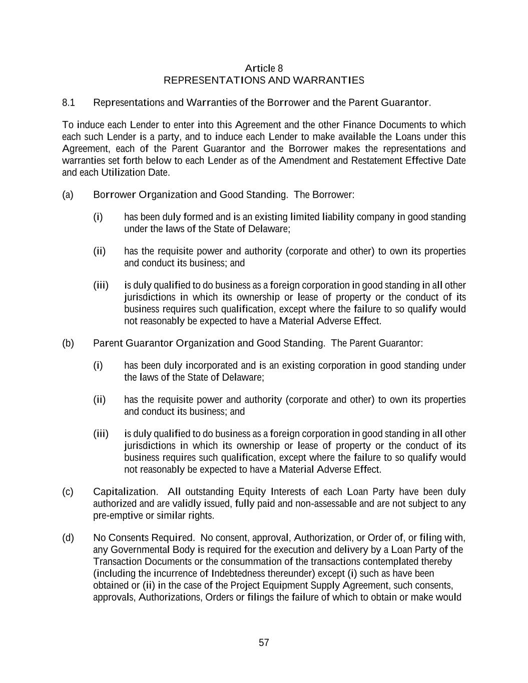 57 Article 8 REPRESENTATIONS AND WARRANTIES 8.1 Representations and Warranties of the Borrower and the Parent Guarantor. To induce each Lender to enter into this Agreement and the other Finance Documents to which each such Lender is a party, and to induce each Lender to make available the Loans under this Agreement, each of the Parent Guarantor and the Borrower makes the representations and warranties set forth below to each Lender as of the Amendment and Restatement Effective Date and each Utilization Date. (a) Borrower Organization and Good Standing. The Borrower: (i) has been duly formed and is an existing limited liability company in good standing under the laws of the State of Delaware; (ii) has the requisite power and authority (corporate and other) to own its properties and conduct its business; and (iii) is duly qualified to do business as a foreign corporation in good standing in all other jurisdictions in which its ownership or lease of property or the conduct of its business requires such qualification, except where the failure to so qualify would not reasonably be expected to have a Material Adverse Effect. (b) Parent Guarantor Organization and Good Standing. The Parent Guarantor: (i) has been duly incorporated and is an existing corporation in good standing under the laws of the State of Delaware; (ii) has the requisite power and authority (corporate and other) to own its properties and conduct its business; and (iii) is duly qualified to do business as a foreign corporation in good standing in all other jurisdictions in which its ownership or lease of property or the conduct of its business requires such qualification, except where the failure to so qualify would not reasonably be expected to have a Material Adverse Effect. (c) Capitalization. All outstanding Equity Interests of each Loan Party have been duly authorized and are validly issued, fully paid and non-assessable and are not subject to any pre-emptive or similar rights. (d) No Consents Required. No consent, approval, Authorization, or Order of, or filing with, any Governmental Body is required for the execution and delivery by a Loan Party of the Transaction Documents or the consummation of the transactions contemplated thereby (including the incurrence of Indebtedness thereunder) except (i) such as have been obtained or (ii) in the case of the Project Equipment Supply Agreement, such consents, approvals, Authorizations, Orders or filings the failure of which to obtain or make would