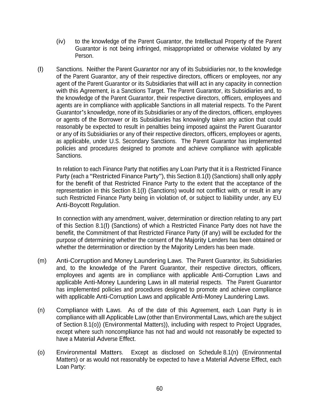 60 (iv) to the knowledge of the Parent Guarantor, the Intellectual Property of the Parent Guarantor is not being infringed, misappropriated or otherwise violated by any Person. (l) Sanctions. Neither the Parent Guarantor nor any of its Subsidiaries nor, to the knowledge of the Parent Guarantor, any of their respective directors, officers or employees, nor any agent of the Parent Guarantor or its Subsidiaries that will act in any capacity in connection with this Agreement, is a Sanctions Target. The Parent Guarantor, its Subsidiaries and, to the knowledge of the Parent Guarantor, their respective directors, officers, employees and agents are in compliance with applicable Sanctions in all material respects. To the Parent Guarantor’s knowledge, none of its Subsidiaries or any of the directors, officers, employees or agents of the Borrower or its Subsidiaries has knowingly taken any action that could reasonably be expected to result in penalties being imposed against the Parent Guarantor or any of its Subsidiaries or any of their respective directors, officers, employees or agents, as applicable, under U.S. Secondary Sanctions. The Parent Guarantor has implemented policies and procedures designed to promote and achieve compliance with applicable Sanctions. In relation to each Finance Party that notifies any Loan Party that it is a Restricted Finance Party (each a “Restricted Finance Party”), this Section 8.1(l) (Sanctions) shall only apply for the benefit of that Restricted Finance Party to the extent that the acceptance of the representation in this Section 8.1(l) (Sanctions) would not conflict with, or result in any such Restricted Finance Party being in violation of, or subject to liability under, any EU Anti-Boycott Regulation. In connection with any amendment, waiver, determination or direction relating to any part of this Section 8.1(l) (Sanctions) of which a Restricted Finance Party does not have the benefit, the Commitment of that Restricted Finance Party (if any) will be excluded for the purpose of determining whether the consent of the Majority Lenders has been obtained or whether the determination or direction by the Majority Lenders has been made. (m) Anti-Corruption and Money Laundering Laws. The Parent Guarantor, its Subsidiaries and, to the knowledge of the Parent Guarantor, their respective directors, officers, employees and agents are in compliance with applicable Anti-Corruption Laws and applicable Anti-Money Laundering Laws in all material respects. The Parent Guarantor has implemented policies and procedures designed to promote and achieve compliance with applicable Anti-Corruption Laws and applicable Anti-Money Laundering Laws. (n) Compliance with Laws. As of the date of this Agreement, each Loan Party is in compliance with all Applicable Law (other than Environmental Laws, which are the subject of Section 8.1(o)) (Environmental Matters)), including with respect to Project Upgrades, except where such noncompliance has not had and would not reasonably be expected to have a Material Adverse Effect. (o) Environmental Matters. Except as disclosed on Schedule 8.1(n) (Environmental Matters) or as would not reasonably be expected to have a Material Adverse Effect, each Loan Party: