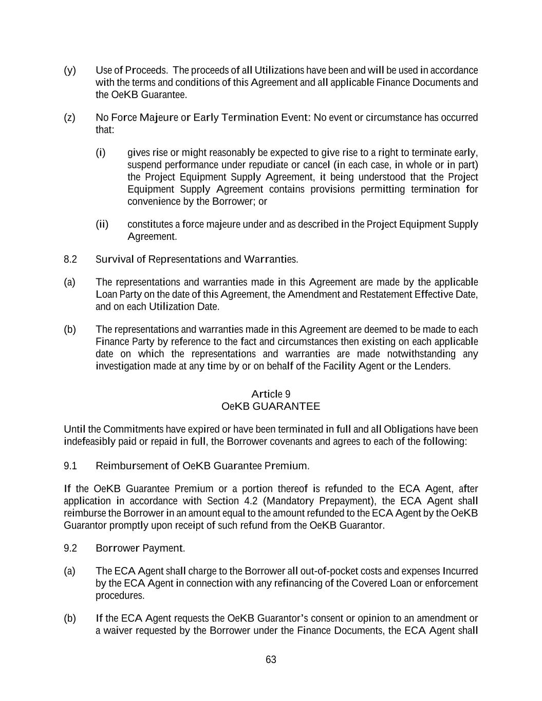 63 (y) Use of Proceeds. The proceeds of all Utilizations have been and will be used in accordance with the terms and conditions of this Agreement and all applicable Finance Documents and the OeKB Guarantee. (z) No Force Majeure or Early Termination Event: No event or circumstance has occurred that: (i) gives rise or might reasonably be expected to give rise to a right to terminate early, suspend performance under repudiate or cancel (in each case, in whole or in part) the Project Equipment Supply Agreement, it being understood that the Project Equipment Supply Agreement contains provisions permitting termination for convenience by the Borrower; or (ii) constitutes a force majeure under and as described in the Project Equipment Supply Agreement. 8.2 Survival of Representations and Warranties. (a) The representations and warranties made in this Agreement are made by the applicable Loan Party on the date of this Agreement, the Amendment and Restatement Effective Date, and on each Utilization Date. (b) The representations and warranties made in this Agreement are deemed to be made to each Finance Party by reference to the fact and circumstances then existing on each applicable date on which the representations and warranties are made notwithstanding any investigation made at any time by or on behalf of the Facility Agent or the Lenders. Article 9 OeKB GUARANTEE Until the Commitments have expired or have been terminated in full and all Obligations have been indefeasibly paid or repaid in full, the Borrower covenants and agrees to each of the following: 9.1 Reimbursement of OeKB Guarantee Premium. If the OeKB Guarantee Premium or a portion thereof is refunded to the ECA Agent, after application in accordance with Section 4.2 (Mandatory Prepayment), the ECA Agent shall reimburse the Borrower in an amount equal to the amount refunded to the ECA Agent by the OeKB Guarantor promptly upon receipt of such refund from the OeKB Guarantor. 9.2 Borrower Payment. (a) The ECA Agent shall charge to the Borrower all out-of-pocket costs and expenses Incurred by the ECA Agent in connection with any refinancing of the Covered Loan or enforcement procedures. (b) If the ECA Agent requests the OeKB Guarantor’s consent or opinion to an amendment or a waiver requested by the Borrower under the Finance Documents, the ECA Agent shall