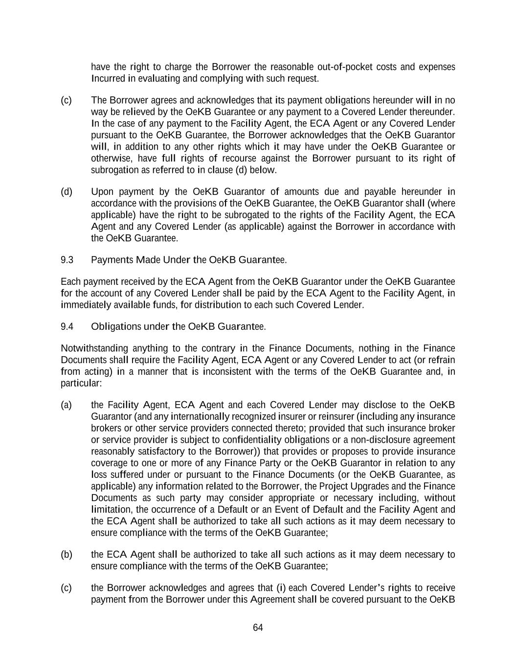 64 have the right to charge the Borrower the reasonable out-of-pocket costs and expenses Incurred in evaluating and complying with such request. (c) The Borrower agrees and acknowledges that its payment obligations hereunder will in no way be relieved by the OeKB Guarantee or any payment to a Covered Lender thereunder. In the case of any payment to the Facility Agent, the ECA Agent or any Covered Lender pursuant to the OeKB Guarantee, the Borrower acknowledges that the OeKB Guarantor will, in addition to any other rights which it may have under the OeKB Guarantee or otherwise, have full rights of recourse against the Borrower pursuant to its right of subrogation as referred to in clause (d) below. (d) Upon payment by the OeKB Guarantor of amounts due and payable hereunder in accordance with the provisions of the OeKB Guarantee, the OeKB Guarantor shall (where applicable) have the right to be subrogated to the rights of the Facility Agent, the ECA Agent and any Covered Lender (as applicable) against the Borrower in accordance with the OeKB Guarantee. 9.3 Payments Made Under the OeKB Guarantee. Each payment received by the ECA Agent from the OeKB Guarantor under the OeKB Guarantee for the account of any Covered Lender shall be paid by the ECA Agent to the Facility Agent, in immediately available funds, for distribution to each such Covered Lender. 9.4 Obligations under the OeKB Guarantee. Notwithstanding anything to the contrary in the Finance Documents, nothing in the Finance Documents shall require the Facility Agent, ECA Agent or any Covered Lender to act (or refrain from acting) in a manner that is inconsistent with the terms of the OeKB Guarantee and, in particular: (a) the Facility Agent, ECA Agent and each Covered Lender may disclose to the OeKB Guarantor (and any internationally recognized insurer or reinsurer (including any insurance brokers or other service providers connected thereto; provided that such insurance broker or service provider is subject to confidentiality obligations or a non-disclosure agreement reasonably satisfactory to the Borrower)) that provides or proposes to provide insurance coverage to one or more of any Finance Party or the OeKB Guarantor in relation to any loss suffered under or pursuant to the Finance Documents (or the OeKB Guarantee, as applicable) any information related to the Borrower, the Project Upgrades and the Finance Documents as such party may consider appropriate or necessary including, without limitation, the occurrence of a Default or an Event of Default and the Facility Agent and the ECA Agent shall be authorized to take all such actions as it may deem necessary to ensure compliance with the terms of the OeKB Guarantee; (b) the ECA Agent shall be authorized to take all such actions as it may deem necessary to ensure compliance with the terms of the OeKB Guarantee; (c) the Borrower acknowledges and agrees that (i) each Covered Lender’s rights to receive payment from the Borrower under this Agreement shall be covered pursuant to the OeKB