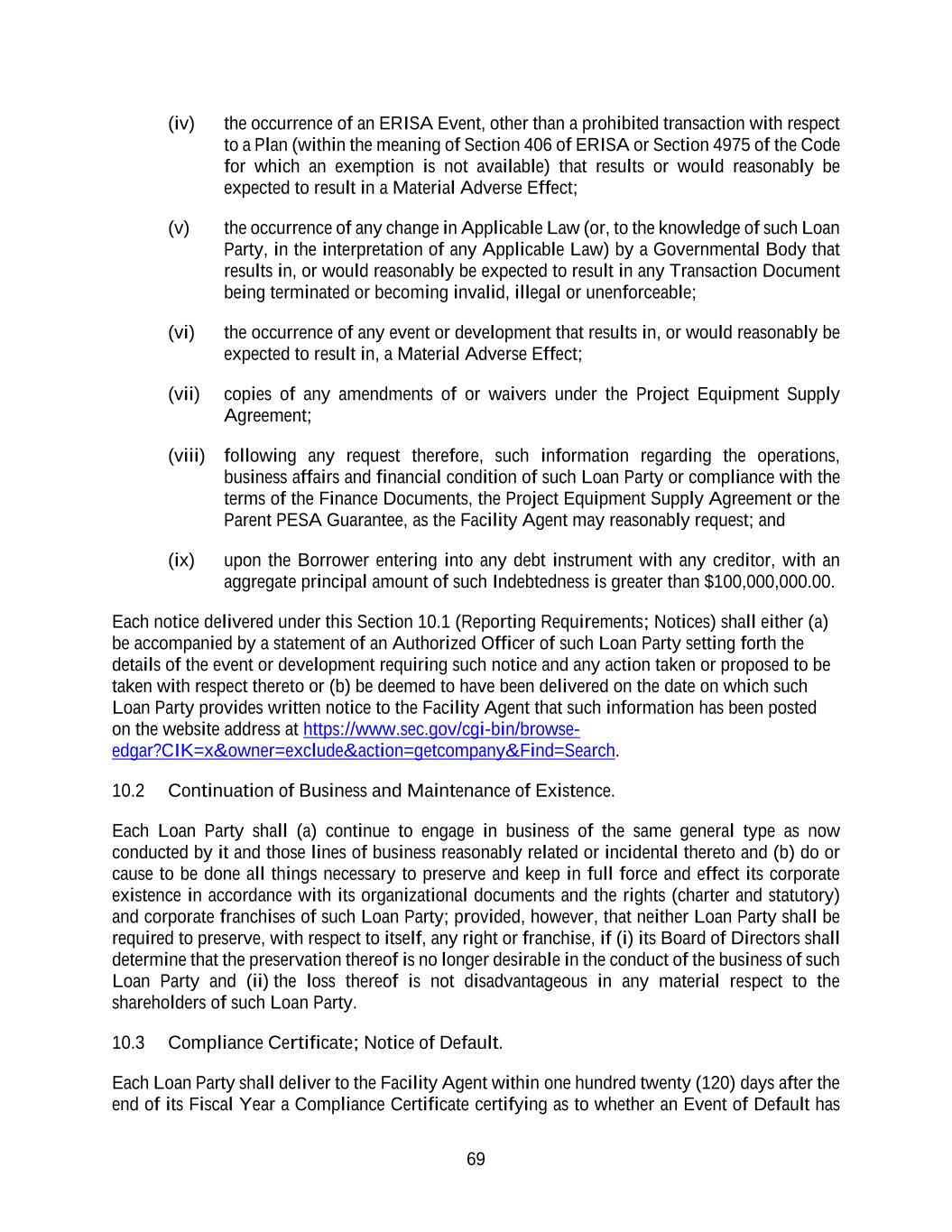 69 (iv) the occurrence of an ERISA Event, other than a prohibited transaction with respect to a Plan (within the meaning of Section 406 of ERISA or Section 4975 of the Code for which an exemption is not available) that results or would reasonably be expected to result in a Material Adverse Effect; (v) the occurrence of any change in Applicable Law (or, to the knowledge of such Loan Party, in the interpretation of any Applicable Law) by a Governmental Body that results in, or would reasonably be expected to result in any Transaction Document being terminated or becoming invalid, illegal or unenforceable; (vi) the occurrence of any event or development that results in, or would reasonably be expected to result in, a Material Adverse Effect; (vii) copies of any amendments of or waivers under the Project Equipment Supply Agreement; (viii) following any request therefore, such information regarding the operations, business affairs and financial condition of such Loan Party or compliance with the terms of the Finance Documents, the Project Equipment Supply Agreement or the Parent PESA Guarantee, as the Facility Agent may reasonably request; and (ix) upon the Borrower entering into any debt instrument with any creditor, with an aggregate principal amount of such Indebtedness is greater than $100,000,000.00. Each notice delivered under this Section 10.1 (Reporting Requirements; Notices) shall either (a) be accompanied by a statement of an Authorized Officer of such Loan Party setting forth the details of the event or development requiring such notice and any action taken or proposed to be taken with respect thereto or (b) be deemed to have been delivered on the date on which such Loan Party provides written notice to the Facility Agent that such information has been posted on the website address at https://www.sec.gov/cgi-bin/browse- edgar?CIK=x&owner=exclude&action=getcompany&Find=Search. 10.2 Continuation of Business and Maintenance of Existence. Each Loan Party shall (a) continue to engage in business of the same general type as now conducted by it and those lines of business reasonably related or incidental thereto and (b) do or cause to be done all things necessary to preserve and keep in full force and effect its corporate existence in accordance with its organizational documents and the rights (charter and statutory) and corporate franchises of such Loan Party; provided, however, that neither Loan Party shall be required to preserve, with respect to itself, any right or franchise, if (i) its Board of Directors shall determine that the preservation thereof is no longer desirable in the conduct of the business of such Loan Party and (ii) the loss thereof is not disadvantageous in any material respect to the shareholders of such Loan Party. 10.3 Compliance Certificate; Notice of Default. Each Loan Party shall deliver to the Facility Agent within one hundred twenty (120) days after the end of its Fiscal Year a Compliance Certificate certifying as to whether an Event of Default has