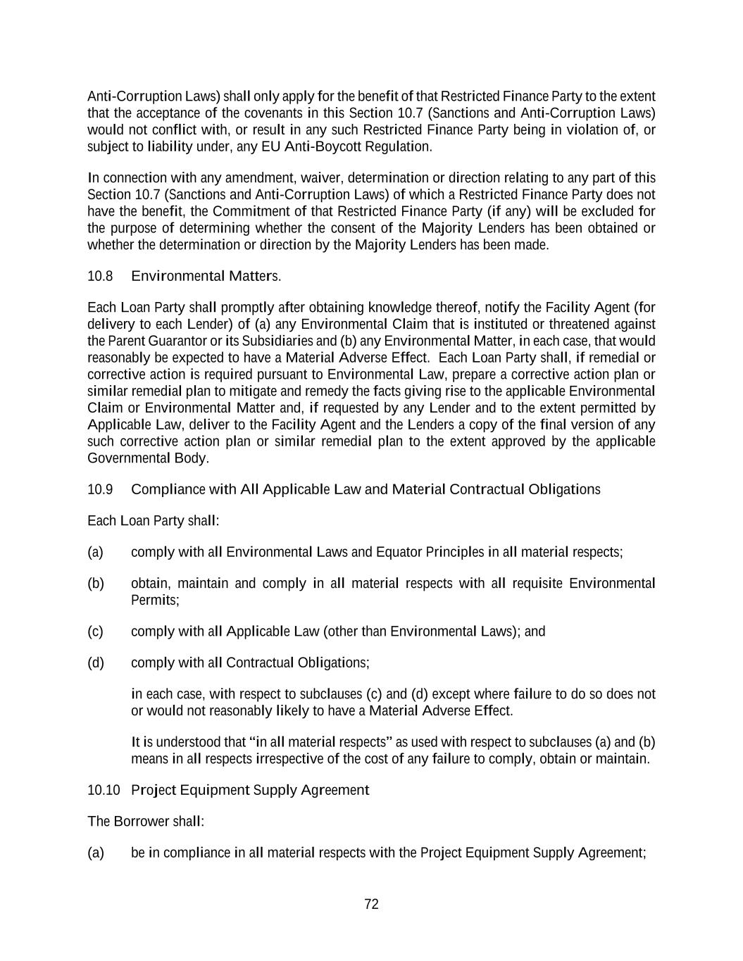 72 Anti-Corruption Laws) shall only apply for the benefit of that Restricted Finance Party to the extent that the acceptance of the covenants in this Section 10.7 (Sanctions and Anti-Corruption Laws) would not conflict with, or result in any such Restricted Finance Party being in violation of, or subject to liability under, any EU Anti-Boycott Regulation. In connection with any amendment, waiver, determination or direction relating to any part of this Section 10.7 (Sanctions and Anti-Corruption Laws) of which a Restricted Finance Party does not have the benefit, the Commitment of that Restricted Finance Party (if any) will be excluded for the purpose of determining whether the consent of the Majority Lenders has been obtained or whether the determination or direction by the Majority Lenders has been made. 10.8 Environmental Matters. Each Loan Party shall promptly after obtaining knowledge thereof, notify the Facility Agent (for delivery to each Lender) of (a) any Environmental Claim that is instituted or threatened against the Parent Guarantor or its Subsidiaries and (b) any Environmental Matter, in each case, that would reasonably be expected to have a Material Adverse Effect. Each Loan Party shall, if remedial or corrective action is required pursuant to Environmental Law, prepare a corrective action plan or similar remedial plan to mitigate and remedy the facts giving rise to the applicable Environmental Claim or Environmental Matter and, if requested by any Lender and to the extent permitted by Applicable Law, deliver to the Facility Agent and the Lenders a copy of the final version of any such corrective action plan or similar remedial plan to the extent approved by the applicable Governmental Body. 10.9 Compliance with All Applicable Law and Material Contractual Obligations Each Loan Party shall: (a) comply with all Environmental Laws and Equator Principles in all material respects; (b) obtain, maintain and comply in all material respects with all requisite Environmental Permits; (c) comply with all Applicable Law (other than Environmental Laws); and (d) comply with all Contractual Obligations; in each case, with respect to subclauses (c) and (d) except where failure to do so does not or would not reasonably likely to have a Material Adverse Effect. It is understood that “in all material respects” as used with respect to subclauses (a) and (b) means in all respects irrespective of the cost of any failure to comply, obtain or maintain. 10.10 Project Equipment Supply Agreement The Borrower shall: (a) be in compliance in all material respects with the Project Equipment Supply Agreement;