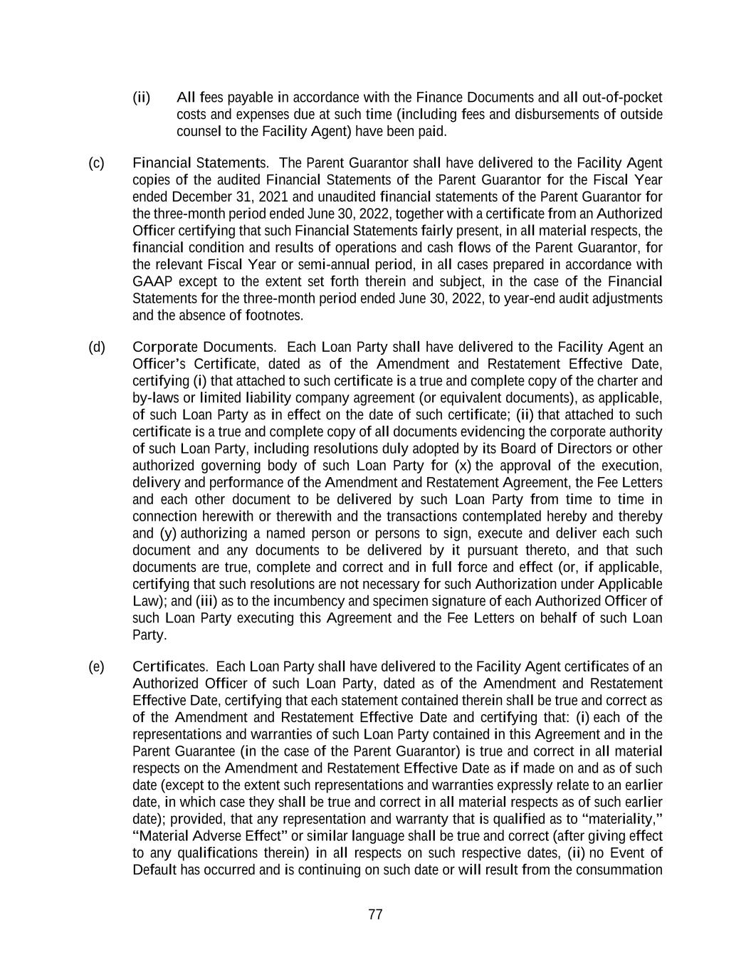 77 (ii) All fees payable in accordance with the Finance Documents and all out-of-pocket costs and expenses due at such time (including fees and disbursements of outside counsel to the Facility Agent) have been paid. (c) Financial Statements. The Parent Guarantor shall have delivered to the Facility Agent copies of the audited Financial Statements of the Parent Guarantor for the Fiscal Year ended December 31, 2021 and unaudited financial statements of the Parent Guarantor for the three-month period ended June 30, 2022, together with a certificate from an Authorized Officer certifying that such Financial Statements fairly present, in all material respects, the financial condition and results of operations and cash flows of the Parent Guarantor, for the relevant Fiscal Year or semi-annual period, in all cases prepared in accordance with GAAP except to the extent set forth therein and subject, in the case of the Financial Statements for the three-month period ended June 30, 2022, to year-end audit adjustments and the absence of footnotes. (d) Corporate Documents. Each Loan Party shall have delivered to the Facility Agent an Officer’s Certificate, dated as of the Amendment and Restatement Effective Date, certifying (i) that attached to such certificate is a true and complete copy of the charter and by-laws or limited liability company agreement (or equivalent documents), as applicable, of such Loan Party as in effect on the date of such certificate; (ii) that attached to such certificate is a true and complete copy of all documents evidencing the corporate authority of such Loan Party, including resolutions duly adopted by its Board of Directors or other authorized governing body of such Loan Party for (x) the approval of the execution, delivery and performance of the Amendment and Restatement Agreement, the Fee Letters and each other document to be delivered by such Loan Party from time to time in connection herewith or therewith and the transactions contemplated hereby and thereby and (y) authorizing a named person or persons to sign, execute and deliver each such document and any documents to be delivered by it pursuant thereto, and that such documents are true, complete and correct and in full force and effect (or, if applicable, certifying that such resolutions are not necessary for such Authorization under Applicable Law); and (iii) as to the incumbency and specimen signature of each Authorized Officer of such Loan Party executing this Agreement and the Fee Letters on behalf of such Loan Party. (e) Certificates. Each Loan Party shall have delivered to the Facility Agent certificates of an Authorized Officer of such Loan Party, dated as of the Amendment and Restatement Effective Date, certifying that each statement contained therein shall be true and correct as of the Amendment and Restatement Effective Date and certifying that: (i) each of the representations and warranties of such Loan Party contained in this Agreement and in the Parent Guarantee (in the case of the Parent Guarantor) is true and correct in all material respects on the Amendment and Restatement Effective Date as if made on and as of such date (except to the extent such representations and warranties expressly relate to an earlier date, in which case they shall be true and correct in all material respects as of such earlier date); provided, that any representation and warranty that is qualified as to “materiality,” “Material Adverse Effect” or similar language shall be true and correct (after giving effect to any qualifications therein) in all respects on such respective dates, (ii) no Event of Default has occurred and is continuing on such date or will result from the consummation