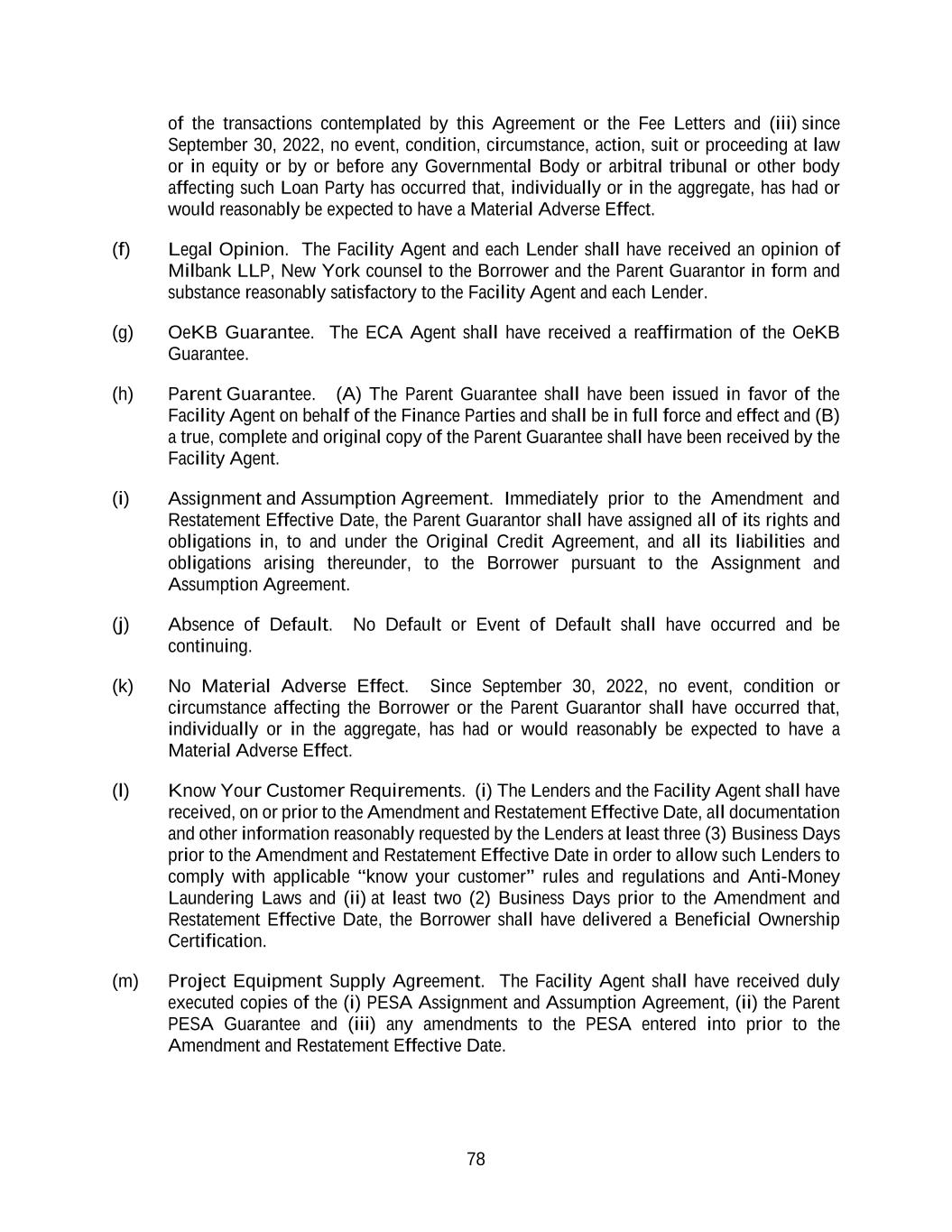 78 of the transactions contemplated by this Agreement or the Fee Letters and (iii) since September 30, 2022, no event, condition, circumstance, action, suit or proceeding at law or in equity or by or before any Governmental Body or arbitral tribunal or other body affecting such Loan Party has occurred that, individually or in the aggregate, has had or would reasonably be expected to have a Material Adverse Effect. (f) Legal Opinion. The Facility Agent and each Lender shall have received an opinion of Milbank LLP, New York counsel to the Borrower and the Parent Guarantor in form and substance reasonably satisfactory to the Facility Agent and each Lender. (g) OeKB Guarantee. The ECA Agent shall have received a reaffirmation of the OeKB Guarantee. (h) Parent Guarantee. (A) The Parent Guarantee shall have been issued in favor of the Facility Agent on behalf of the Finance Parties and shall be in full force and effect and (B) a true, complete and original copy of the Parent Guarantee shall have been received by the Facility Agent. (i) Assignment and Assumption Agreement. Immediately prior to the Amendment and Restatement Effective Date, the Parent Guarantor shall have assigned all of its rights and obligations in, to and under the Original Credit Agreement, and all its liabilities and obligations arising thereunder, to the Borrower pursuant to the Assignment and Assumption Agreement. (j) Absence of Default. No Default or Event of Default shall have occurred and be continuing. (k) No Material Adverse Effect. Since September 30, 2022, no event, condition or circumstance affecting the Borrower or the Parent Guarantor shall have occurred that, individually or in the aggregate, has had or would reasonably be expected to have a Material Adverse Effect. (l) Know Your Customer Requirements. (i) The Lenders and the Facility Agent shall have received, on or prior to the Amendment and Restatement Effective Date, all documentation and other information reasonably requested by the Lenders at least three (3) Business Days prior to the Amendment and Restatement Effective Date in order to allow such Lenders to comply with applicable “know your customer” rules and regulations and Anti-Money Laundering Laws and (ii) at least two (2) Business Days prior to the Amendment and Restatement Effective Date, the Borrower shall have delivered a Beneficial Ownership Certification. (m) Project Equipment Supply Agreement. The Facility Agent shall have received duly executed copies of the (i) PESA Assignment and Assumption Agreement, (ii) the Parent PESA Guarantee and (iii) any amendments to the PESA entered into prior to the Amendment and Restatement Effective Date.