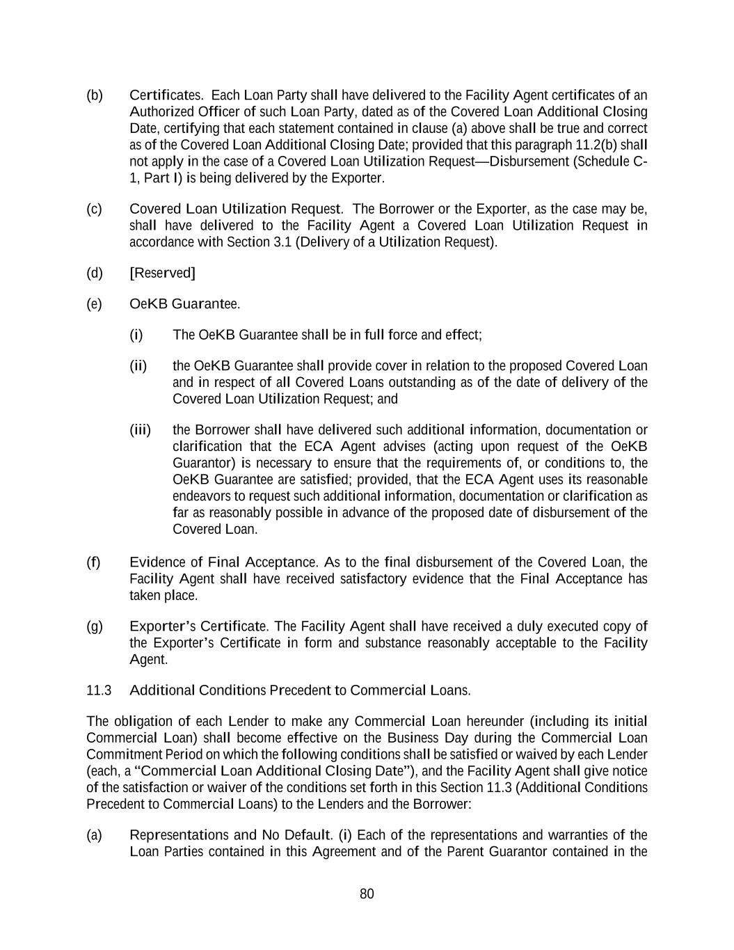 80 (b) Certificates. Each Loan Party shall have delivered to the Facility Agent certificates of an Authorized Officer of such Loan Party, dated as of the Covered Loan Additional Closing Date, certifying that each statement contained in clause (a) above shall be true and correct as of the Covered Loan Additional Closing Date; provided that this paragraph 11.2(b) shall not apply in the case of a Covered Loan Utilization Request—Disbursement (Schedule C- 1, Part I) is being delivered by the Exporter. (c) Covered Loan Utilization Request. The Borrower or the Exporter, as the case may be, shall have delivered to the Facility Agent a Covered Loan Utilization Request in accordance with Section 3.1 (Delivery of a Utilization Request). (d) [Reserved] (e) OeKB Guarantee. (i) The OeKB Guarantee shall be in full force and effect; (ii) the OeKB Guarantee shall provide cover in relation to the proposed Covered Loan and in respect of all Covered Loans outstanding as of the date of delivery of the Covered Loan Utilization Request; and (iii) the Borrower shall have delivered such additional information, documentation or clarification that the ECA Agent advises (acting upon request of the OeKB Guarantor) is necessary to ensure that the requirements of, or conditions to, the OeKB Guarantee are satisfied; provided, that the ECA Agent uses its reasonable endeavors to request such additional information, documentation or clarification as far as reasonably possible in advance of the proposed date of disbursement of the Covered Loan. (f) Evidence of Final Acceptance. As to the final disbursement of the Covered Loan, the Facility Agent shall have received satisfactory evidence that the Final Acceptance has taken place. (g) Exporter’s Certificate. The Facility Agent shall have received a duly executed copy of the Exporter’s Certificate in form and substance reasonably acceptable to the Facility Agent. 11.3 Additional Conditions Precedent to Commercial Loans. The obligation of each Lender to make any Commercial Loan hereunder (including its initial Commercial Loan) shall become effective on the Business Day during the Commercial Loan Commitment Period on which the following conditions shall be satisfied or waived by each Lender (each, a “Commercial Loan Additional Closing Date”), and the Facility Agent shall give notice of the satisfaction or waiver of the conditions set forth in this Section 11.3 (Additional Conditions Precedent to Commercial Loans) to the Lenders and the Borrower: (a) Representations and No Default. (i) Each of the representations and warranties of the Loan Parties contained in this Agreement and of the Parent Guarantor contained in the