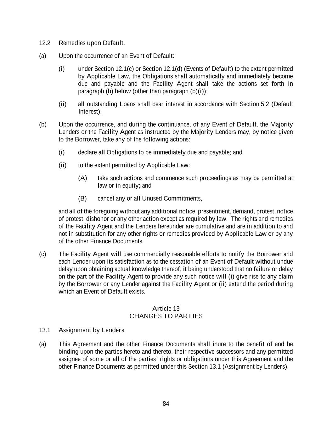 84 12.2 Remedies upon Default. (a) Upon the occurrence of an Event of Default: (i) under Section 12.1(c) or Section 12.1(d) (Events of Default) to the extent permitted by Applicable Law, the Obligations shall automatically and immediately become due and payable and the Facility Agent shall take the actions set forth in paragraph (b) below (other than paragraph (b)(i)); (ii) all outstanding Loans shall bear interest in accordance with Section 5.2 (Default Interest). (b) Upon the occurrence, and during the continuance, of any Event of Default, the Majority Lenders or the Facility Agent as instructed by the Majority Lenders may, by notice given to the Borrower, take any of the following actions: (i) declare all Obligations to be immediately due and payable; and (ii) to the extent permitted by Applicable Law: (A) take such actions and commence such proceedings as may be permitted at law or in equity; and (B) cancel any or all Unused Commitments, and all of the foregoing without any additional notice, presentment, demand, protest, notice of protest, dishonor or any other action except as required by law. The rights and remedies of the Facility Agent and the Lenders hereunder are cumulative and are in addition to and not in substitution for any other rights or remedies provided by Applicable Law or by any of the other Finance Documents. (c) The Facility Agent will use commercially reasonable efforts to notify the Borrower and each Lender upon its satisfaction as to the cessation of an Event of Default without undue delay upon obtaining actual knowledge thereof, it being understood that no failure or delay on the part of the Facility Agent to provide any such notice will (i) give rise to any claim by the Borrower or any Lender against the Facility Agent or (ii) extend the period during which an Event of Default exists. Article 13 CHANGES TO PARTIES 13.1 Assignment by Lenders. (a) This Agreement and the other Finance Documents shall inure to the benefit of and be binding upon the parties hereto and thereto, their respective successors and any permitted assignee of some or all of the parties’ rights or obligations under this Agreement and the other Finance Documents as permitted under this Section 13.1 (Assignment by Lenders).